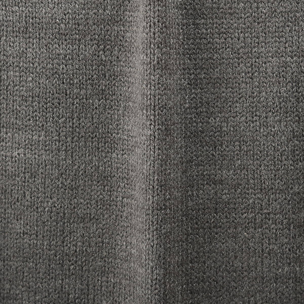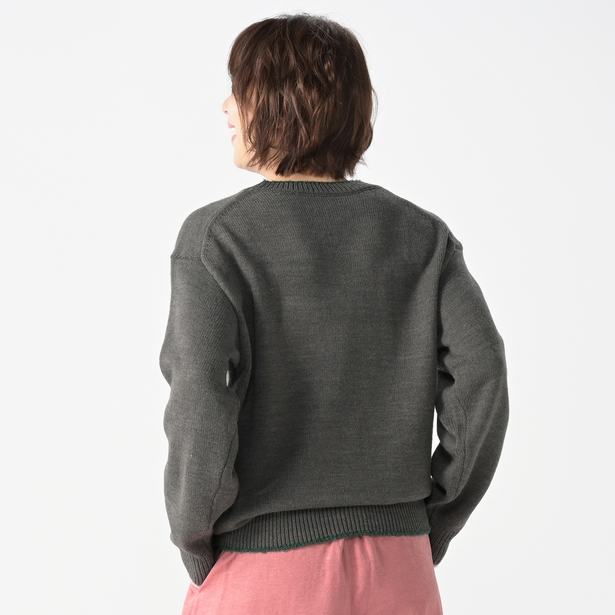 柄部分のみダブルジャガードで厚みを持たせ、他は程よい肉感の天竺編みで仕立てました。コートの下にも着やすく、えりと袖口、裾口のリブ編みが全体をすっきりまとめます