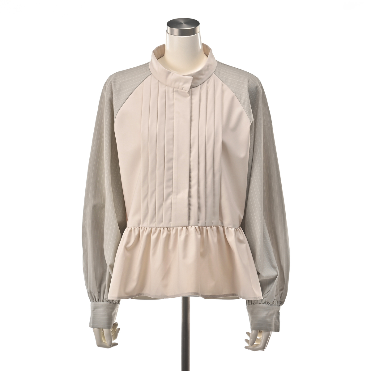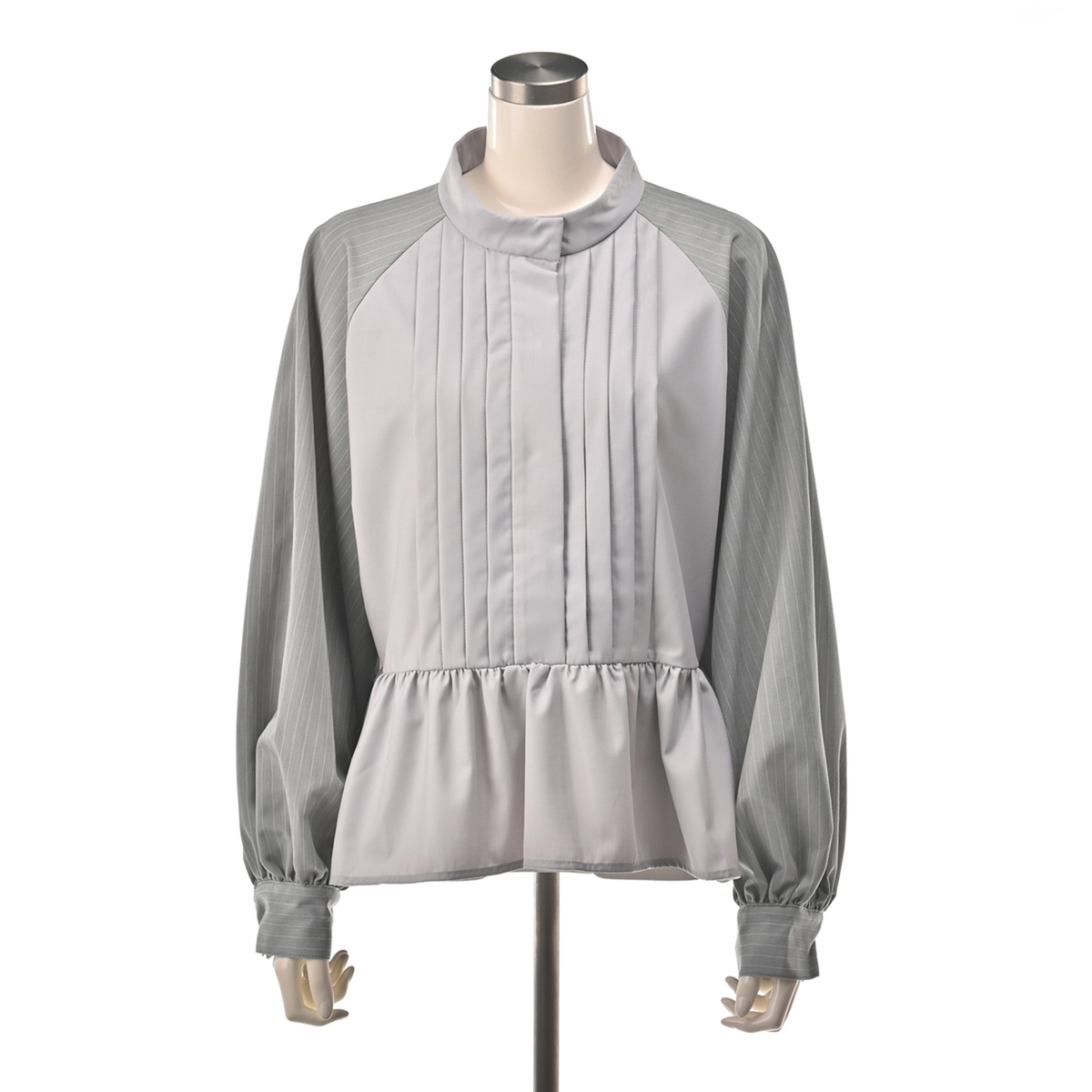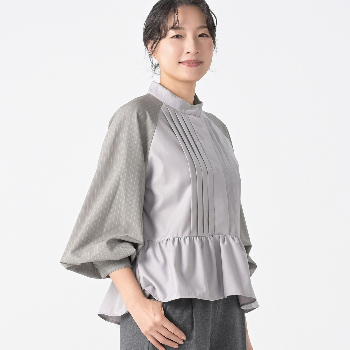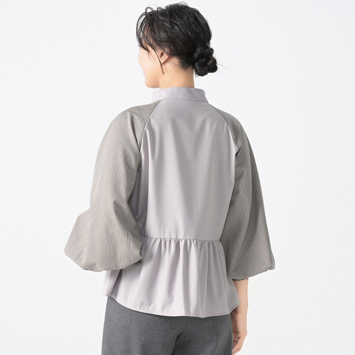 袖部分にストライプ生地をドッキングしたブラウス。身頃との絶妙な配色が、落ち着いた雰囲気の中にさりげない自己主張を添えます。ハイネックは首元をしっかりカバーし、ファンデーションが付きにくい高さにこだわったデザインです