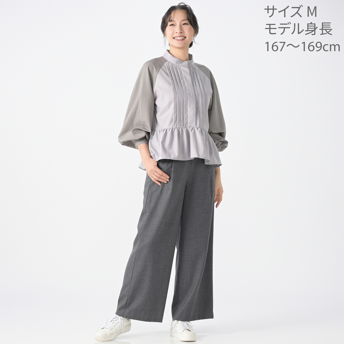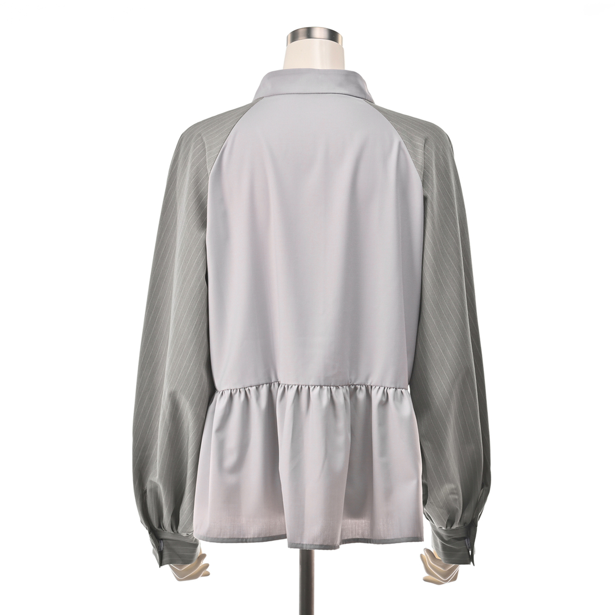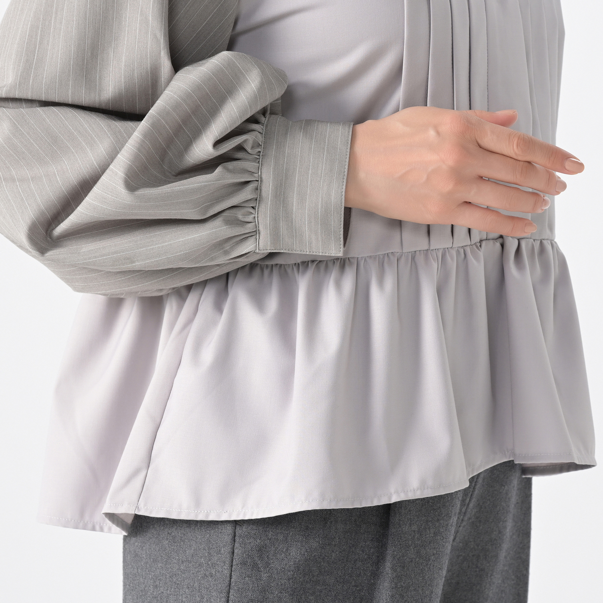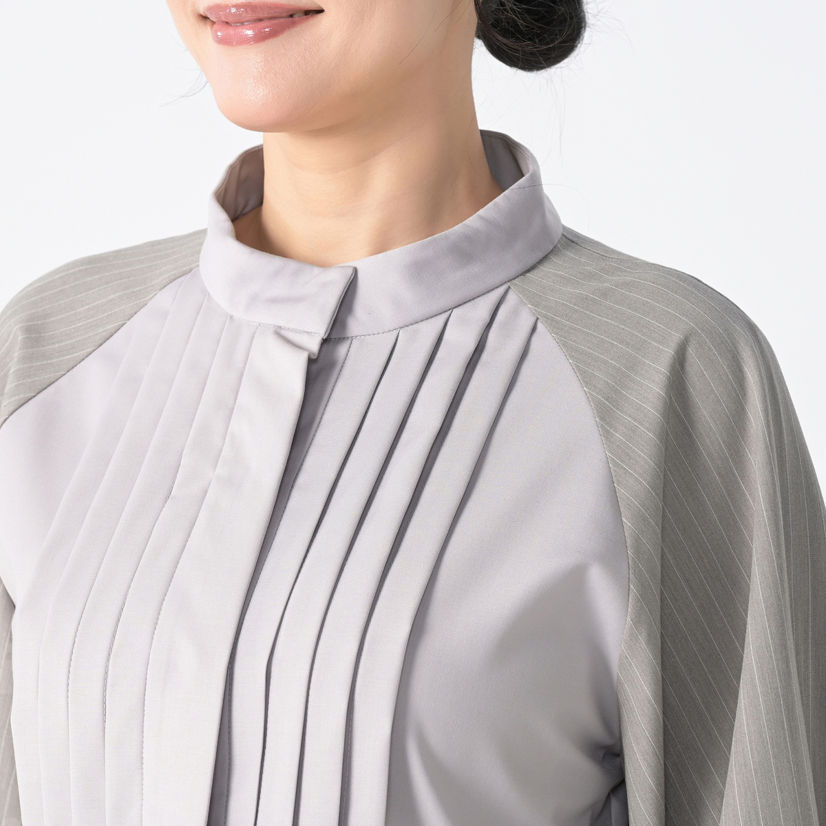 袖部分にストライプ生地をドッキングしたブラウス。身頃との絶妙な配色が、落ち着いた雰囲気の中にさりげない自己主張を添えます。ハイネックは首元をしっかりカバーし、ファンデーションが付きにくい高さにこだわったデザインです