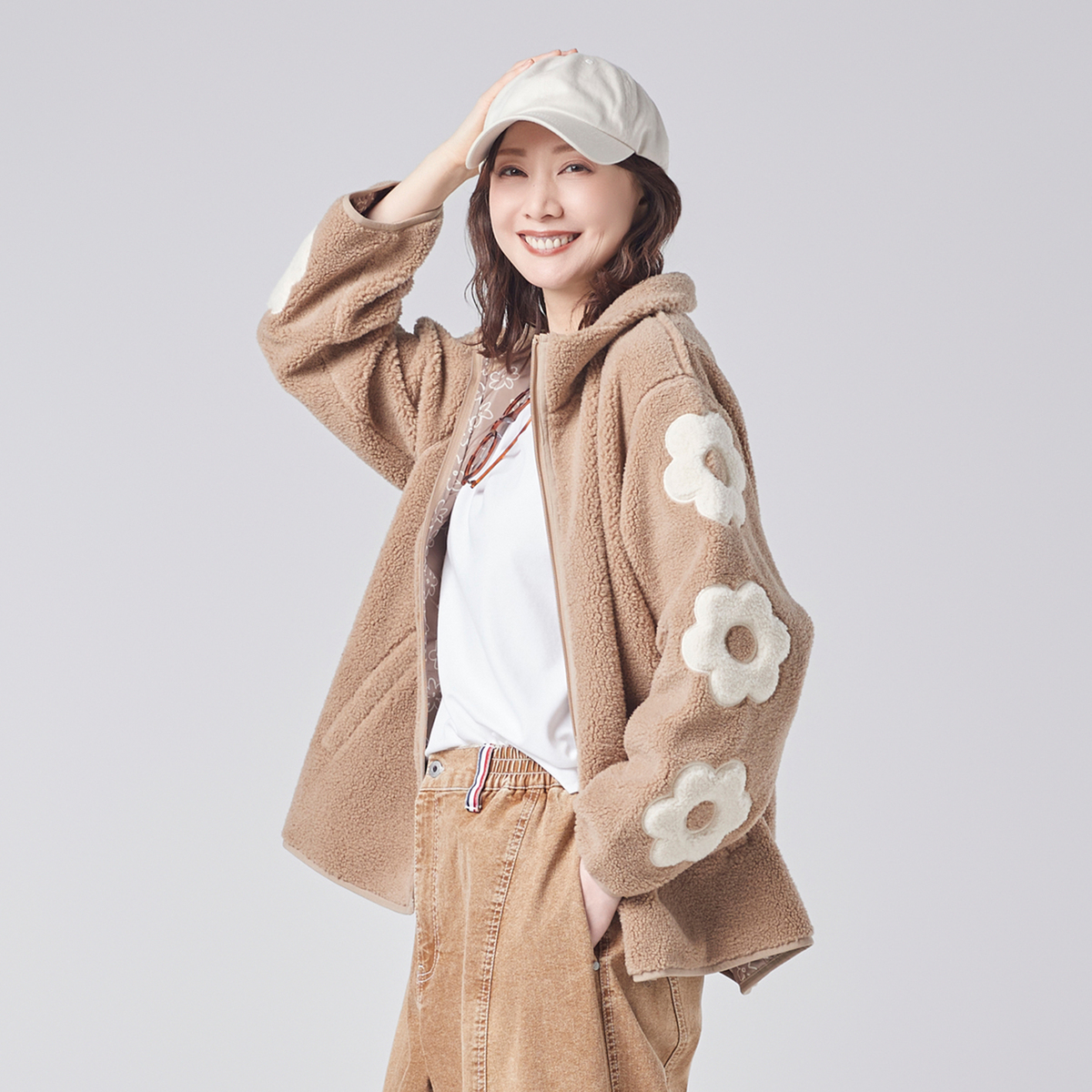 両袖に施された花のアップリケが目を引く、季節感たっぷりのボアブルゾン。しっかりと厚みのあるボア素材を使用しており、スタンドカラーが首元を包み込んで冷たい風をしっかりガード。見た目の可愛らしさだけでなく、防寒性も兼ね備えた一枚です