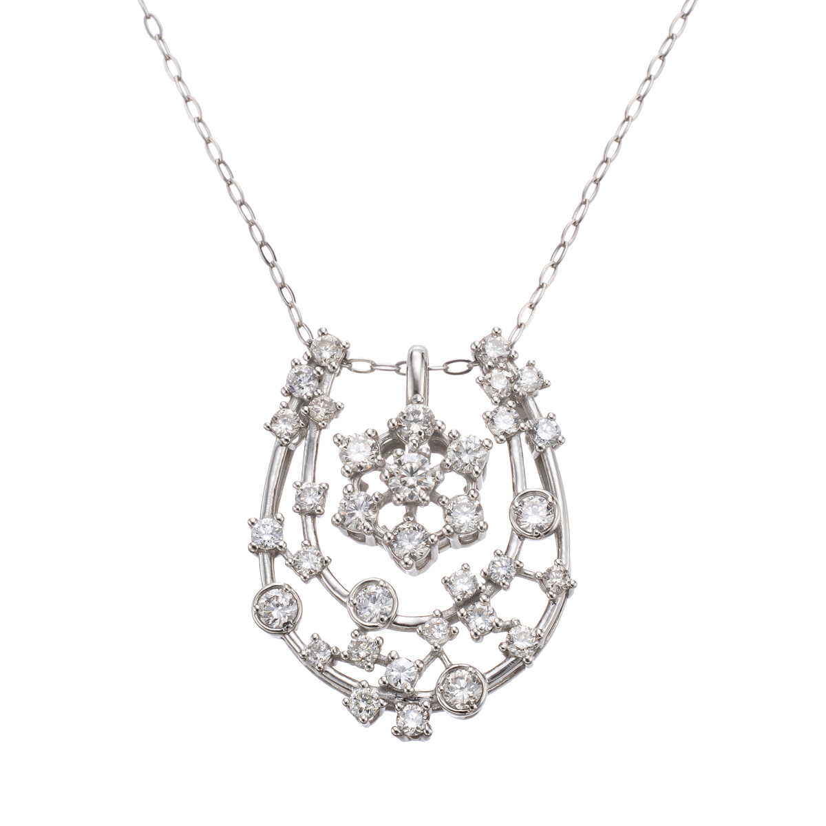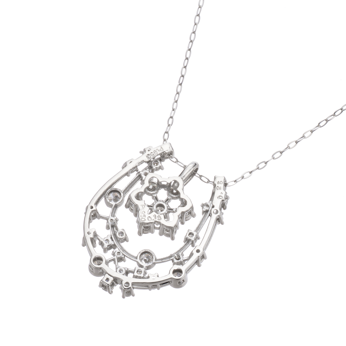 素材:[ダイヤモンド] <ラウンドモチーフ> ラウンドブリリアントカット 爪留め 7石 合計0.13ctUP <馬蹄> ラウンドブリリアントカット 爪留め 27石 合計0.25ctUP 34石合計0.38ctUP 総重量(約) 1.9g 長さ(約) 45.0cm バチカンの内径(約) 馬蹄:3.7×0.7mm ラウンド:2.8×1.5mm 幅(約) 0.7mm チェーンの形状 アズキ 留具の形状 引き輪 アジャスターの有無 有(スライド式) チェーンの取り外し 可 ヘッドの縦×横(約) 馬蹄:17.0×13.0mm ラウンド:9.5×6.0mm [地金] プラチナ950(本体)、プラチナ900(一部) ■素材の大きさ・形・色合い、製品のサイズは1点1点多少異なります 【日本製】