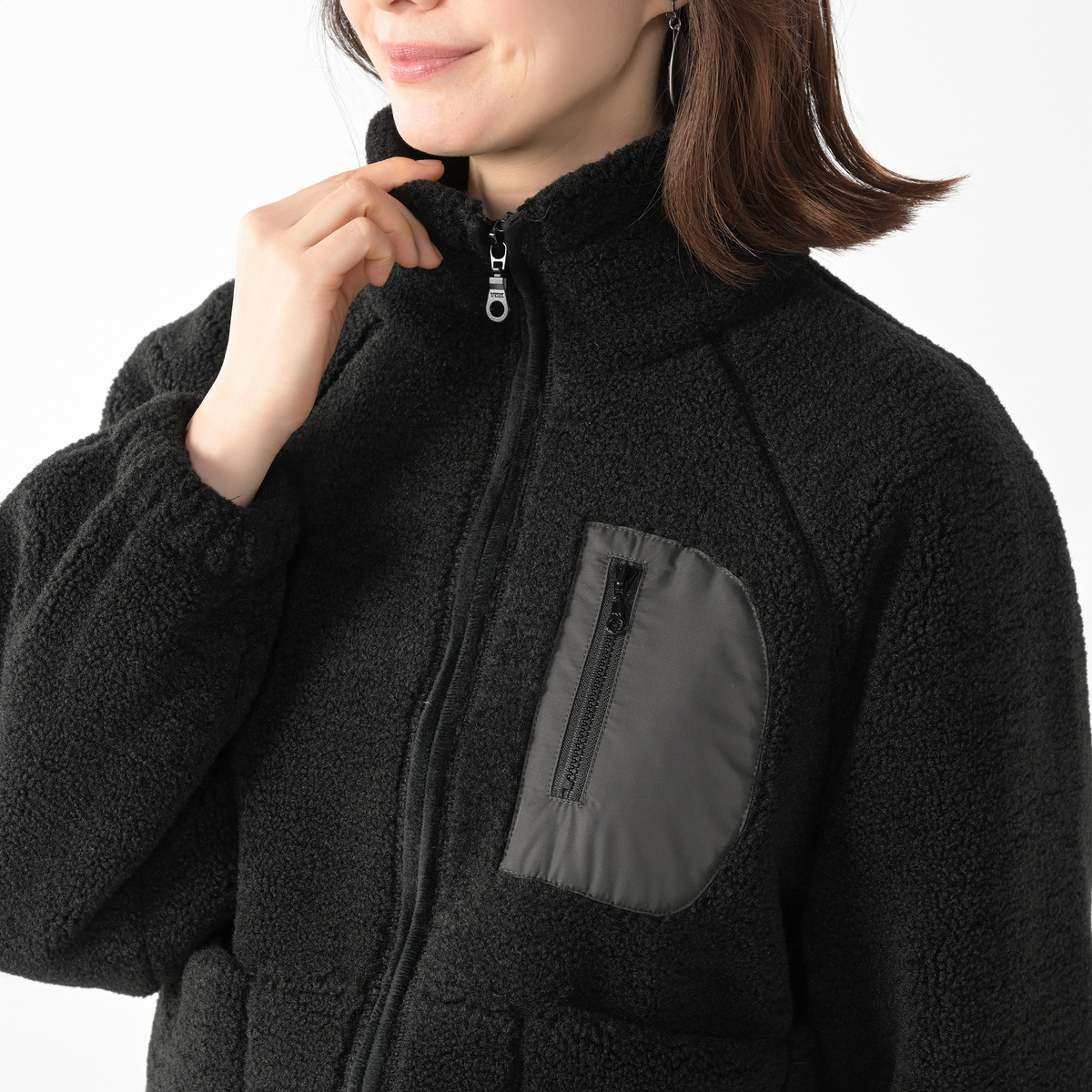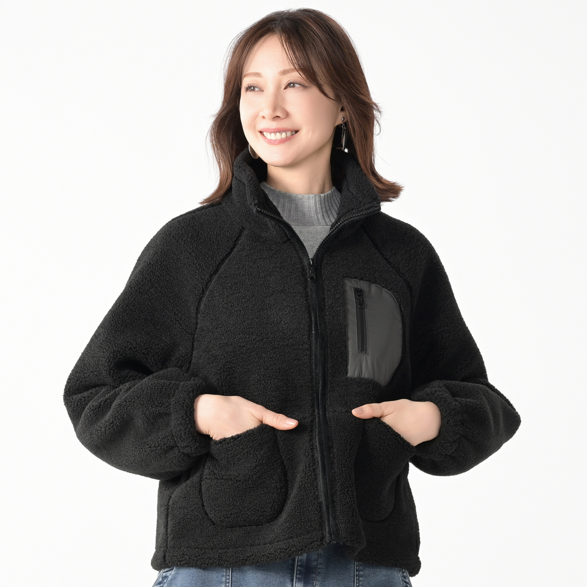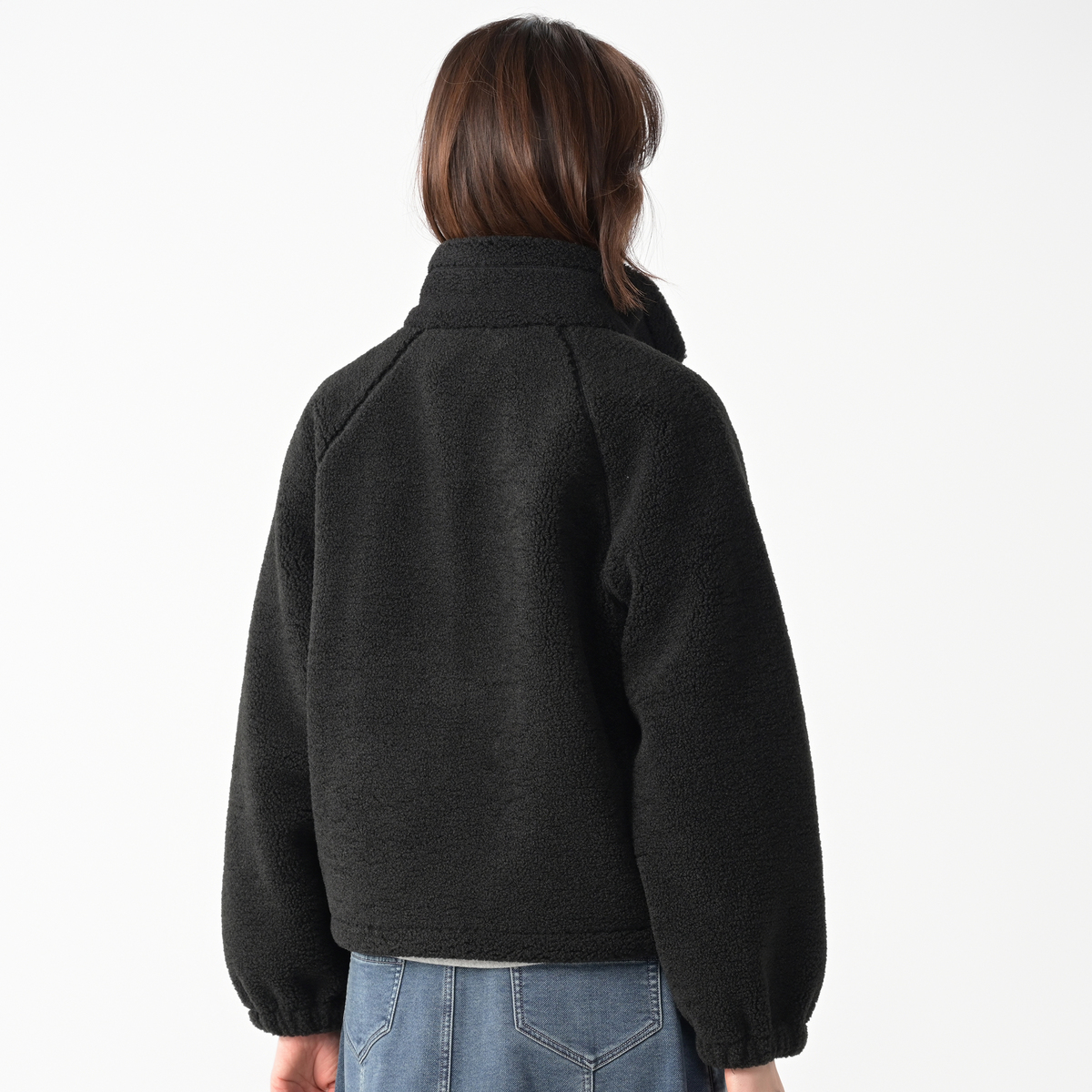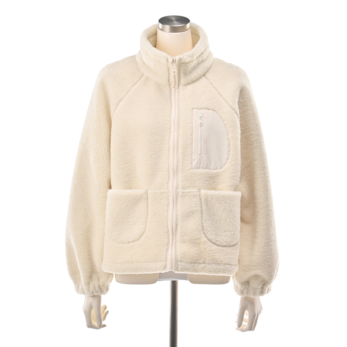 スタンド衿のボアブルゾン。ボアと毛足のあるニットをボンディングした素材で、冬の羽織として様々なボトムスとの組合せに活躍します