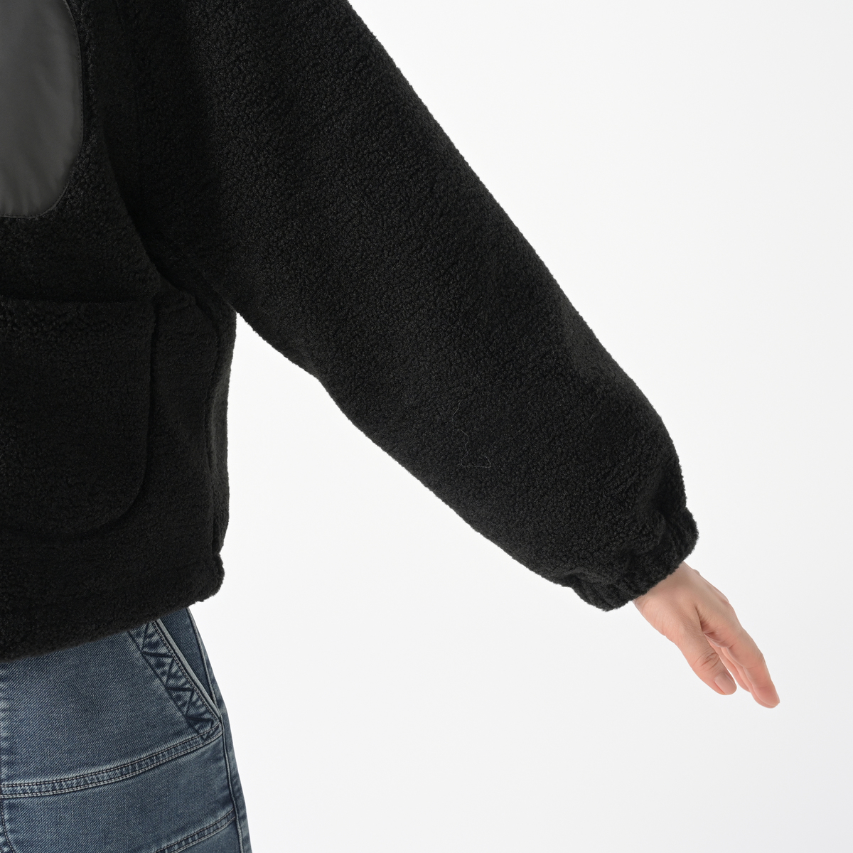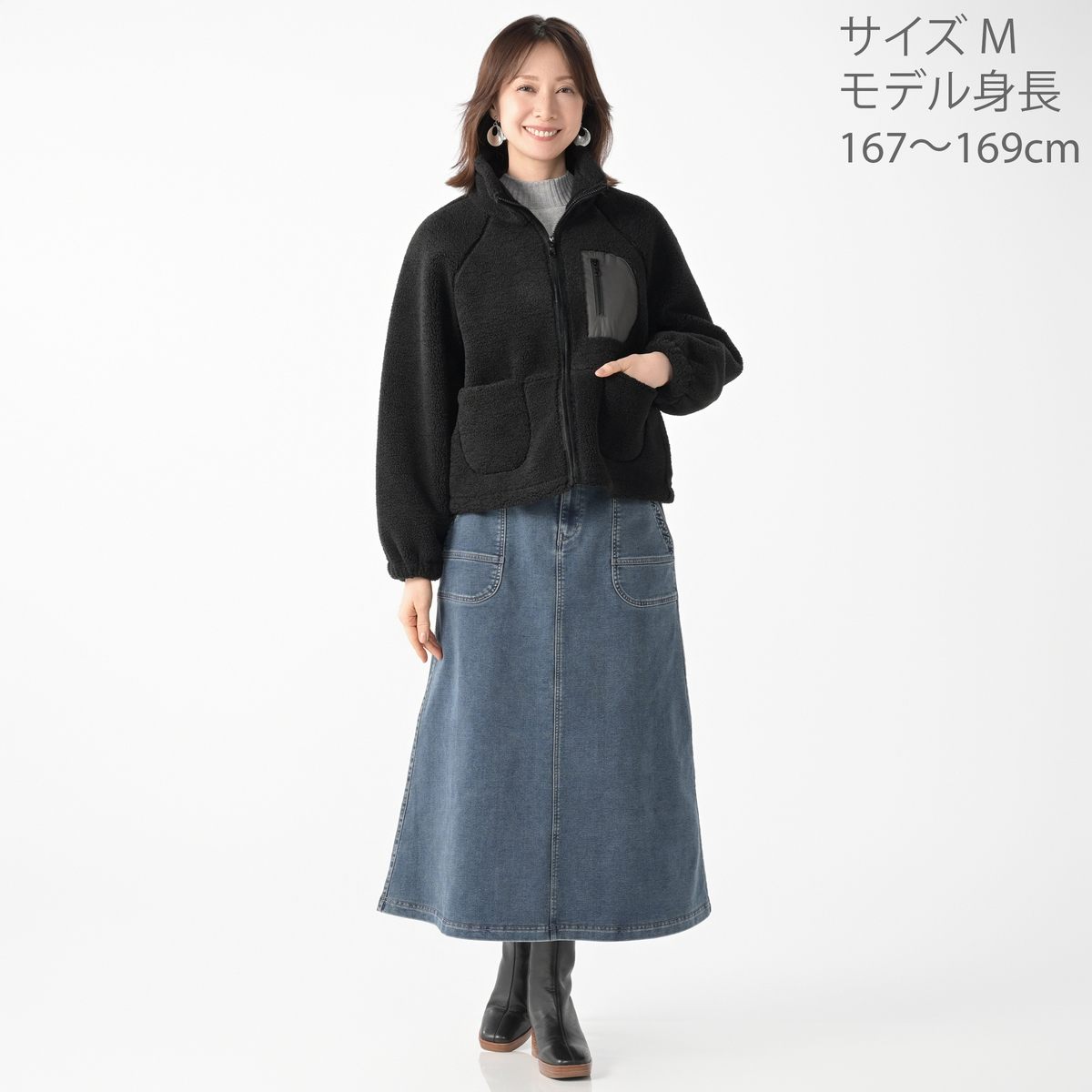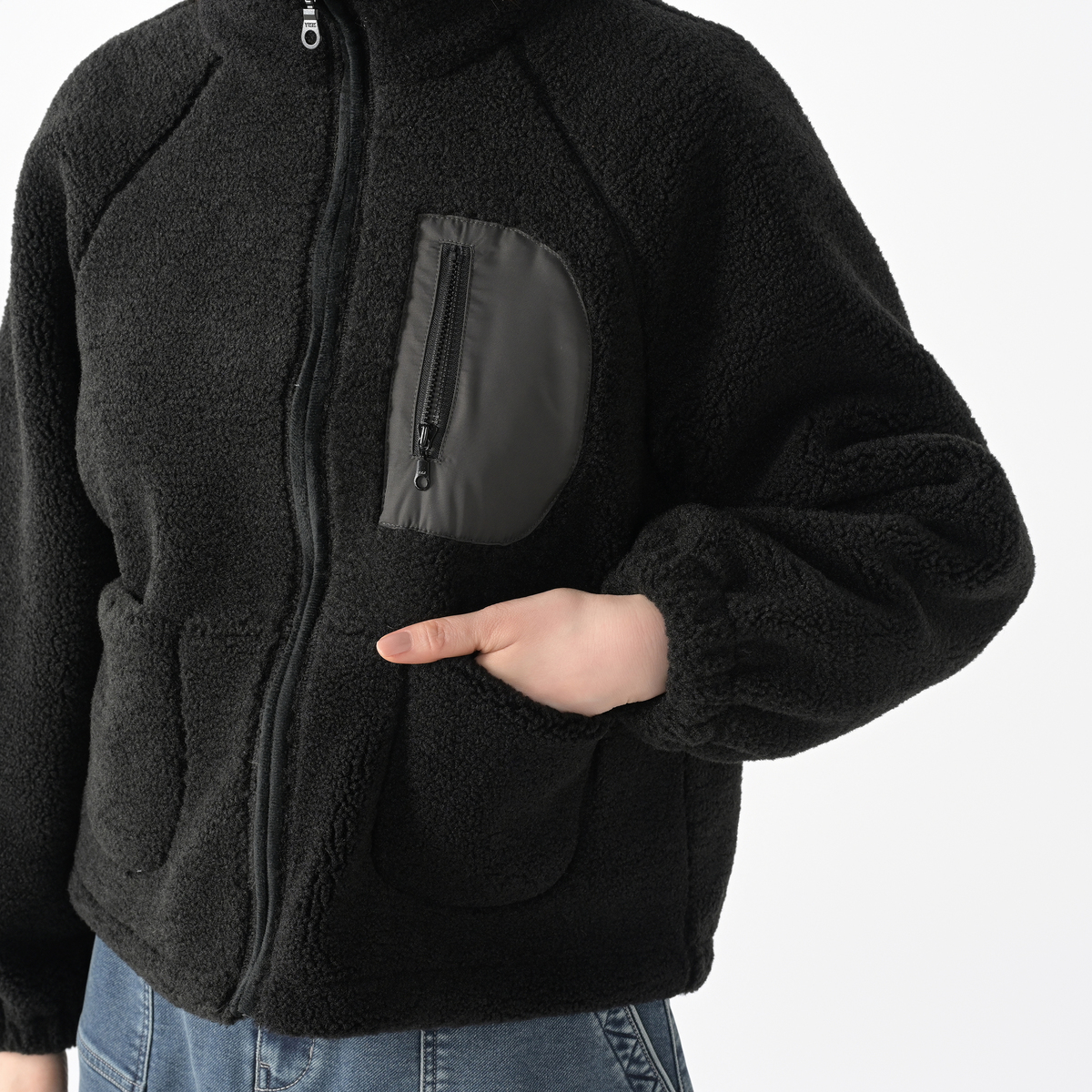 スタンド衿のボアブルゾン。ボアと毛足のあるニットをボンディングした素材で、冬の羽織として様々なボトムスとの組合せに活躍します