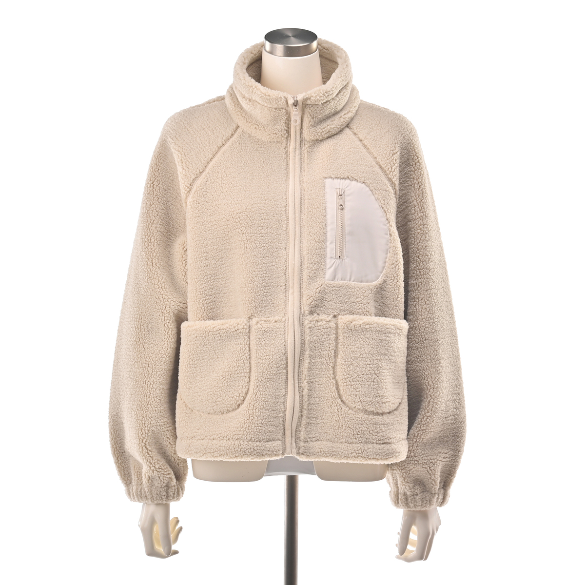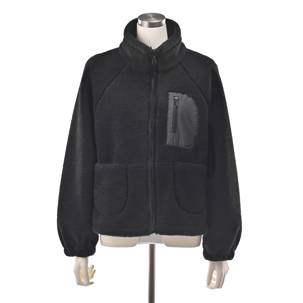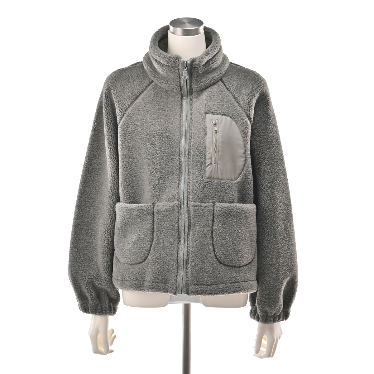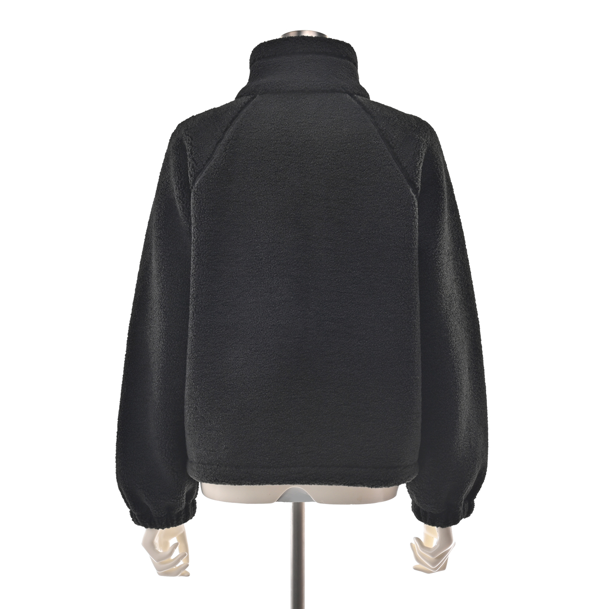 スタンド衿のボアブルゾン。ボアと毛足のあるニットをボンディングした素材で、冬の羽織として様々なボトムスとの組合せに活躍します