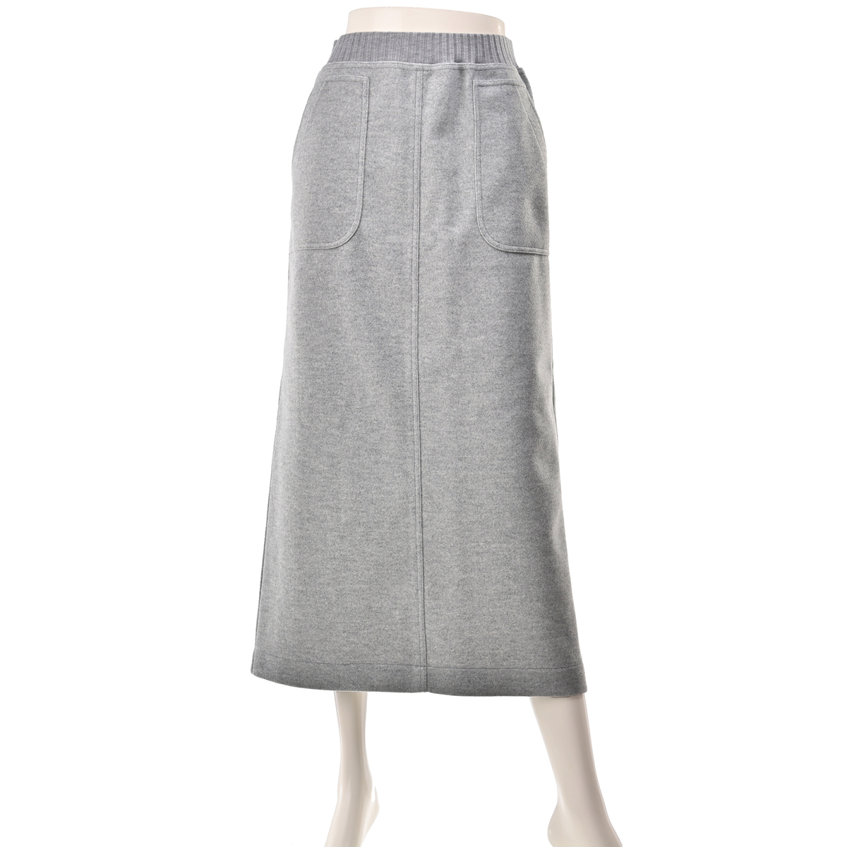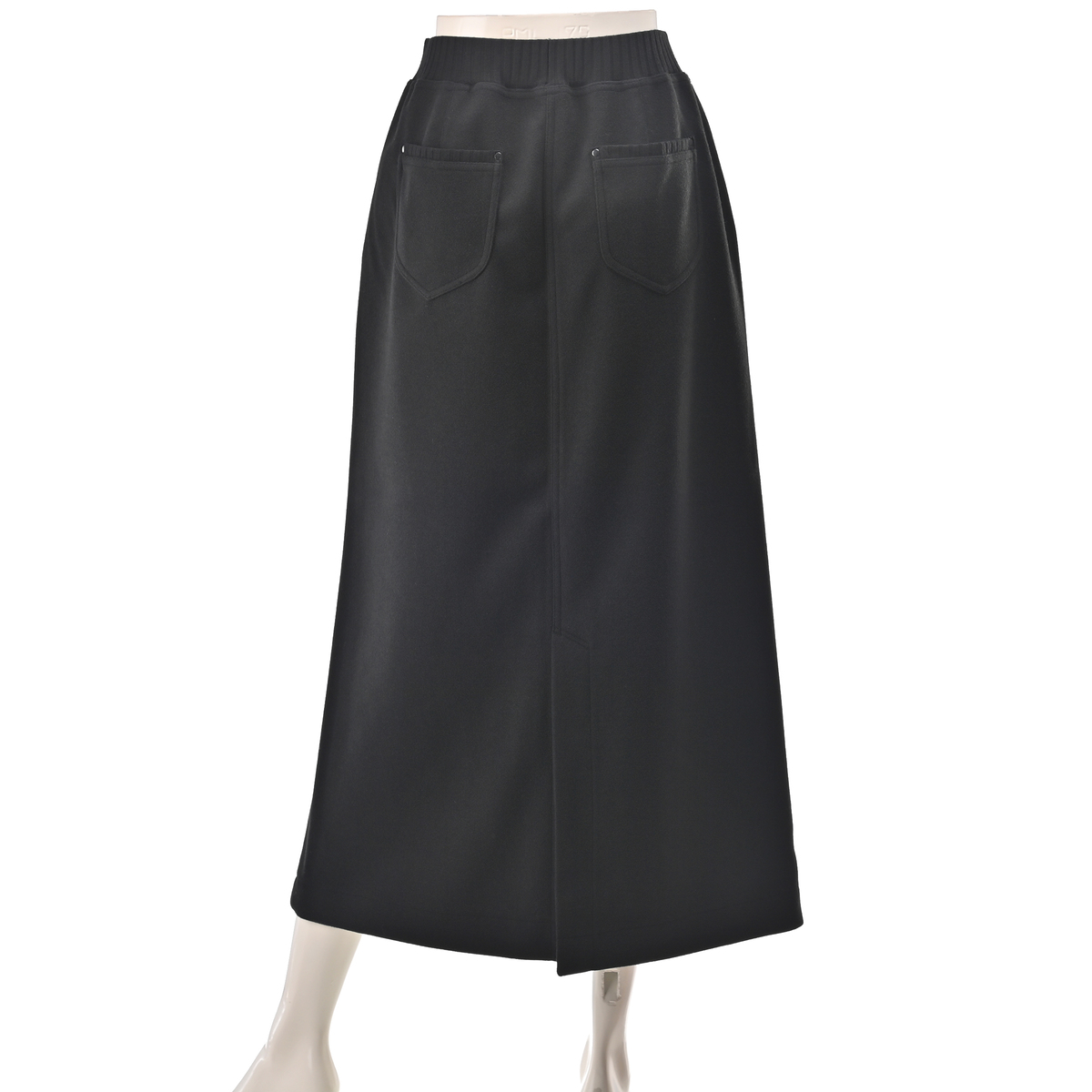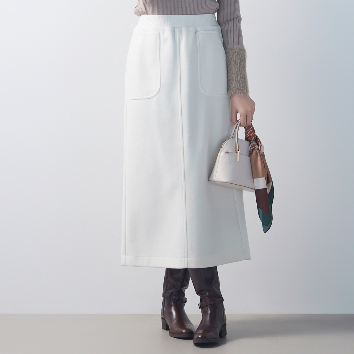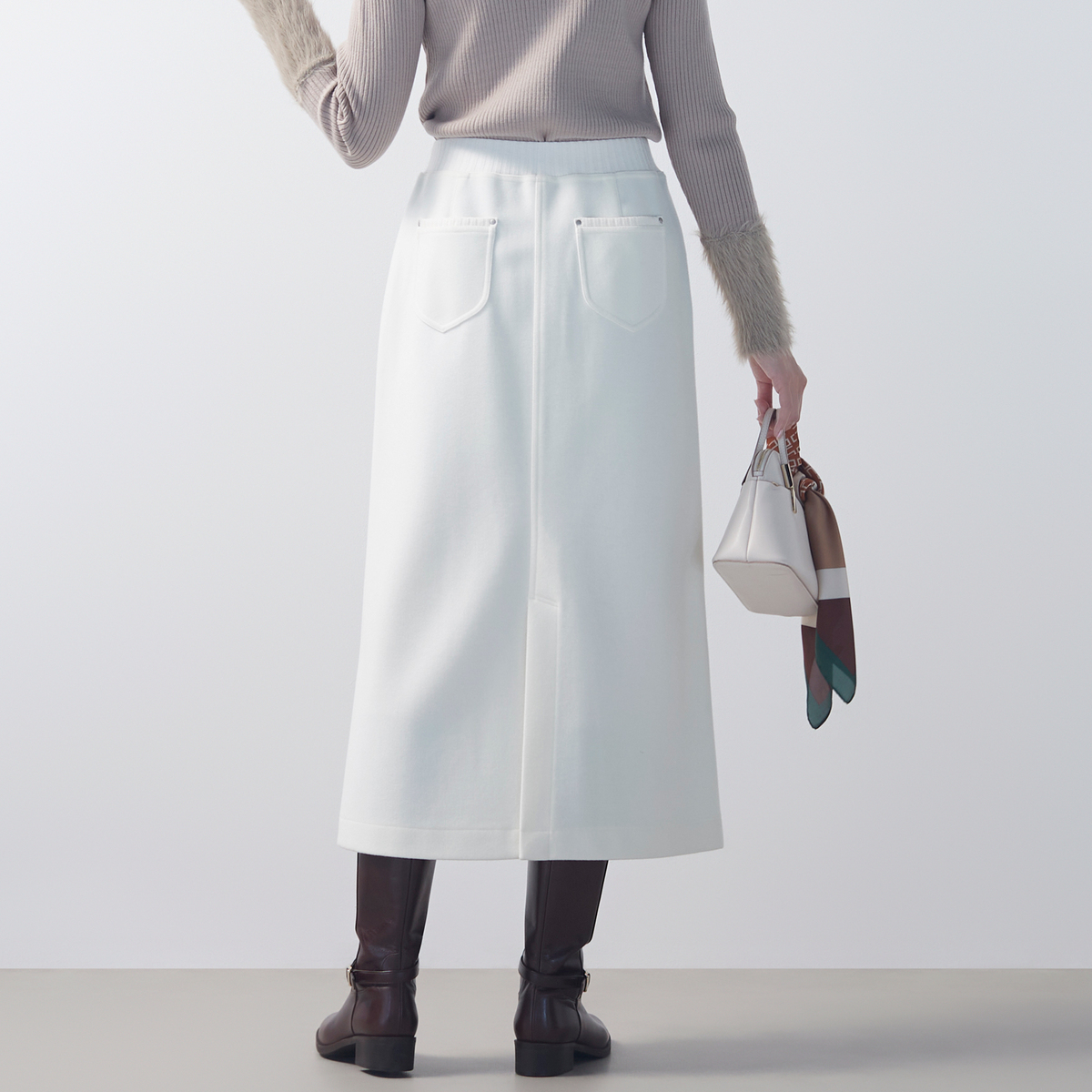 合わせ易いシンプルなロングタイトスカート。ウォーム感のある生地と柔らかいリブニットの組合せで仕立てています。後ろ中心裾はベンツ仕様で、前後にアウトポケットを付け、デザイン性を出しています。ウエスト部分と後ろポケット口はリブニット使いです