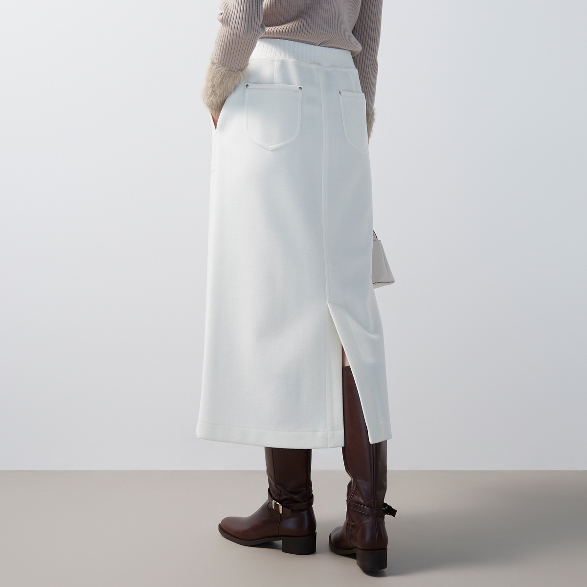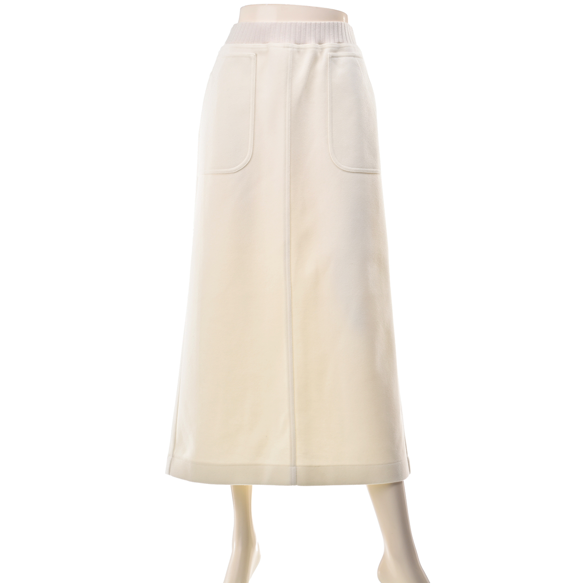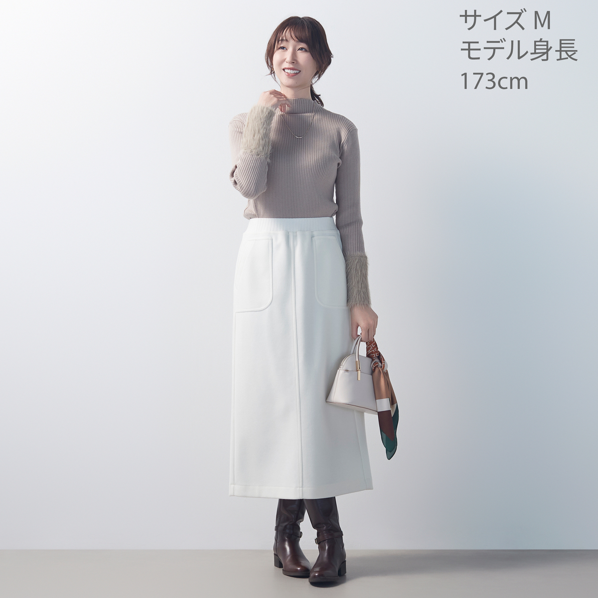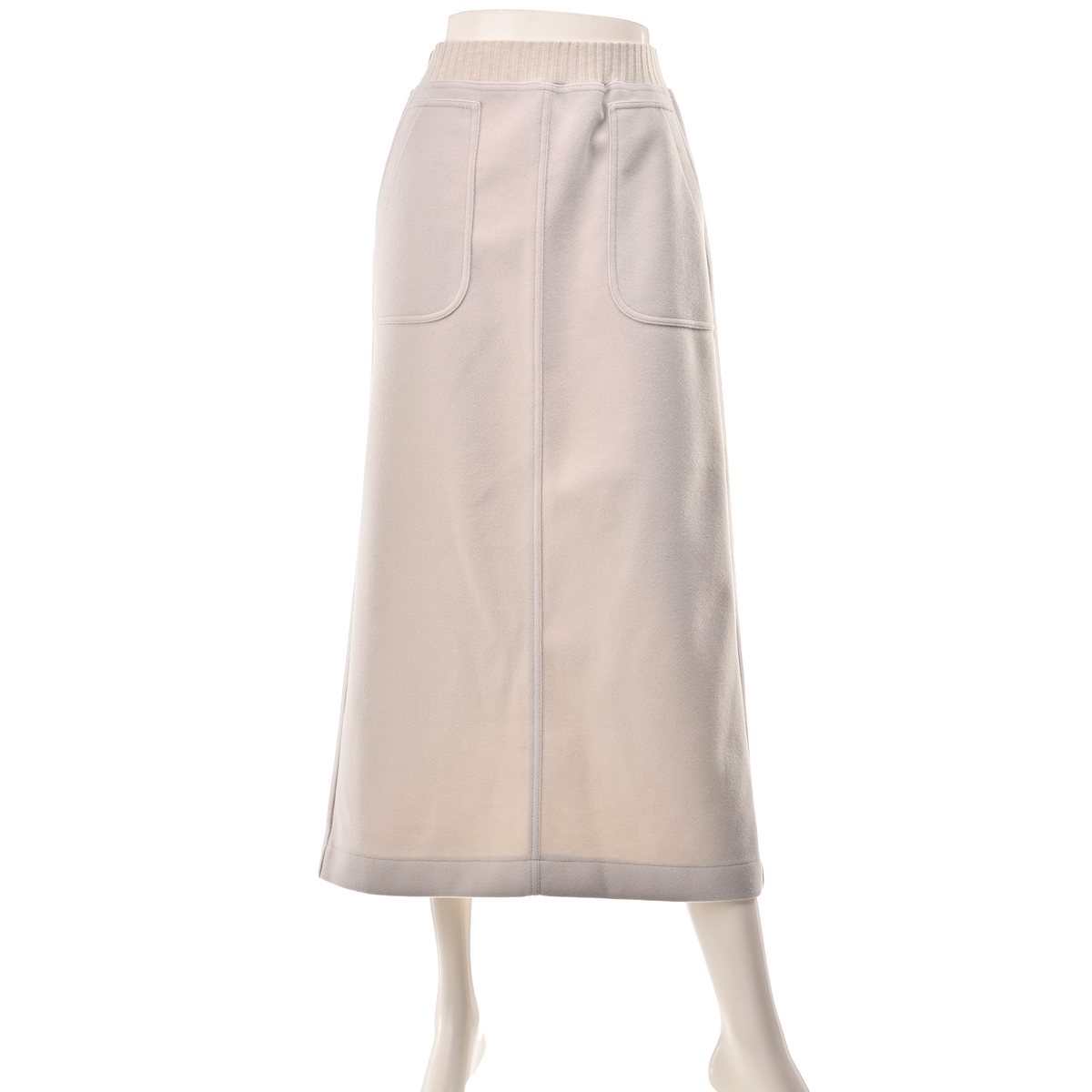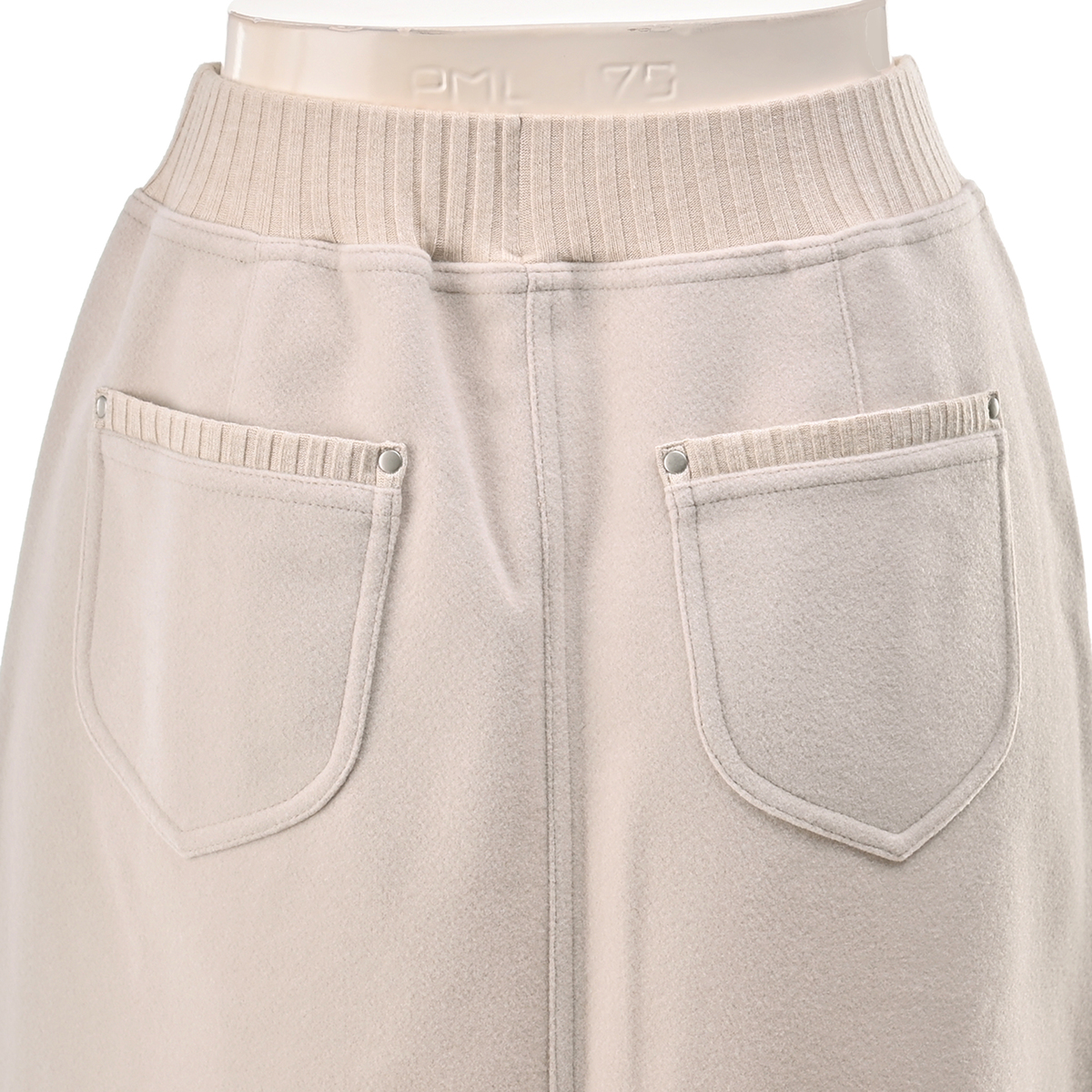 合わせ易いシンプルなロングタイトスカート。ウォーム感のある生地と柔らかいリブニットの組合せで仕立てています。後ろ中心裾はベンツ仕様で、前後にアウトポケットを付け、デザイン性を出しています。ウエスト部分と後ろポケット口はリブニット使いです