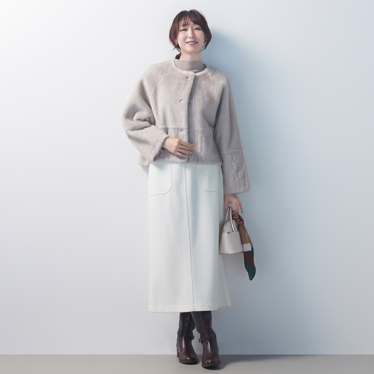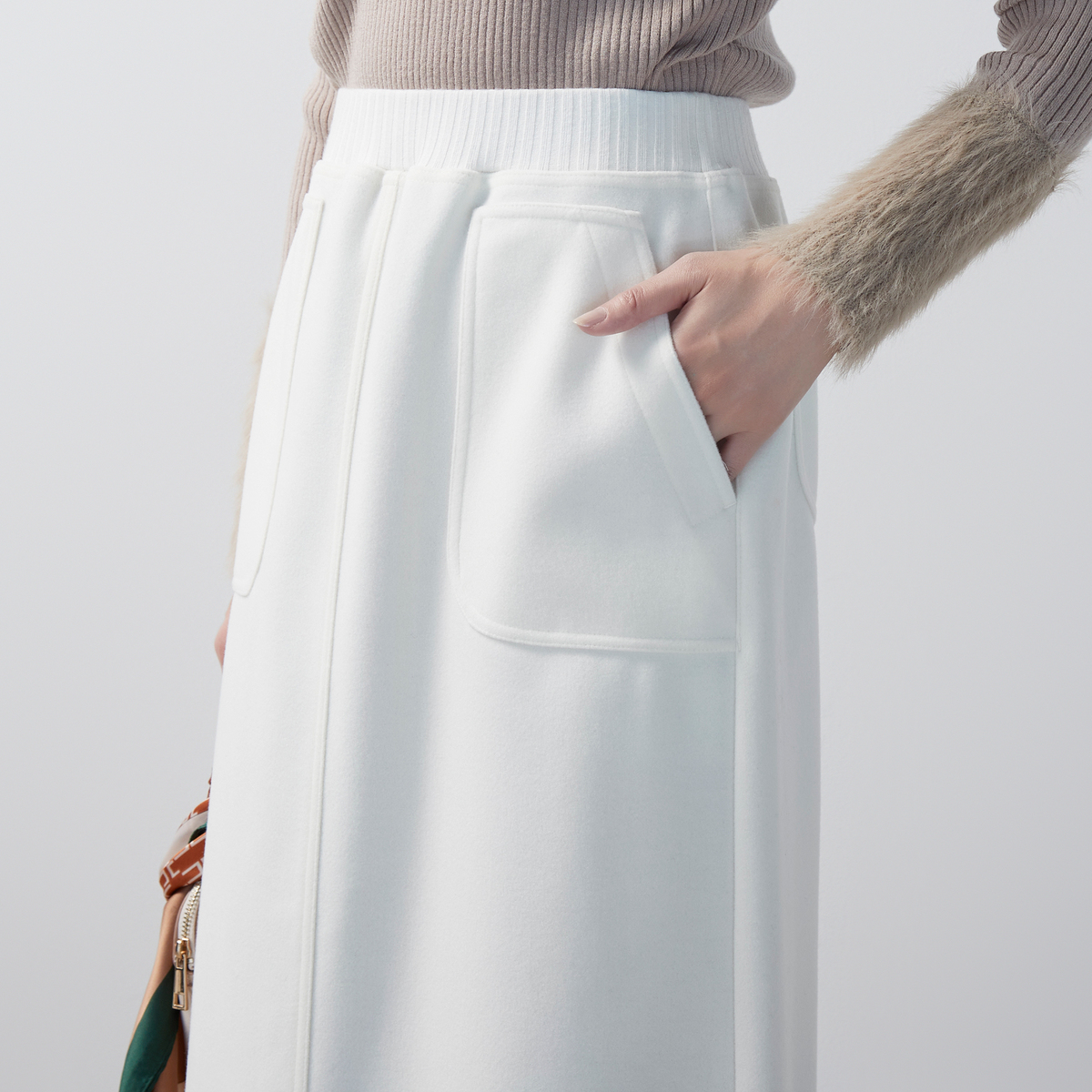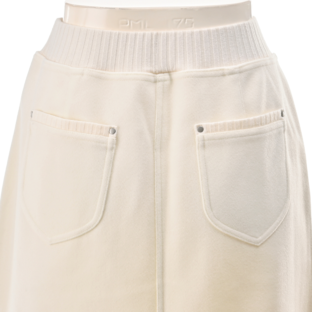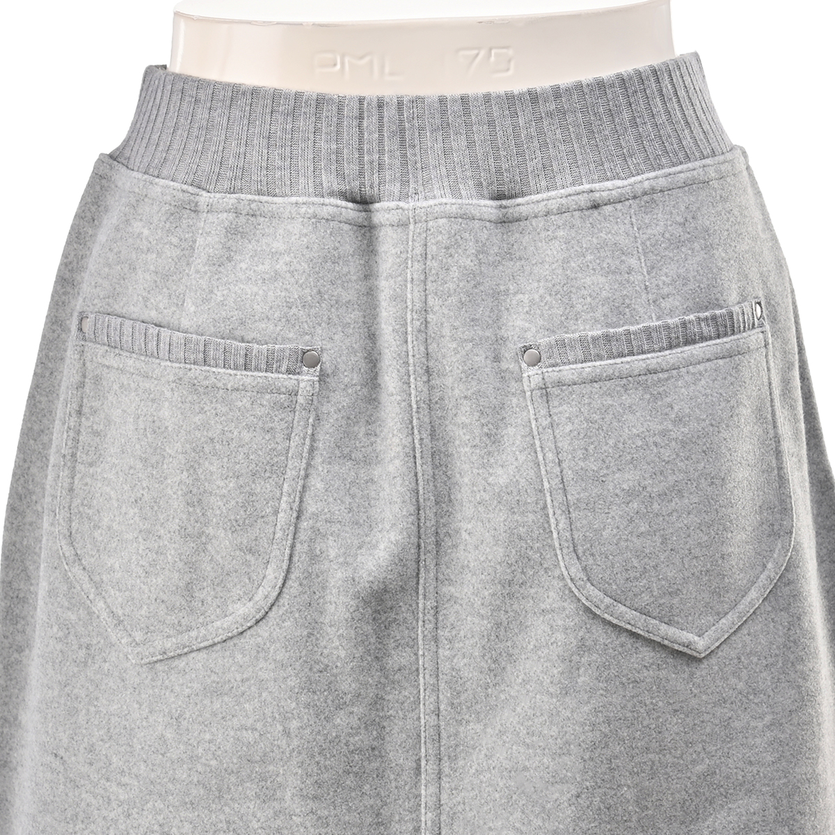 合わせ易いシンプルなロングタイトスカート。ウォーム感のある生地と柔らかいリブニットの組合せで仕立てています。後ろ中心裾はベンツ仕様で、前後にアウトポケットを付け、デザイン性を出しています。ウエスト部分と後ろポケット口はリブニット使いです