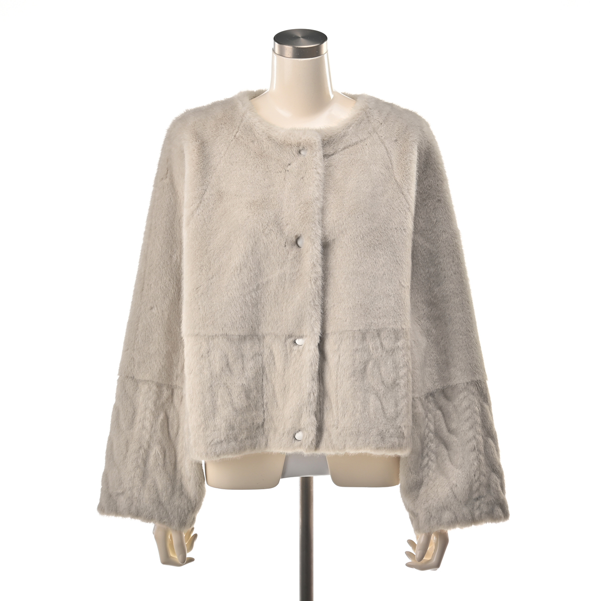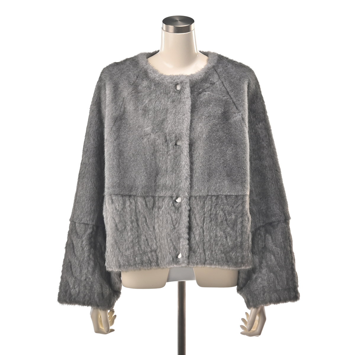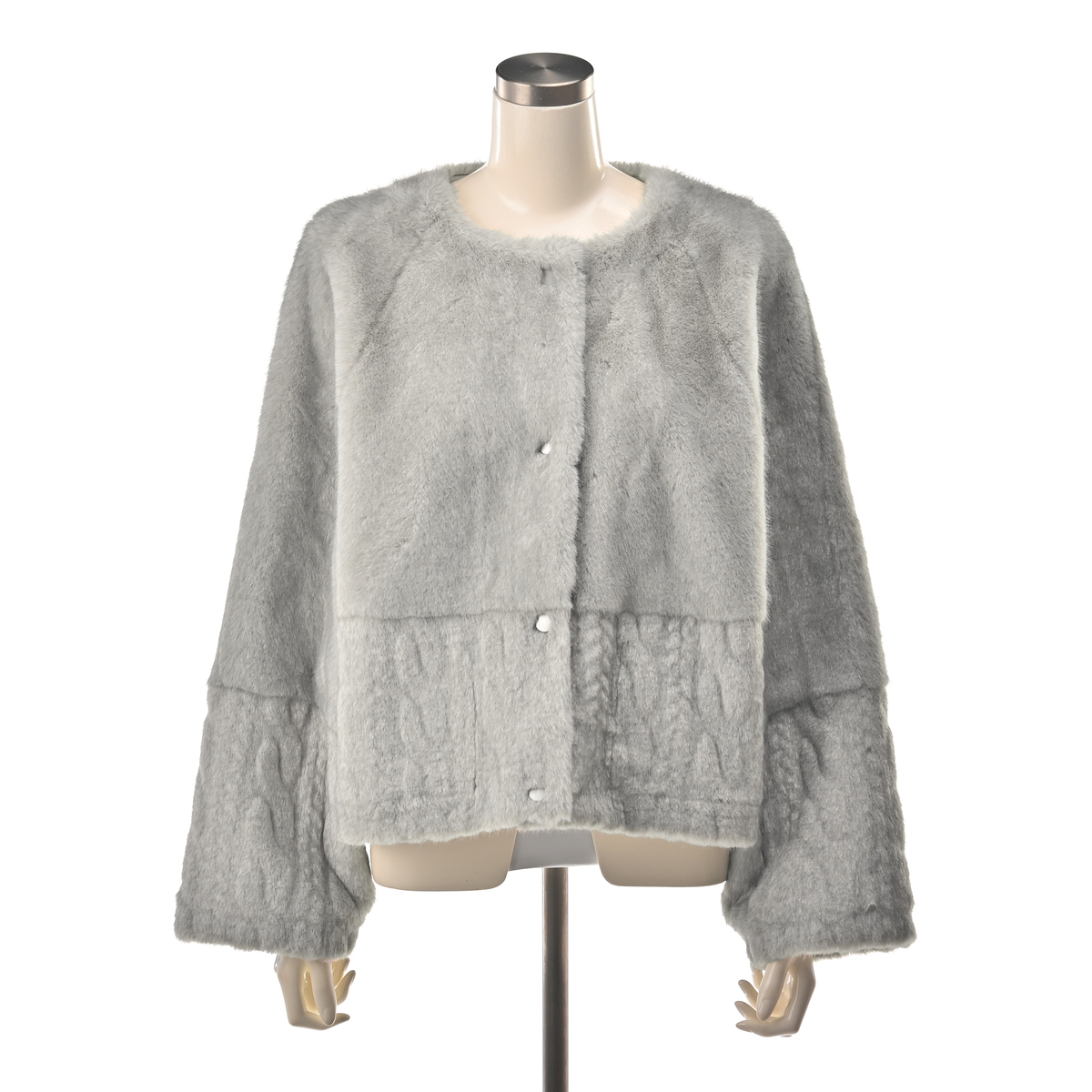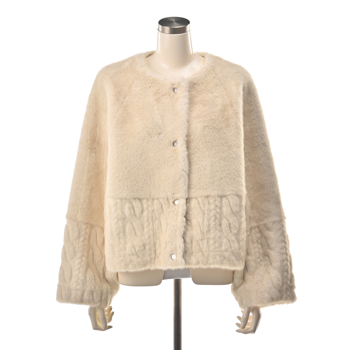 フェイクファーとケーブル編み模様の型押し生地を組合せた、ノーカラージャケットです。裏面にはフェイクスエードをボンディングし、リバーシブル仕様に。気分やコーディネートに合わせて両面楽しめます