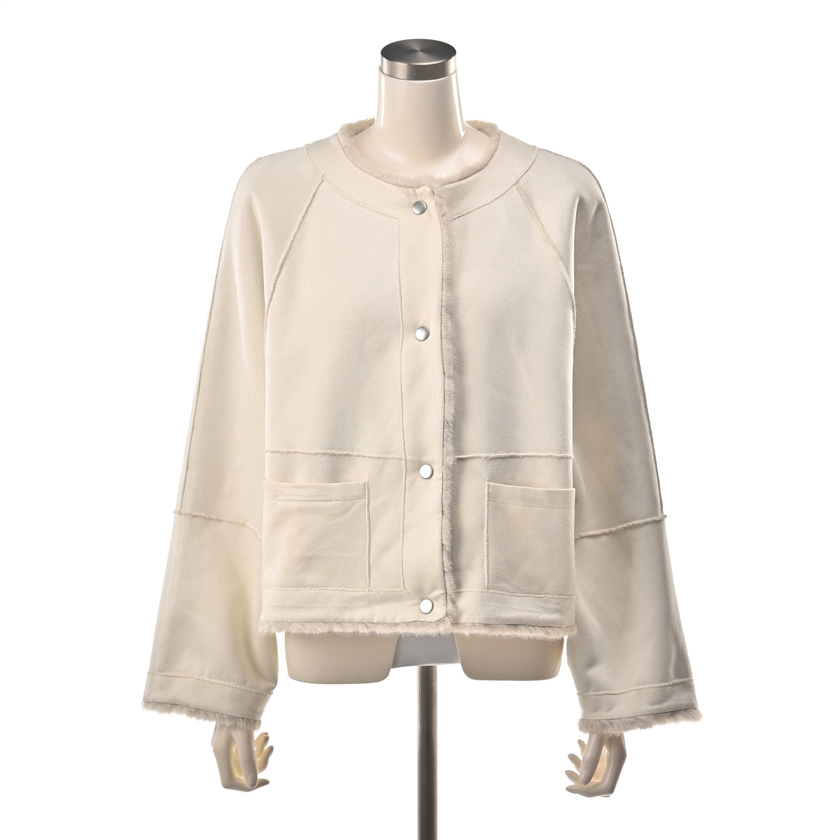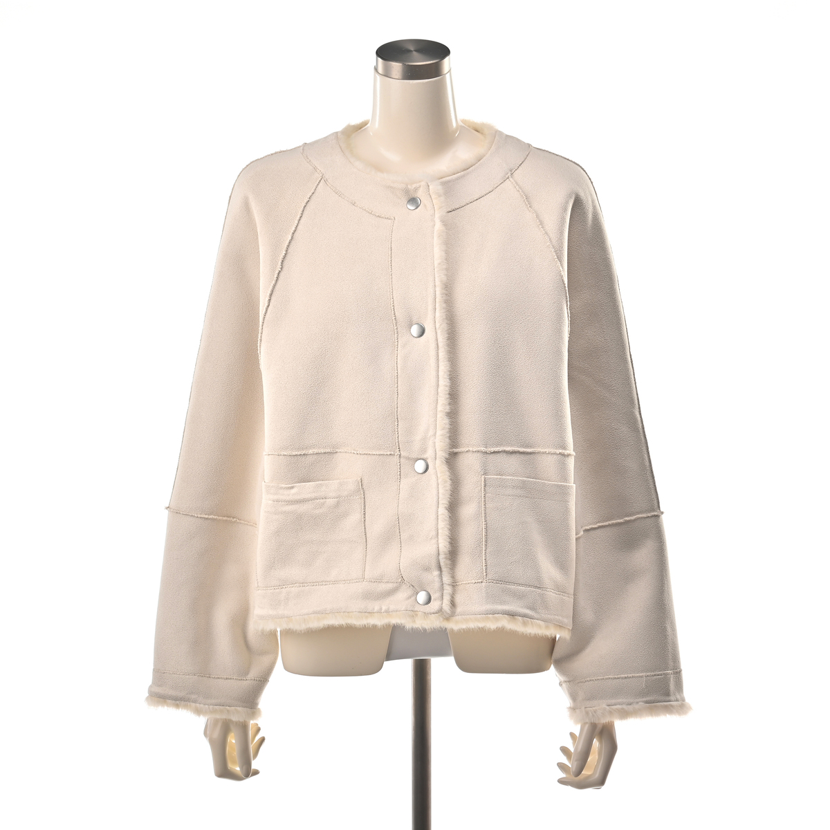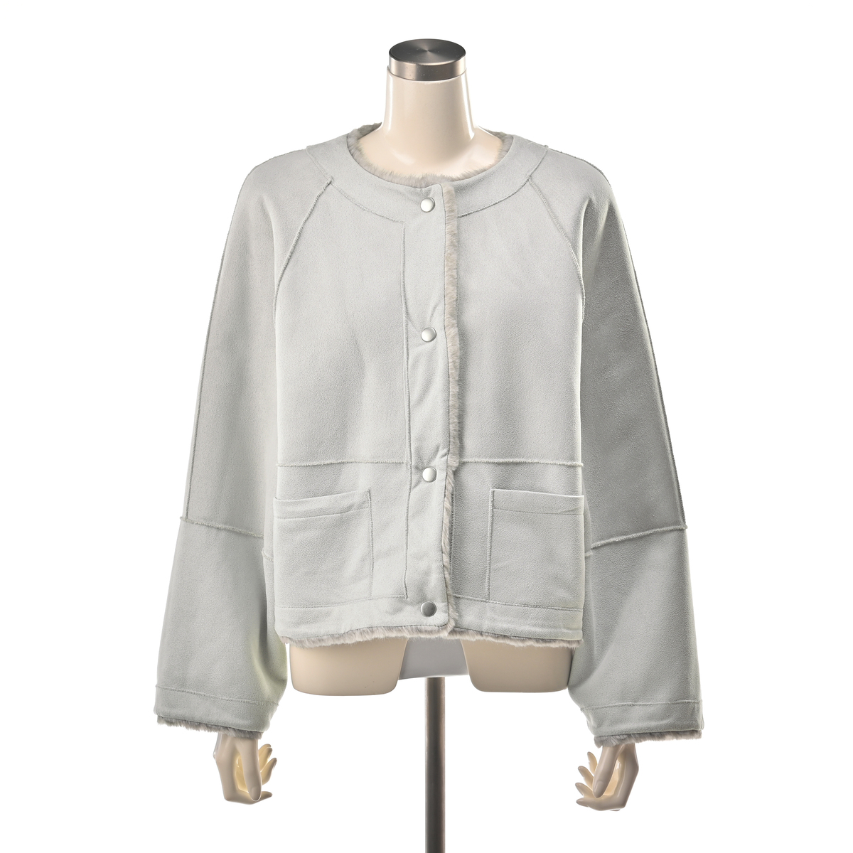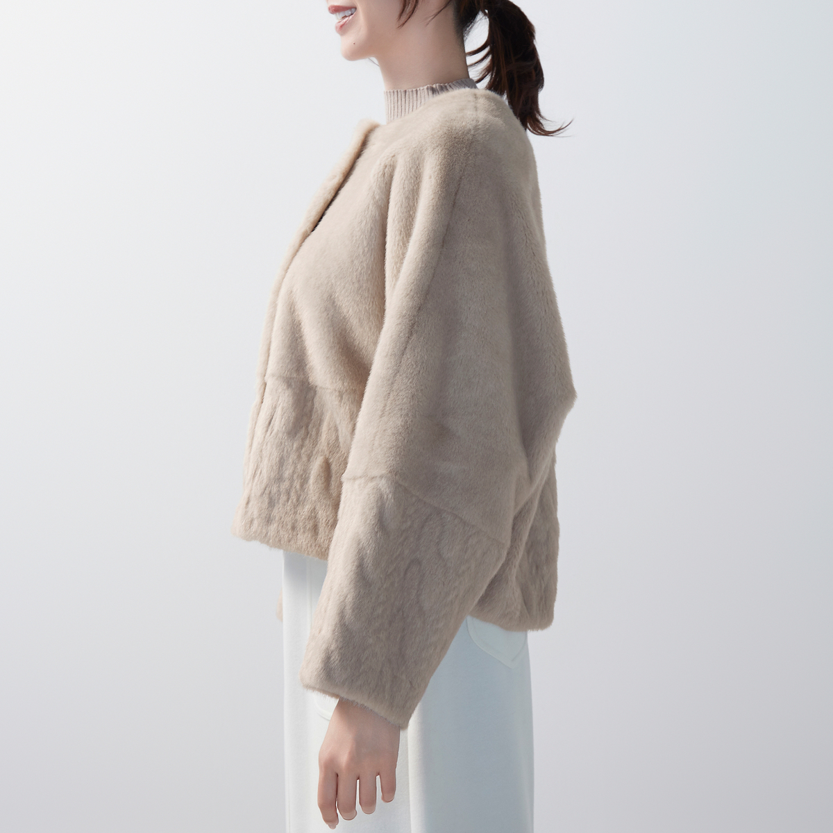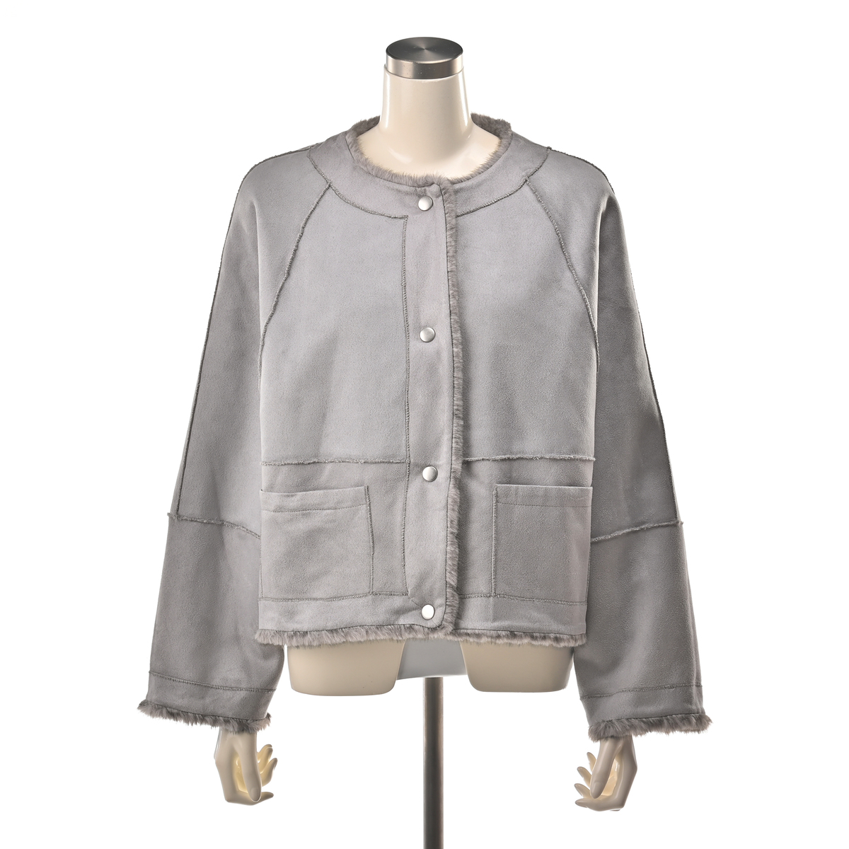 フェイクファーとケーブル編み模様の型押し生地を組合せた、ノーカラージャケットです。裏面にはフェイクスエードをボンディングし、リバーシブル仕様に。気分やコーディネートに合わせて両面楽しめます