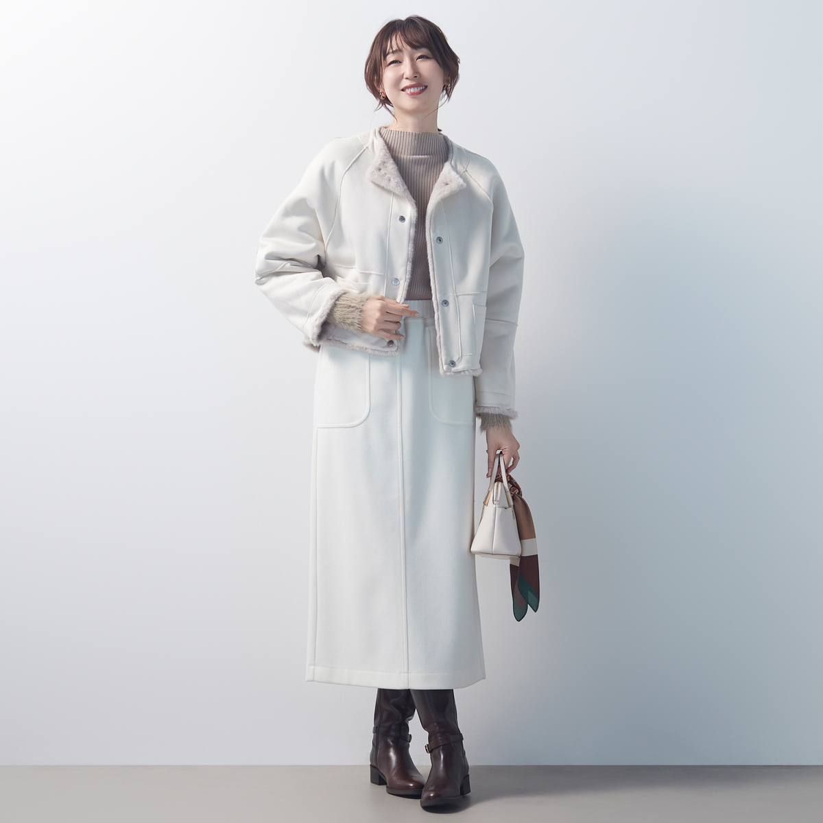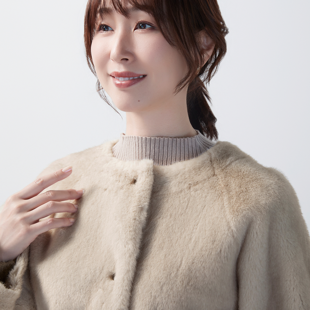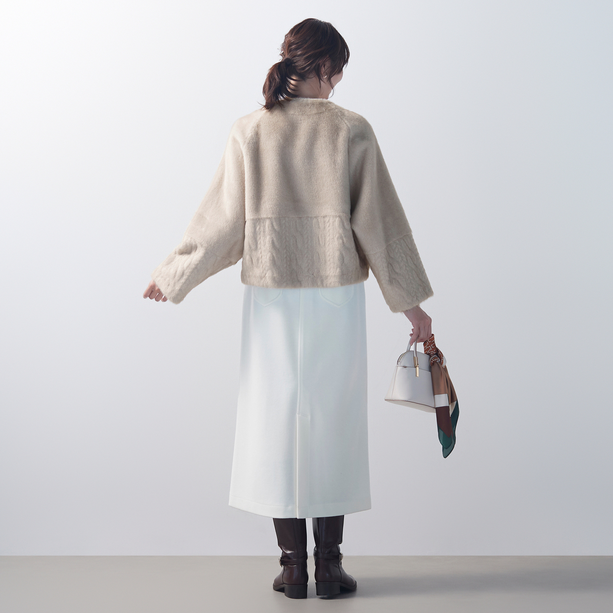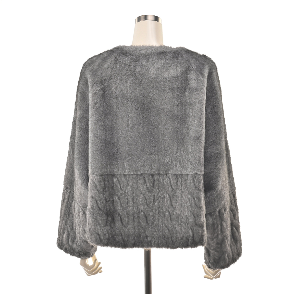 フェイクファーとケーブル編み模様の型押し生地を組合せた、ノーカラージャケットです。裏面にはフェイクスエードをボンディングし、リバーシブル仕様に。気分やコーディネートに合わせて両面楽しめます