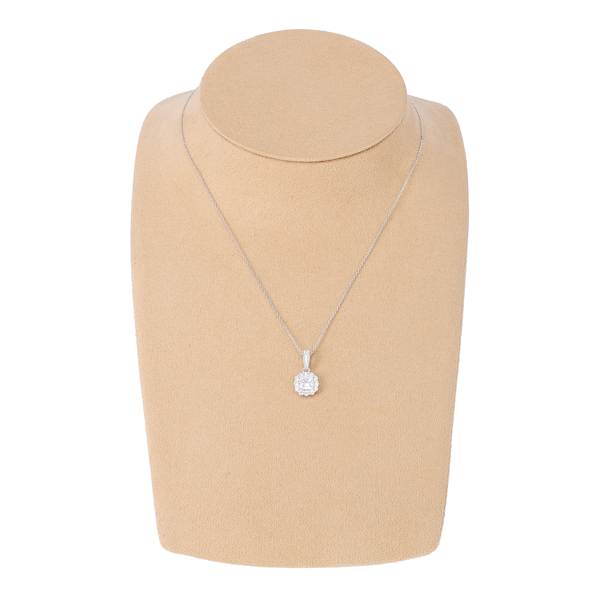大粒のクッションカットのダイヤモニーククリアCZが胸元で存在感を放つペンダント。ラウンドカットのダイヤモニーククリアCZで取り巻き、細やかな輝きがゴージャスな印象を与えます