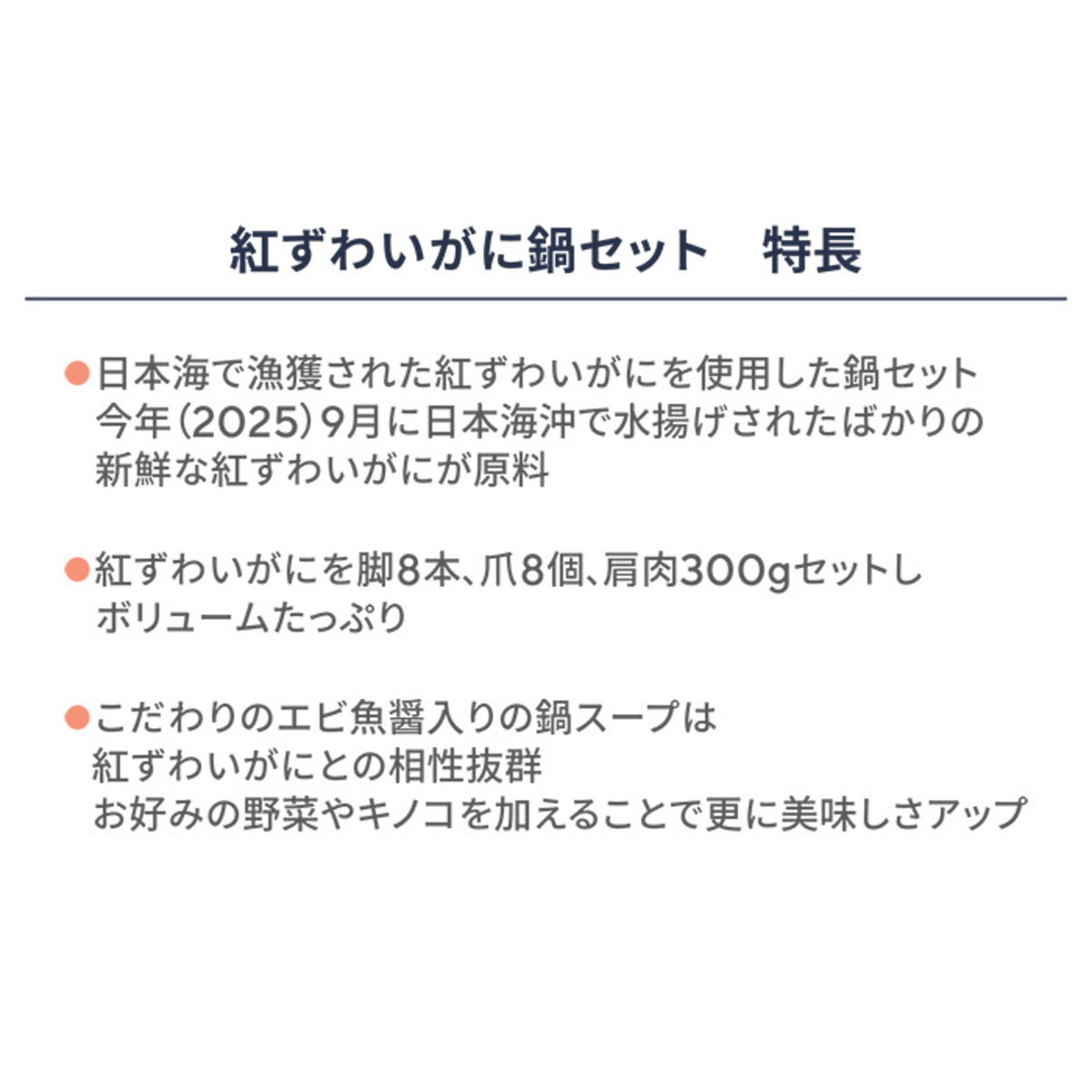 今年9月に日本海沖で水揚げされたばかりの、新鮮な紅ずわいがにを原料として加工。紅ずわいがにが丸々2ハイ分(脚8本、爪8個、肩肉300g)セットされた、ボリュームたっぷりの鍋セットです