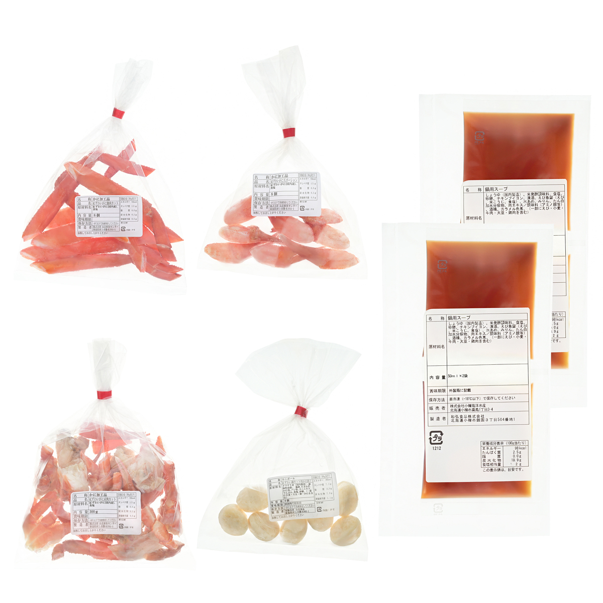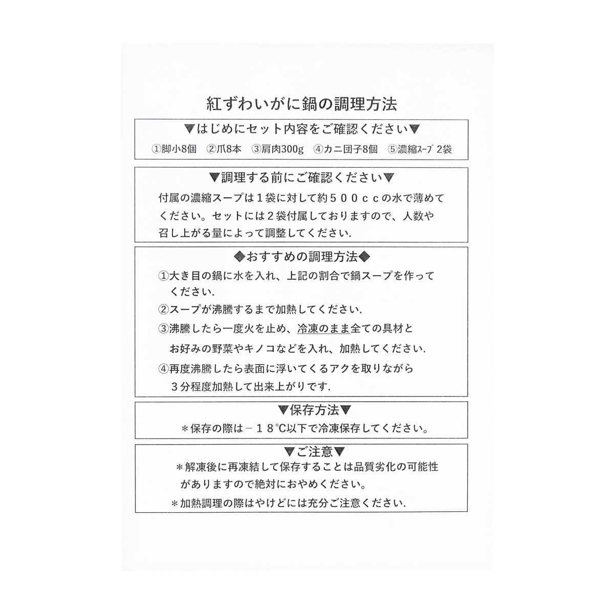 [アレルギー物質特定原材料8品目] 卵、小麦、えび、かに [商品内容] ・脚肉カット8個 ・爪ポーション8個 ・肩肉カット300g ・かに団子8個 ・鍋用スープ50ml×2袋 ・調理方法しおり [賞味期限] 出荷時点で賞味期限まで100日以上ある商品をお届けします [保存方法] 開封前:要冷凍(‐18℃以下で保存) 開封後:当日中にお召し上がりください [お召し上がり方] 付属の濃縮スープは1袋に対して約500ccの水で薄めてください。セットには2袋付属しておりますので、人数や召し上がる量によって調整してください 1.大き目の鍋に水を入れ、上記の割合で鍋スープを作ってください 2.スープが沸騰するまで加熱してください 3.沸騰したら一度火を止め、冷凍のまま全ての具材とお好みの野菜やキノコなどを入れ、加熱してください4.再度沸騰したら表面に浮いてくるアクを取りながら3分程度加熱して出来上がりです [注意事項] ※解凍後に再凍結して保存することは品質劣化の可能性がありますので絶対におやめください ※加熱調理の際はやけどには充分ご注意ください [原料原産地] 脚肉カット、爪ポーション、肩肉カット:紅ずわいがに(国内産) かに団子:タラすり身(国内製造) 鍋用スープ:しょうゆ(国内製造) [原産国] 日本 [原材料] 紅ずわいがに脚肉カット:紅ずわいがに(国内産)、食塩 紅ずわいがに肩肉カット:紅ずわいがに(国内産)、食塩 紅ずわいがに爪ポーション:紅ずわいがに(国内産)、食塩 カニボール:タラすり身(国内製造)、植物性油脂、鶏肉、たまねぎ、かに肉、パン粉、カニエキス、でんぷん、食塩、砂糖、(一部に小麦・大豆・卵・かにを含む) 濃縮スープ:しょうゆ(国内製造)、米発酵調味料、食塩、砂糖、チキンブイヨン、清酒、えび魚醤(えび、米こうじ、食塩)、水あめ、みりん、たん白加水分解物、肉エキス/調味料(アミノ酸等)、酒精、カラメル色素、(一部にえび・小麦・牛肉・大豆・鶏肉を含む)