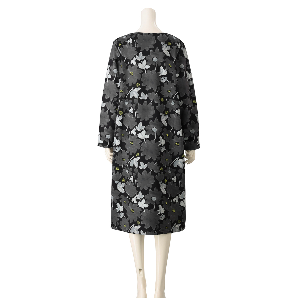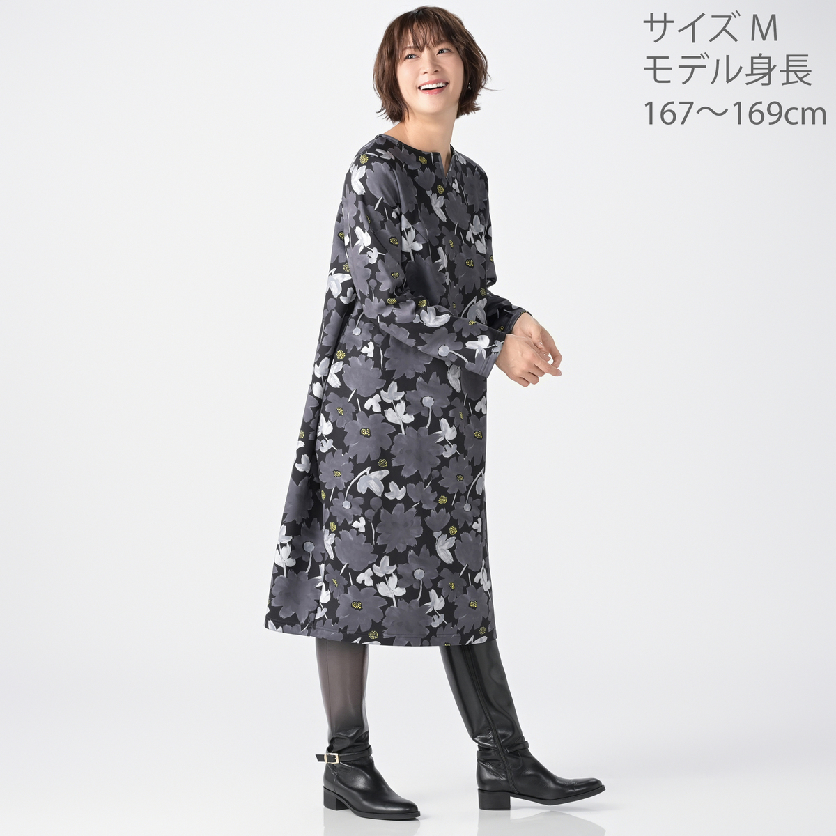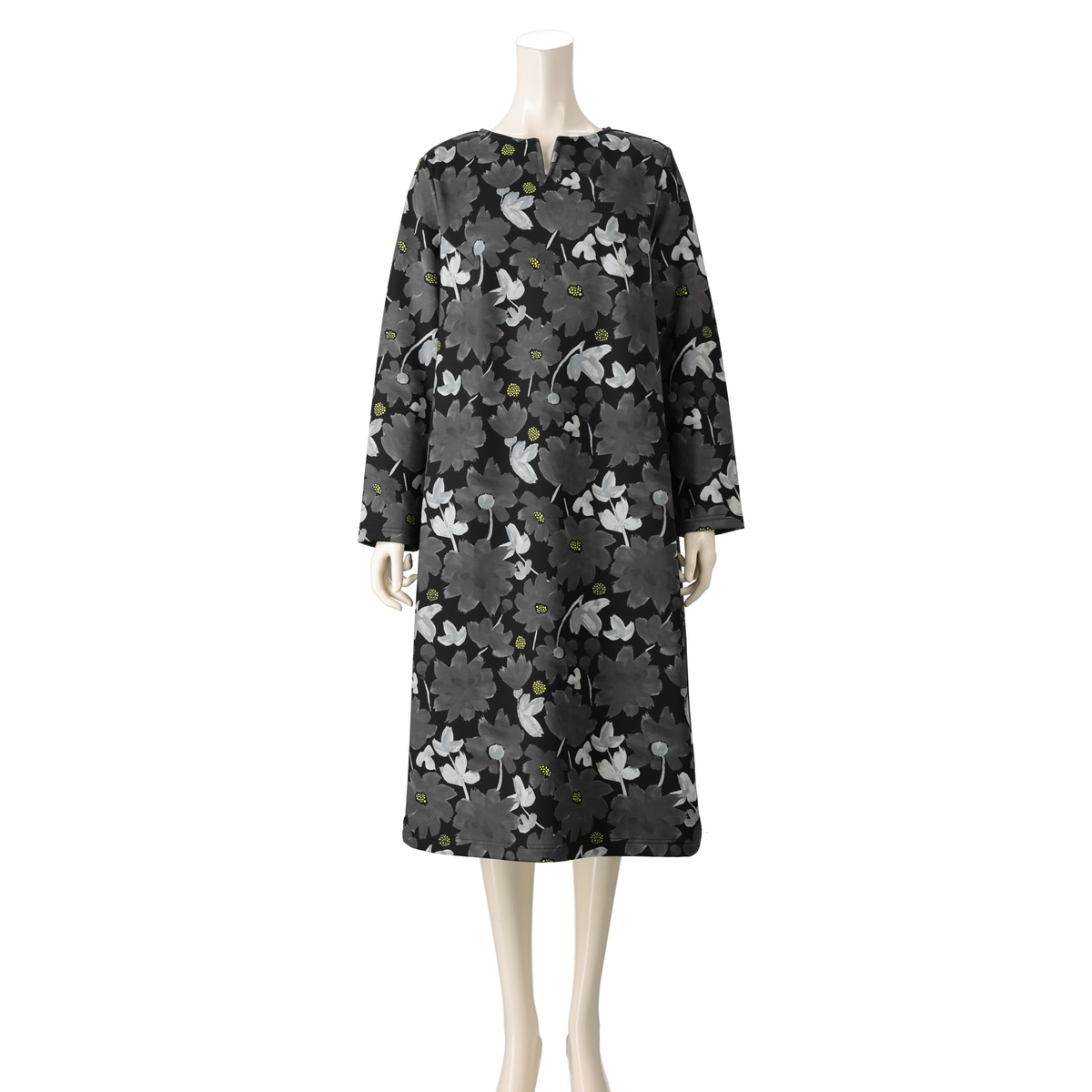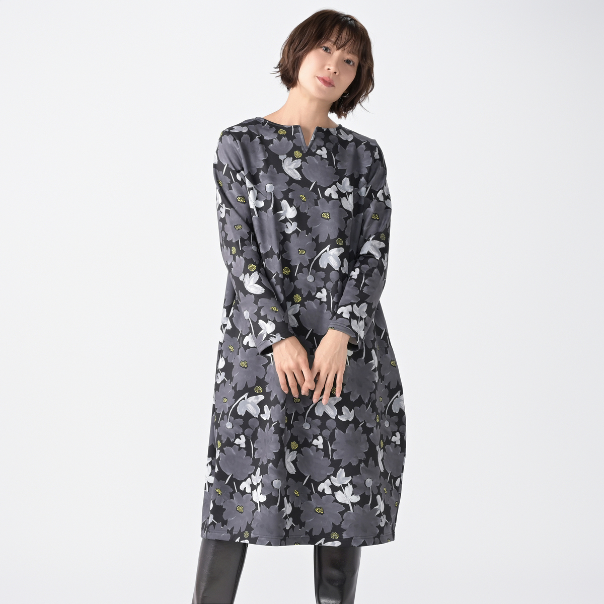 ダリアの花のイラストを全体にプリントした華やかなワンピースです。あたたかな裏起毛素材で、着心地も楽なストレッチ入り。身体のラインを拾いにくい、ざっくりと着られるコクーンシルエットです