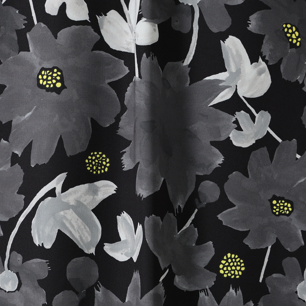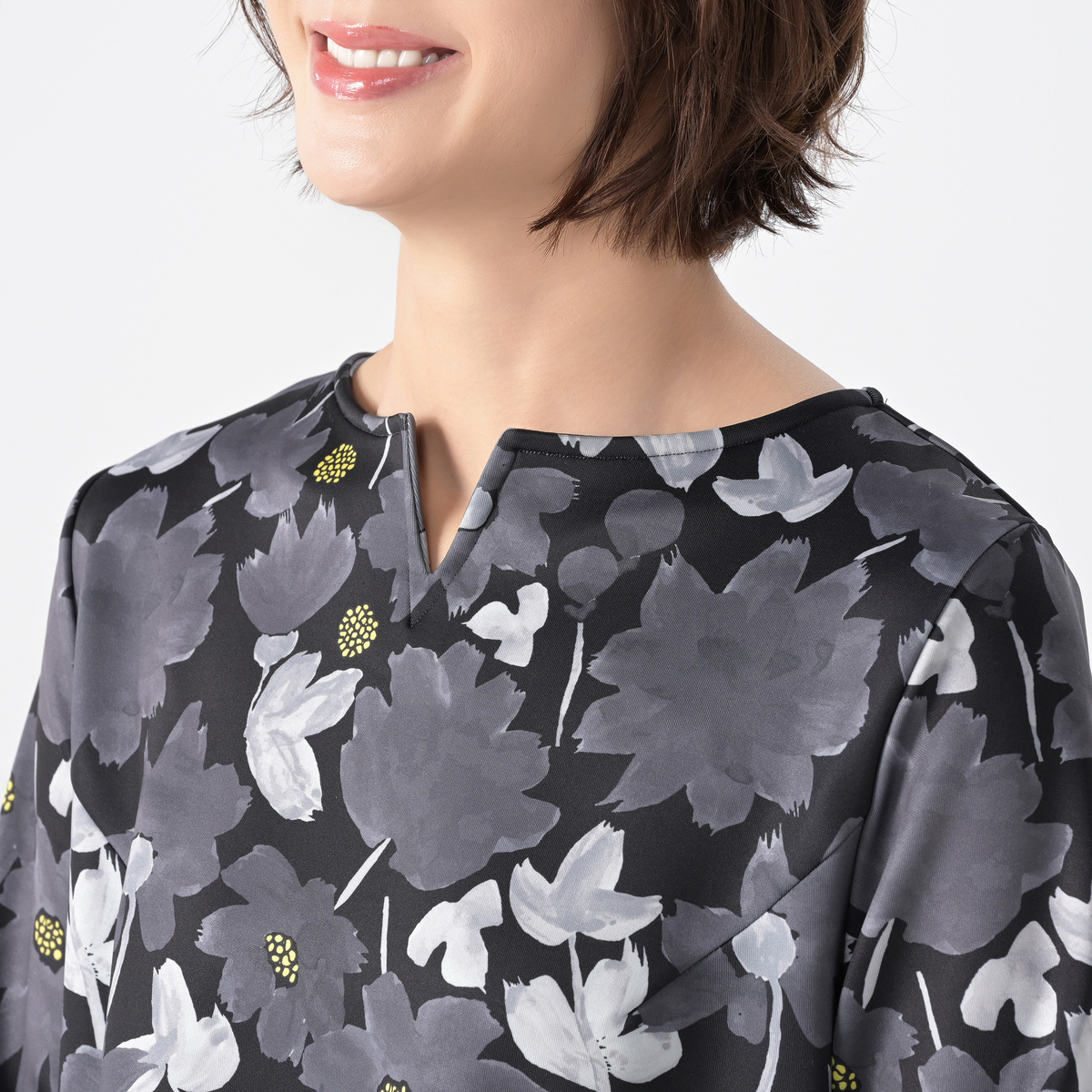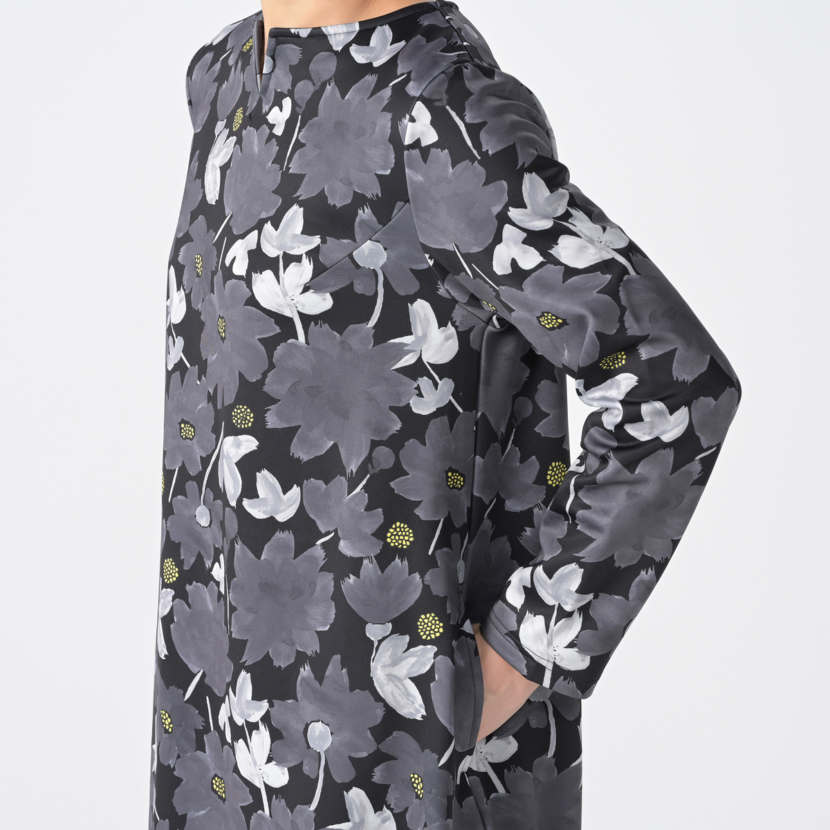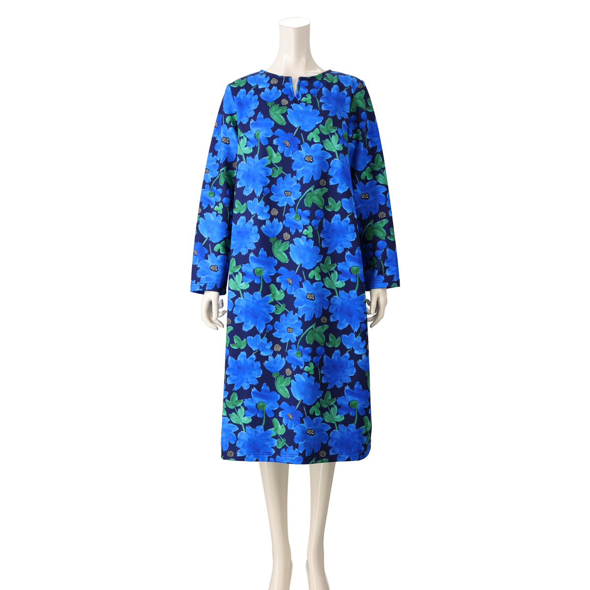 ダリアの花のイラストを全体にプリントした華やかなワンピースです。あたたかな裏起毛素材で、着心地も楽なストレッチ入り。身体のラインを拾いにくい、ざっくりと着られるコクーンシルエットです