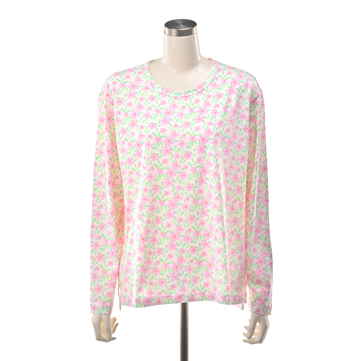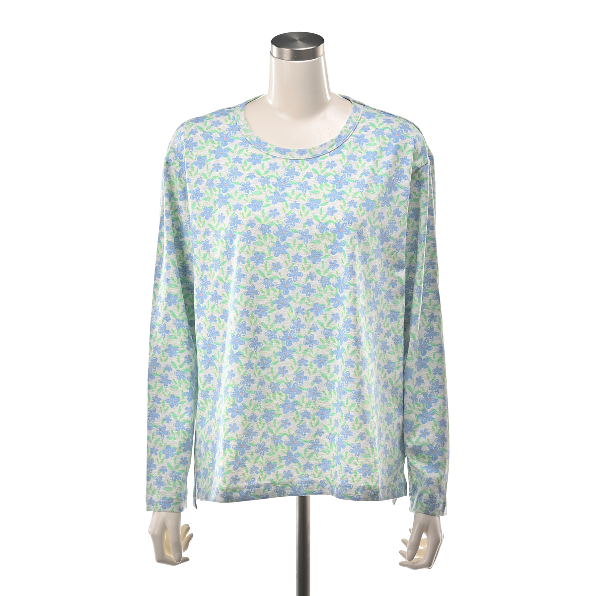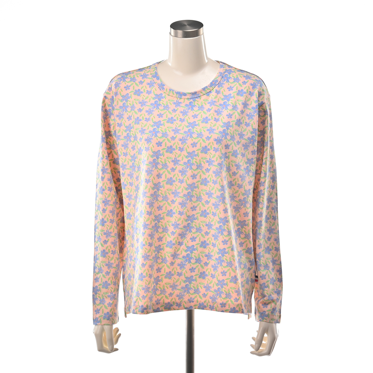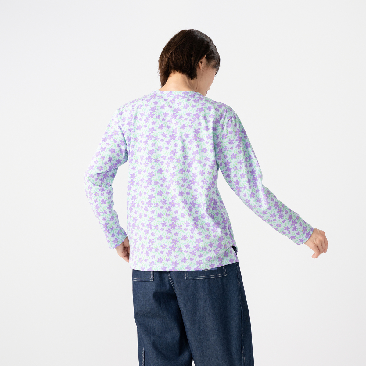 小さめの花柄が全体にプリントされた長袖Tシャツ。シンプルなクルーネックのデザインです