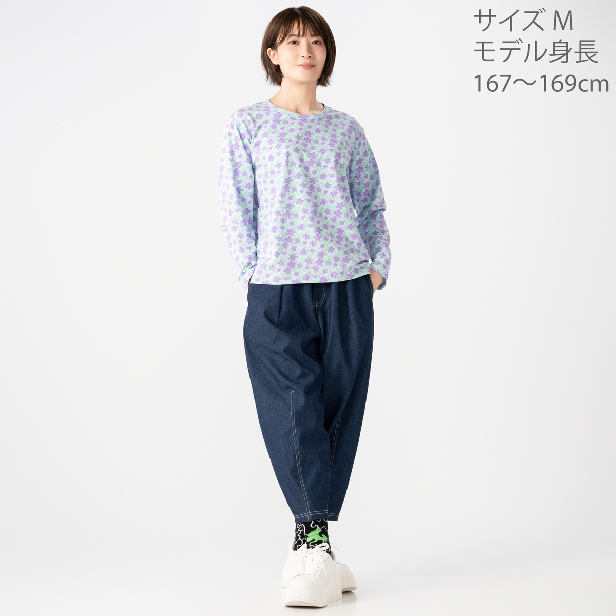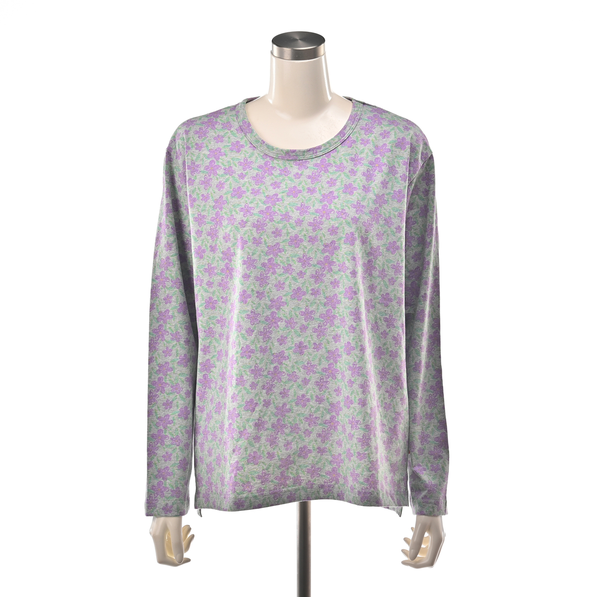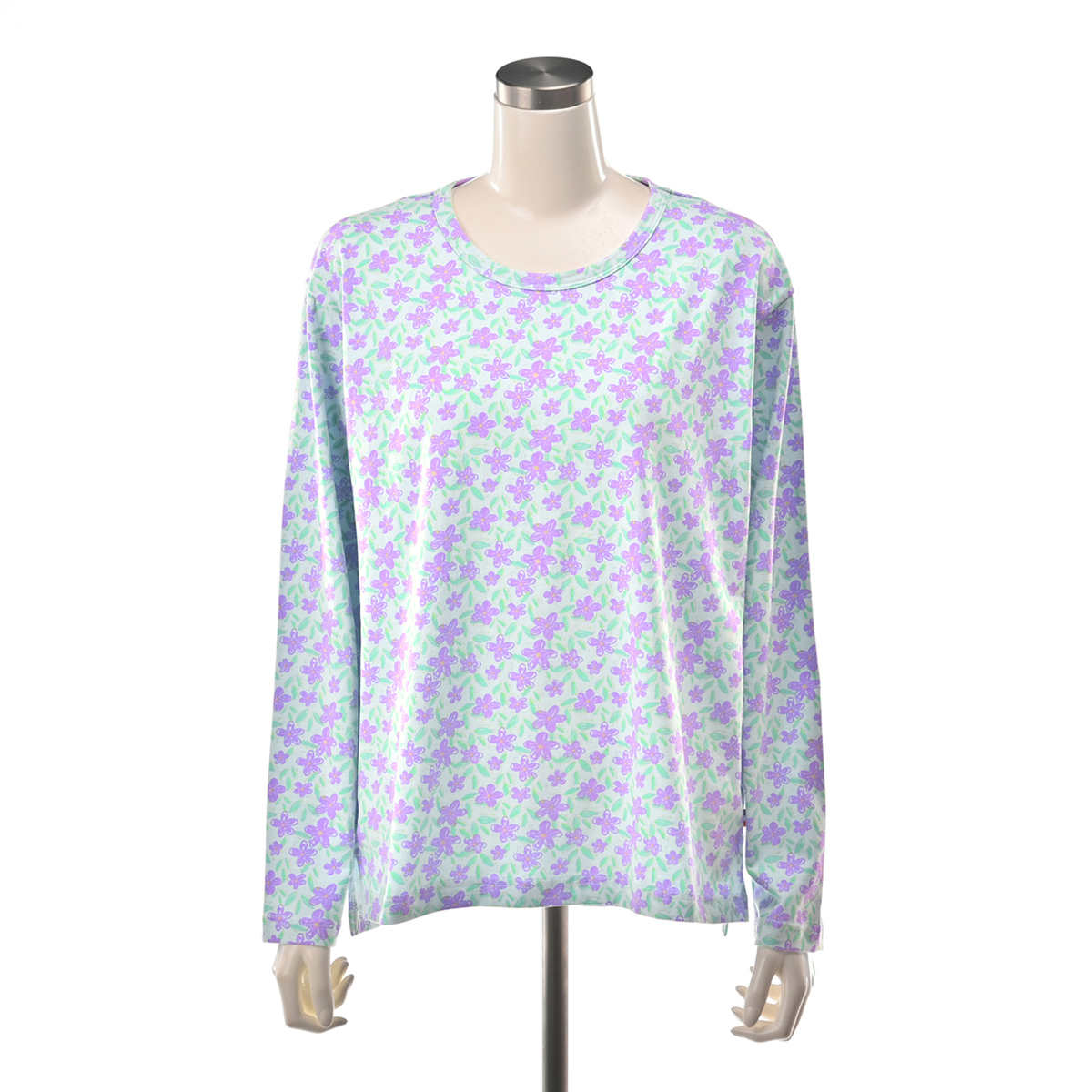 小さめの花柄が全体にプリントされた長袖Tシャツ。シンプルなクルーネックのデザインです