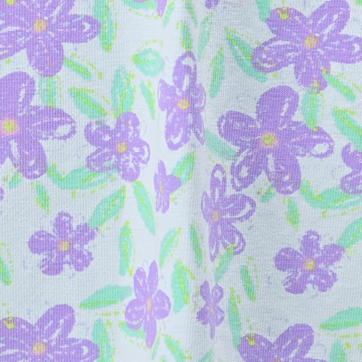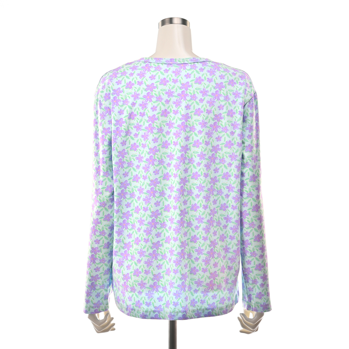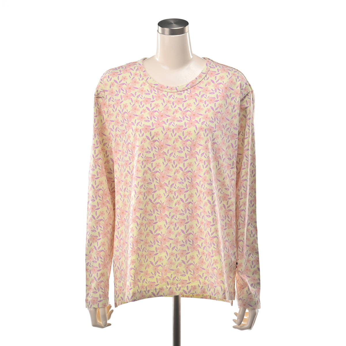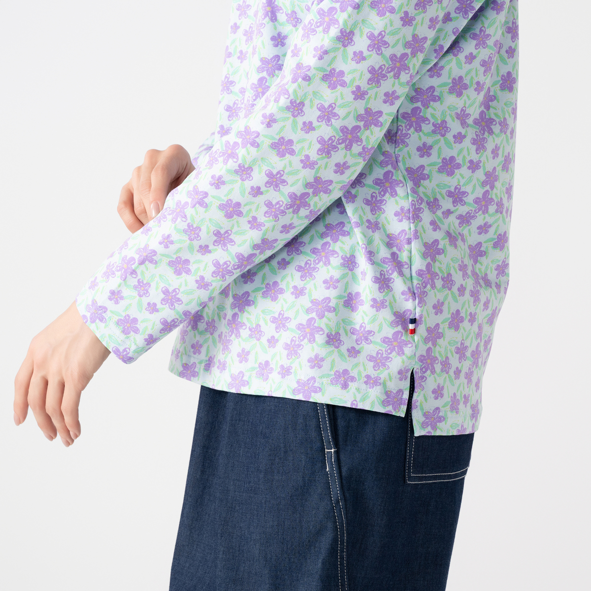 小さめの花柄が全体にプリントされた長袖Tシャツ。シンプルなクルーネックのデザインです