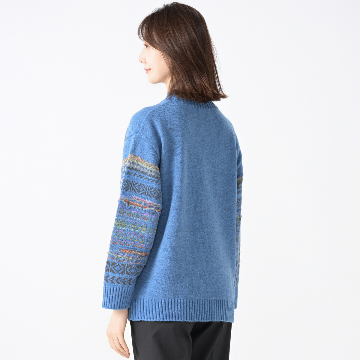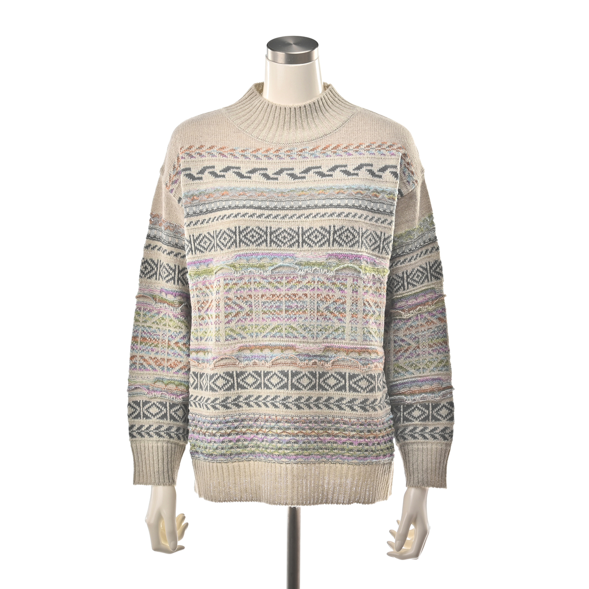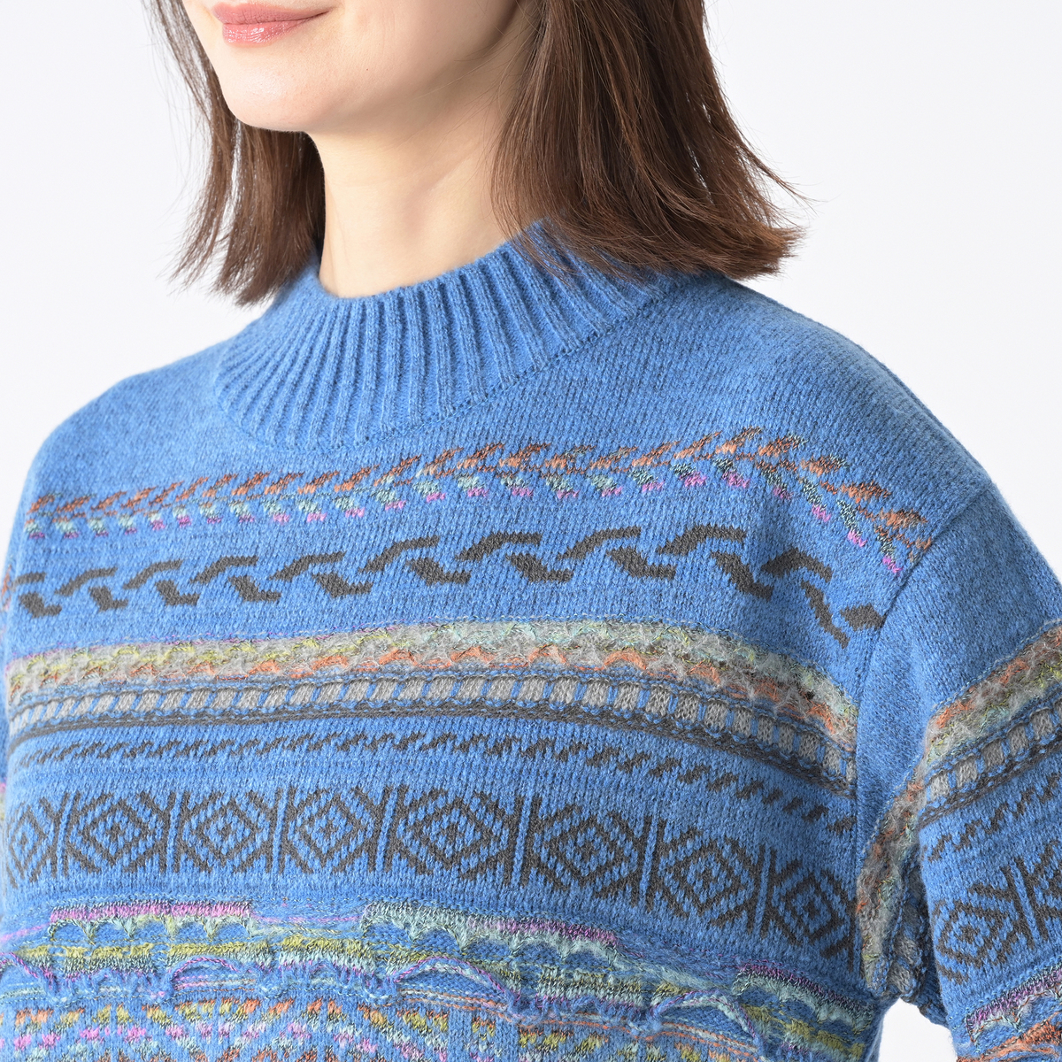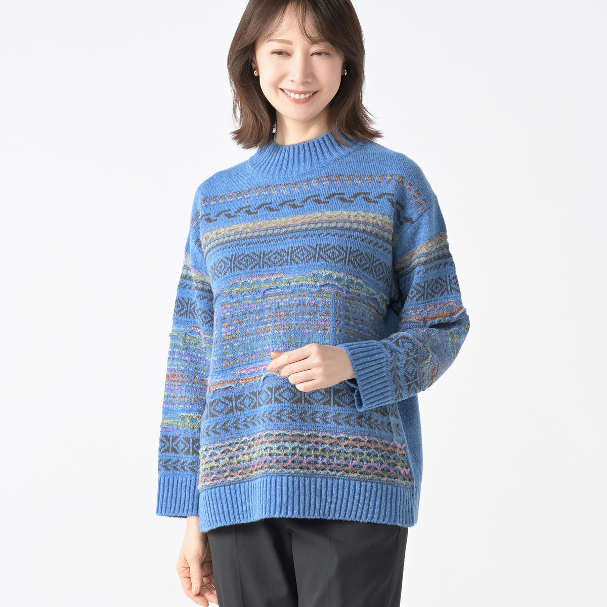 立体的なジャガード編地が魅力。ゆったりとした着心地で、ボックス型のシルエットにドロップショルダーを組合せ、1枚で存在感を放ちます。エスニックな雰囲気の柄を、かすり糸が美しく引き立てます