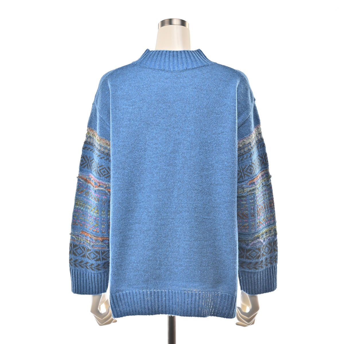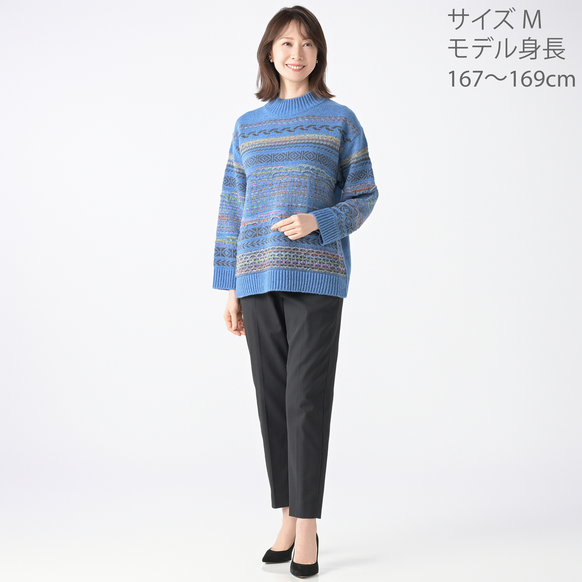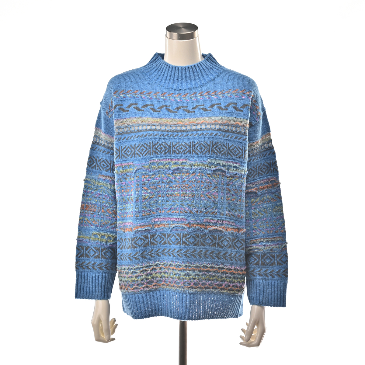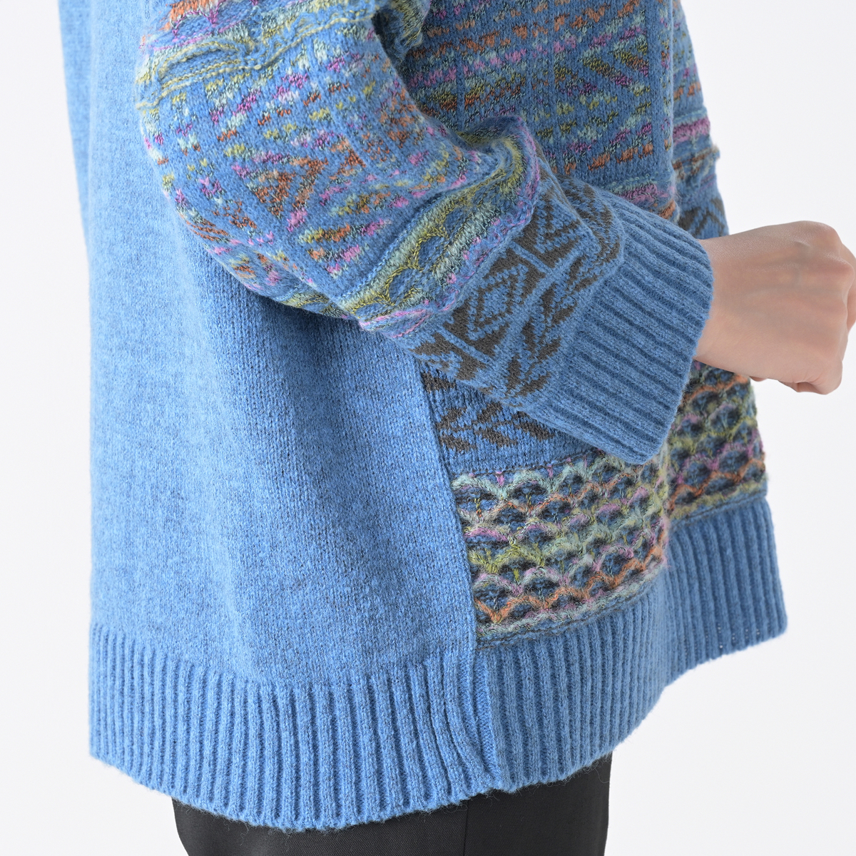 立体的なジャガード編地が魅力。ゆったりとした着心地で、ボックス型のシルエットにドロップショルダーを組合せ、1枚で存在感を放ちます。エスニックな雰囲気の柄を、かすり糸が美しく引き立てます