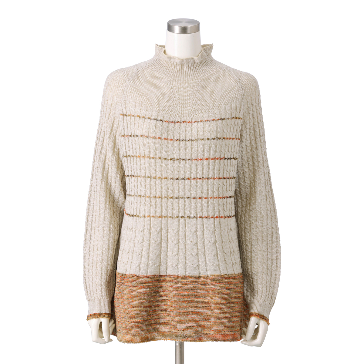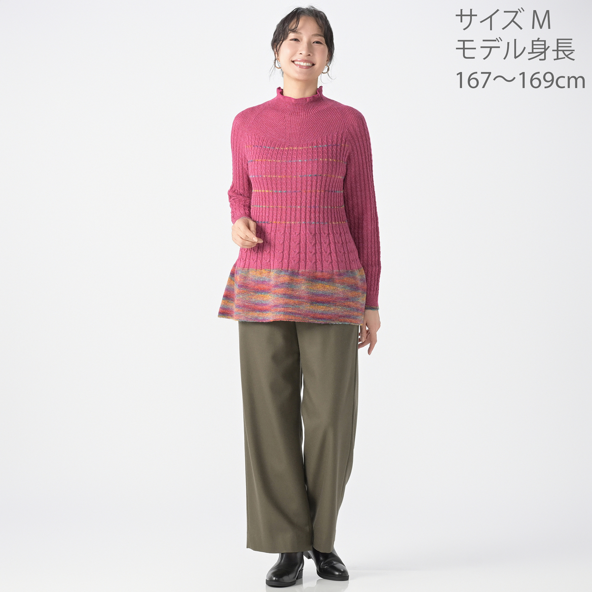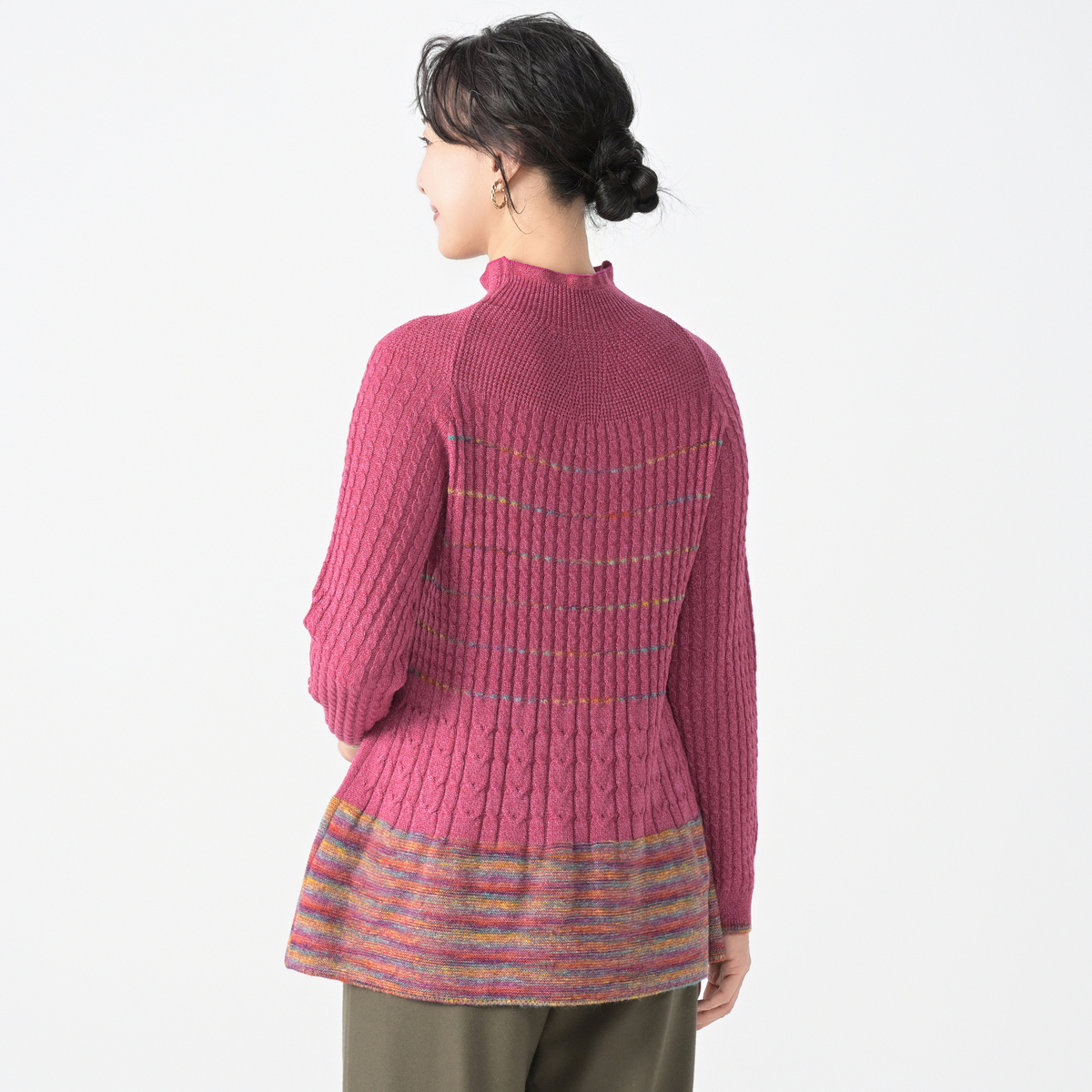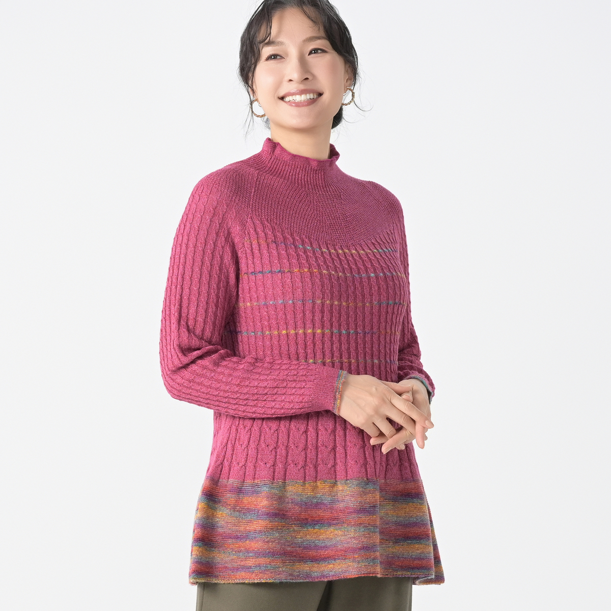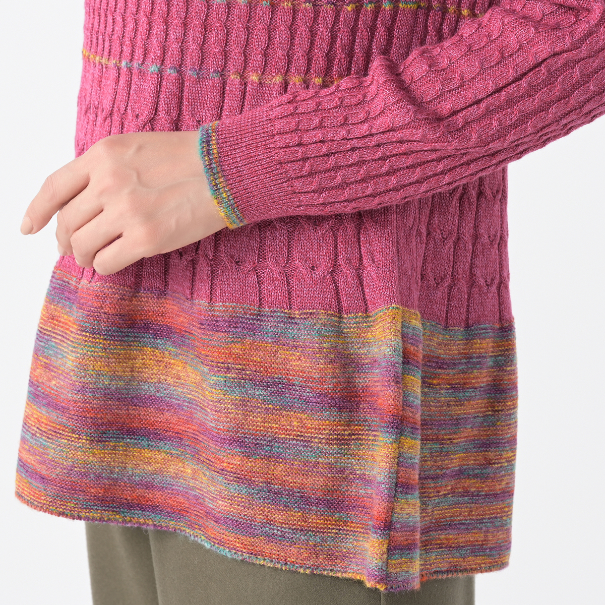 裾・袖口・身頃にかすり糸のアクセントを施した、華やかなチュニック。ケーブル柄の幅の変化により、ウエストラインを美しく見せてくれます