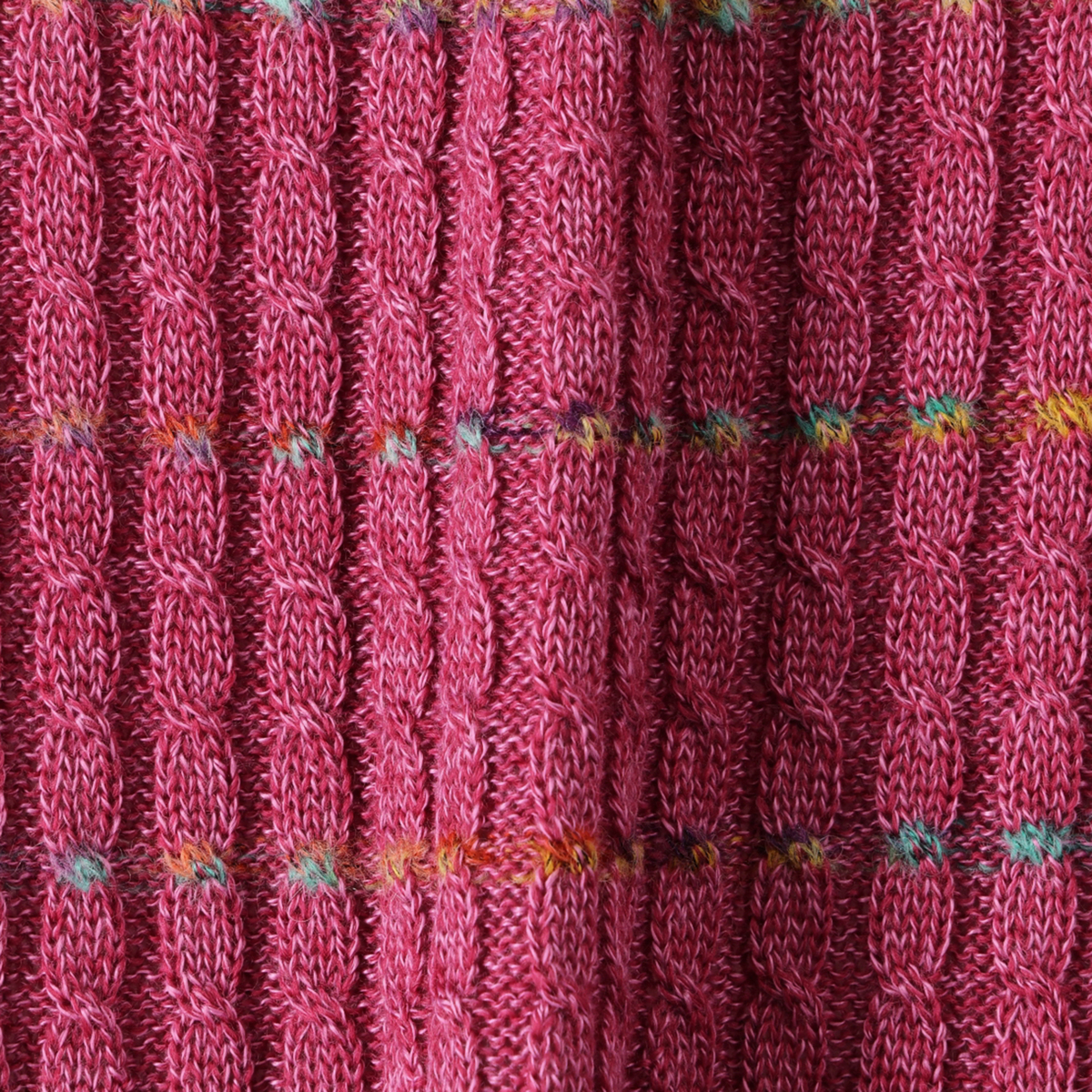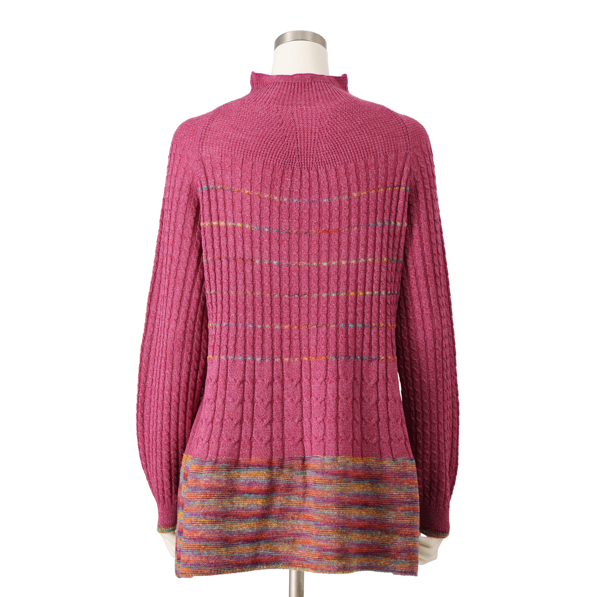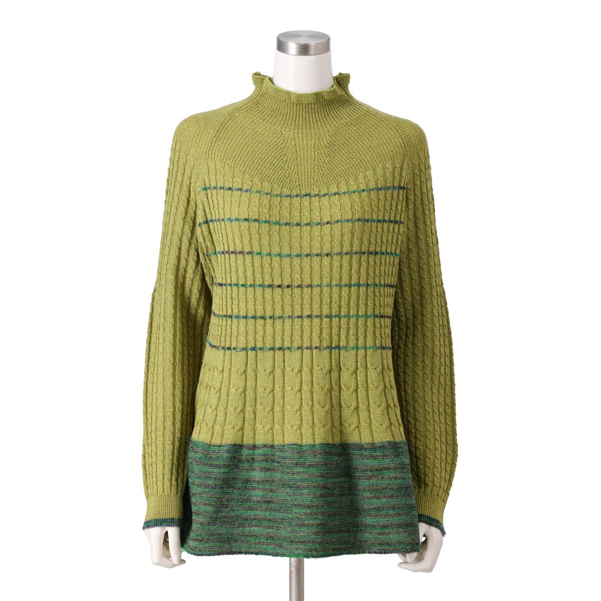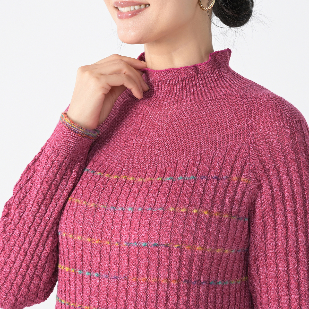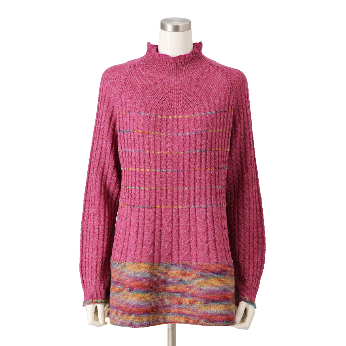 裾・袖口・身頃にかすり糸のアクセントを施した、華やかなチュニック。ケーブル柄の幅の変化により、ウエストラインを美しく見せてくれます