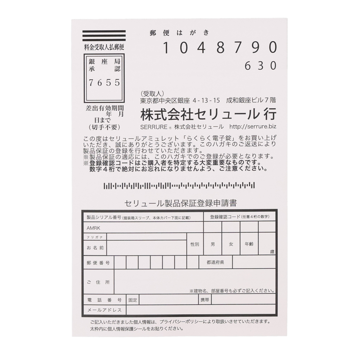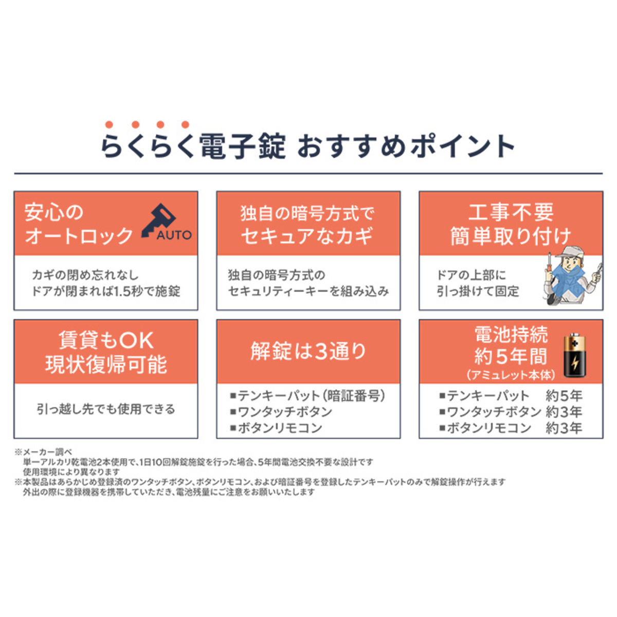 [商品内容] ・アミュレット:本体、単1アルカリ乾電池×2、ドア開閉センサープレート、ドア厚調整パット×2、取付調整用六角レンチ ・テンキーパット:本体(単3アルカリ乾電池×4装着済)、ドア取付用強力両面テープ×2 ・ワンタッチボタン:本体(CR2032ボタン電池装着済)、ドア取付用強力両面テープ×2 ・ボタンリモコン:本体(CR2032ボタン電池装着済)×2 [サイズ]幅×高さ×奥行 アミュレット本体:15.2×8.5×4.2cm テンキーパット:6.6×12.0×2.6cm ボタンリモコン:3.75×6.0×1.2cm ワンタッチボタン:直径4.5×高さ1.25cm [重量(約)] 本体:800g テンキーパット:156g ワンタッチボタン:16g ボタンリモコン:16g [使用電池] 本体:単1アルカリ乾電池×2 テンキーパット:単3アルカリ乾電池×4 ワンタッチボタン:CR2032ボタン電池×1 ボタンリモコン:CR2032ボタン電池×1 ■取り扱い説明を充分にご確認の上、ご使用下さい 【日本製】 [注意事項] ※らくらく電子錠を使用するときは、心臓ペースメーカー等埋め込み型医療機器の装着部位から30cm以上離して使用する ※外出する際は、扉が確実に閉まっているか確認して下さい ※本製品は工事不要タイプのオートロック錠です。取り付けるドア等の形状により取り付けられない事がございますので、購入前にドア厚、ドア枠の形状等をよくご確認下さい ※一般住宅、マンション等の個人ドア、パーティションドア、キャビネット、カタログ等でご紹介している用途以外でのご使用はしないでください。故障の原因、感電、火災の危険があります ※電池は施錠時、解錠時にブザーが鳴るようになりましたら、直ちに2本とも交換して下さい。その際、新品のアルカリ乾電池以外のものを使用しないでください。漏液や不具合の原因になります ※電池は交換時期でなくても定期的に(6カ月ごと)乾電池の状態を確認し漏れが確認された場合は、直ちに新しいものと交換して下さい ※ボタンリモコン、ワンタッチボタンの動作範囲の目安は、らくらく電子錠本体から約5mです。範囲内でも建物の影響や障害物等により動作距離は変わります ※次のような場合は正常に動作しなかったり動作が不安定になる場合があります 1.テレビ塔や発電所、ガソリンスタンド、放送局、大型ディンスプレイ、空港、工事現場、パチンコ店等強い電波やノイズの発生する場所に近い時 2.ボタンリモコン・ワンタッチボタンが次のような金属製のものに接していたり、覆われている時、アルミ箔等の金属の貼られたカード、金属製の箱、財布やカバン、小銭、カイロ等 3.電子レンジ、エアコンの室外機、インバーター方式蛍光灯照明など電波やノイズの発生する機器がらくらく電子錠本体を設置しているドアの近くにある場合 4.解錠デバイスを他の携帯電話やコードレス式電話などの無線通信機器、デジタルオーディオプレーヤーやポータブルゲーム機器などの電波を発信する製品と一緒に携帯している場合 ※本製品はBluetooth無線を使用し、「電波法」に基づく小電力データ通信システムの無線設備として認証を受けており、技適認証番号を取得しております。したがって、本製品を使用するときは無線局の免許は必要ありません。但し、本機を分解・改造された場合はその限りではありません ※らくらく電子錠本体、解錠デバイスを火の中に入れたり、加熱したり、高温になる場所に放置しないでください ※らくらく電子錠本体、解錠デバイスは絶対に改造をしないでください ※らくらく電子錠本体の電池ボックス端子に金属や異物を接触させないでください ※製品内部に水や液体をかけたり、入れたりしないでください ※掃除に濡れた雑巾や揮発性のアルコール、ベンジン、シンナー等を使用しないでください ※らくらく電子錠本体、解錠デバイスを電子レンジに入れたり、電磁調理機器などに置いたりしないでください ※らくらく電子錠本体に乾電池を入れるとき、又は交換するときに電池の+-を弱に入れないでください ※ボタンを無理に押すなど乱暴に扱わないでください。ボタンは必ず指の腹で押してください。爪の先、尖がったものでは押さないでください ※らくらく電子錠、解錠デバイスを落としたり、投げたり、強いショックを与えないでください ※らくらく電子錠本体の動作確認ボタンでの解錠、外出はしないでください。通常の解錠方法としては使用しないでください ※ドアを無理にこじ開けたり、製品に無理な力を加えたりしないでください