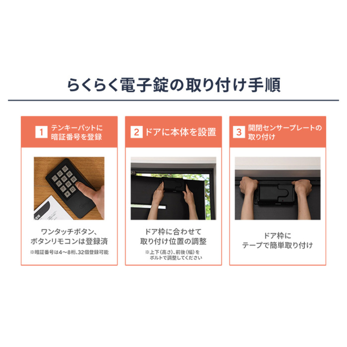 *1)取り付けるドア等の形状により取り付けられないことがございますので、ご購入前にドア厚、ドア枠の形状等をよくご確認ください。一般住宅・マンション等の個人ドア、パーティションドア、キャビネット、カタログ等でご紹介している用途以外でのご使用はしないでください。外出する時は扉が確実に閉まっているか確認してください。セリュールアミュレットらくらく電子錠はシリンダー錠の補助錠としてご使用ください。電子錠によりオートロックがされますが、防犯上シリンダー錠の施錠を併せて行っていただくことを推奨しております