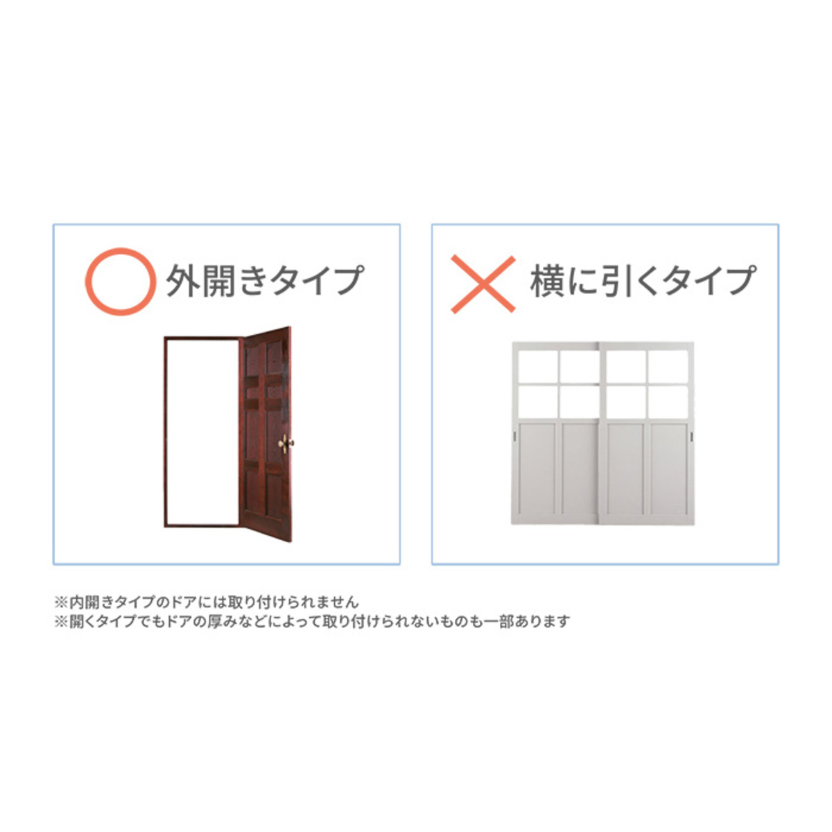 付属の両面テープでドアへ簡単取り付け。外開きタイプのドアに設置が可能です(*3)。穴あけ加工やネジ止めの必要もなく、両面テープを剥がすことで取外しが可能なため、賃貸住宅でもご使用可能です
