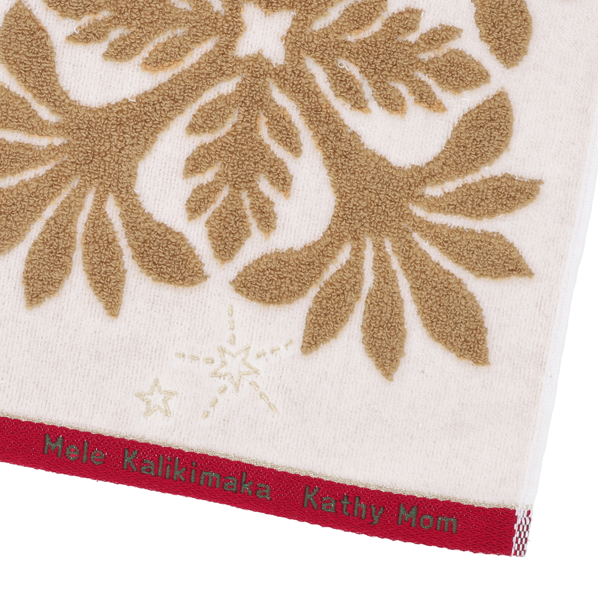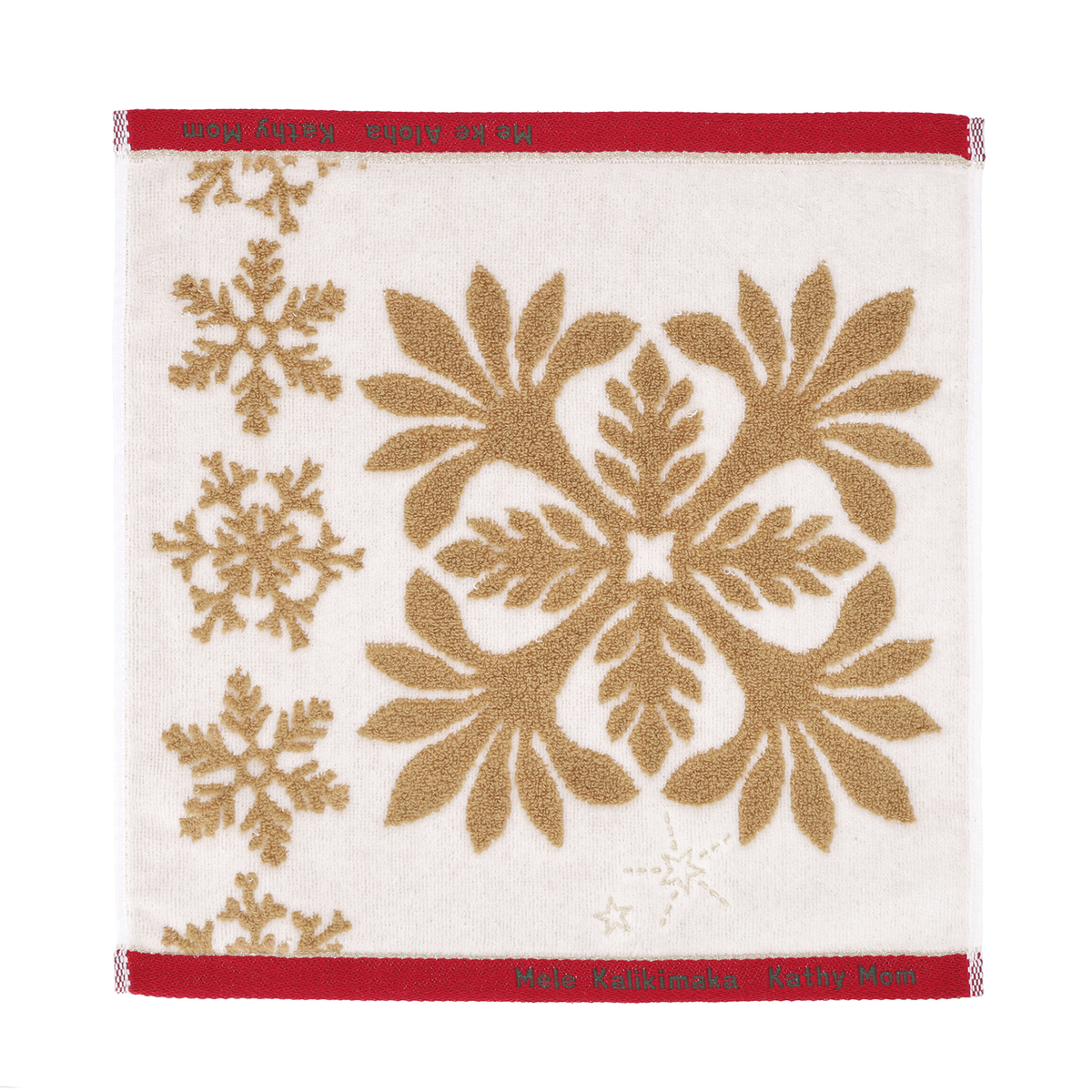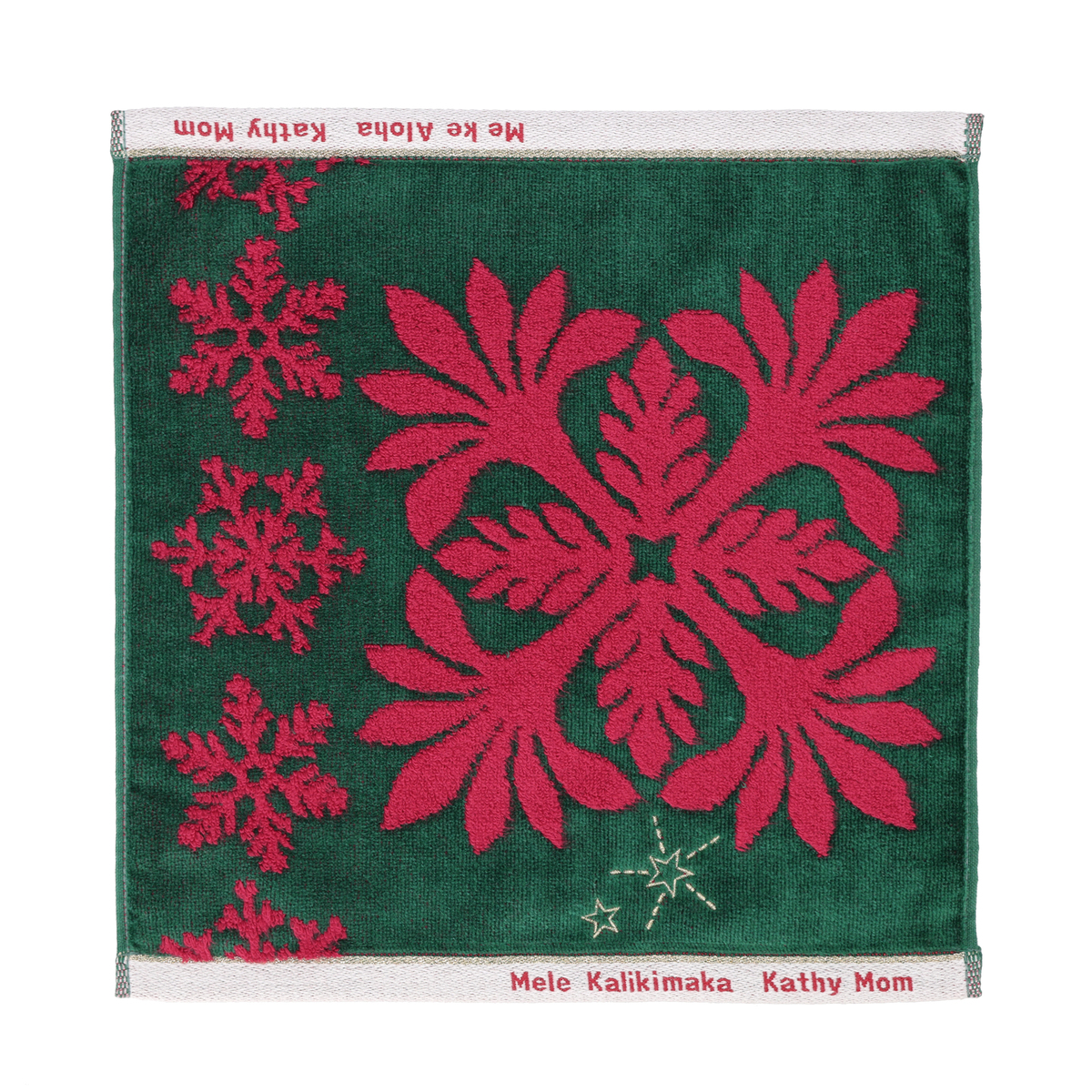 キャシーマムデザインのクリスマス柄。“ティ”の葉のデザインをキルトにしました。フラではスカートや手首、足首に巻くレイに、浄めの目的で用いられています
