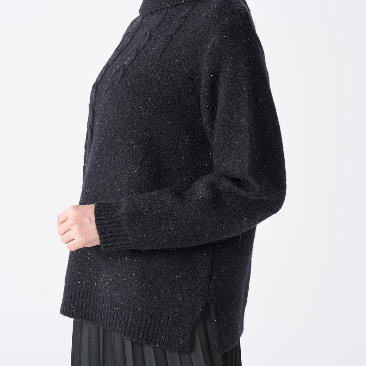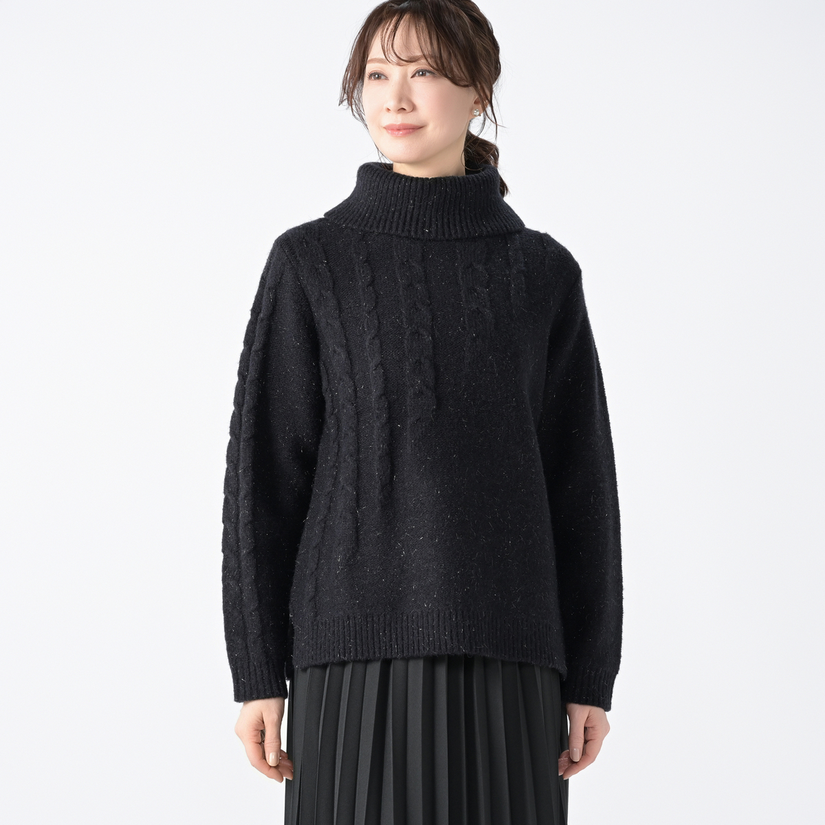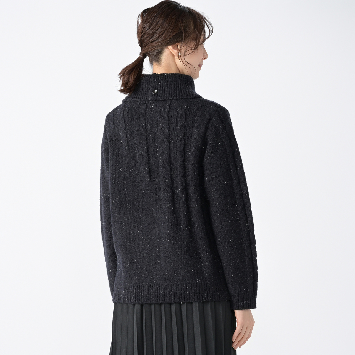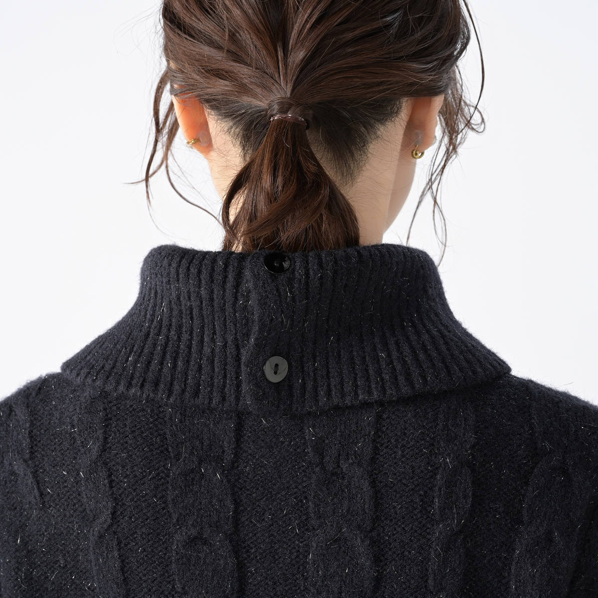 アシンメトリーに走る斜めケーブル柄が印象的なニットプルオーバー。全体にあしらったラメが華やかさを添えます。適度なゆとりを持たせたシルエットに、ボタン付きオフタートルで抜け感をプラス。ふくらみのある糸でざっくり編み立てた手編みの様な風合いも魅力で、シンプルでも着映えする一枚です