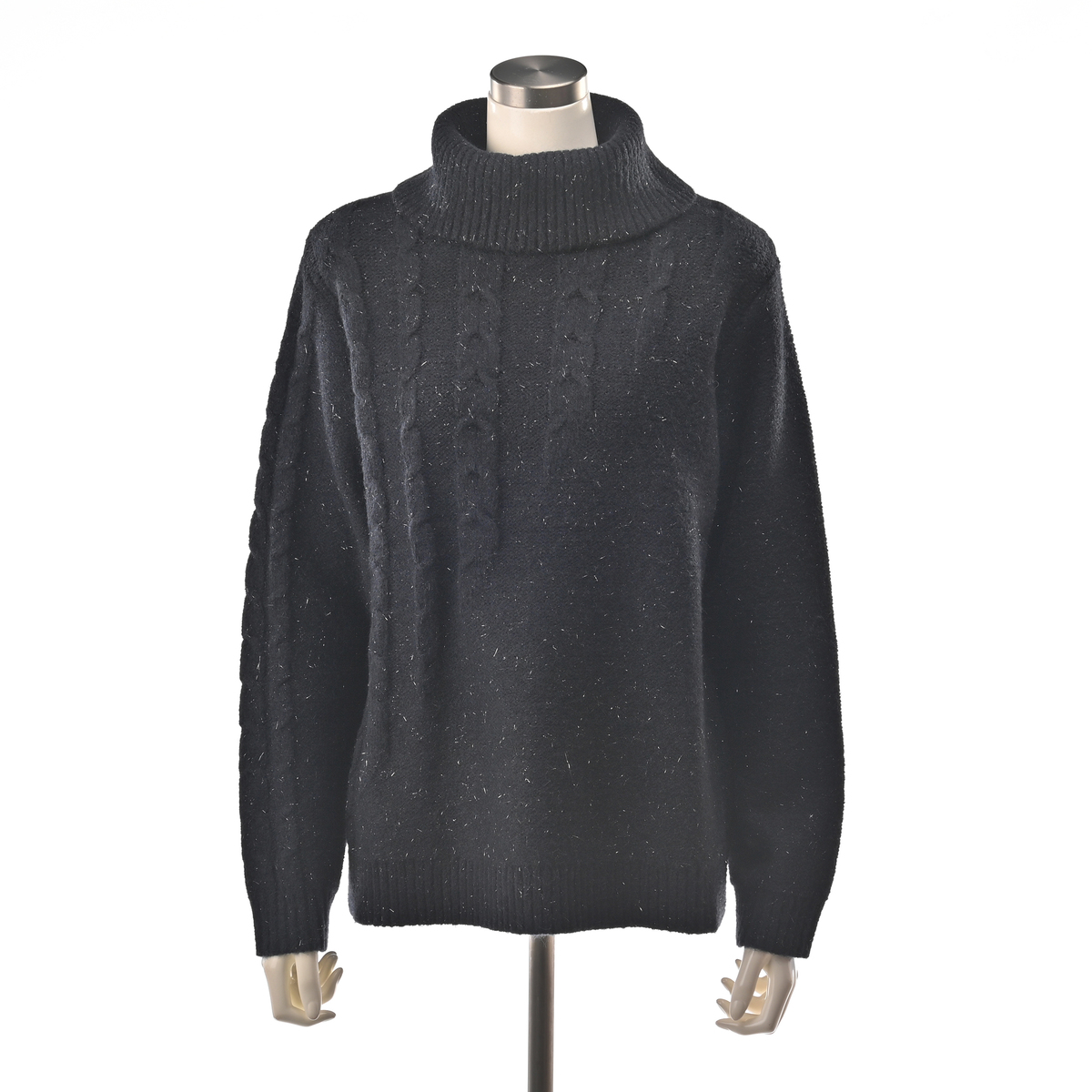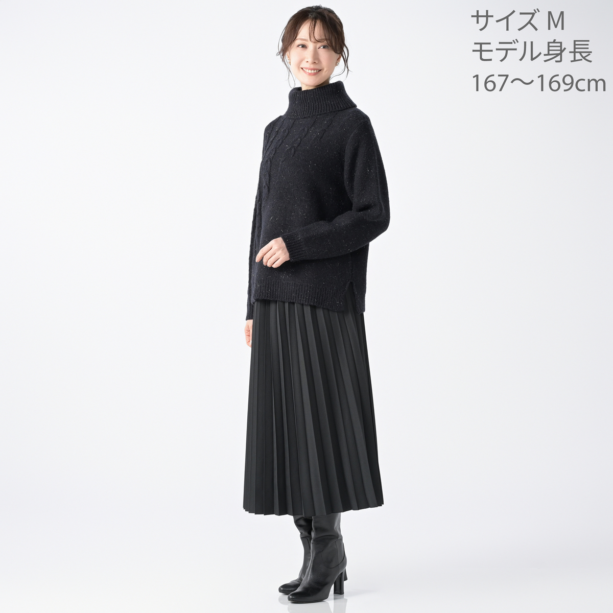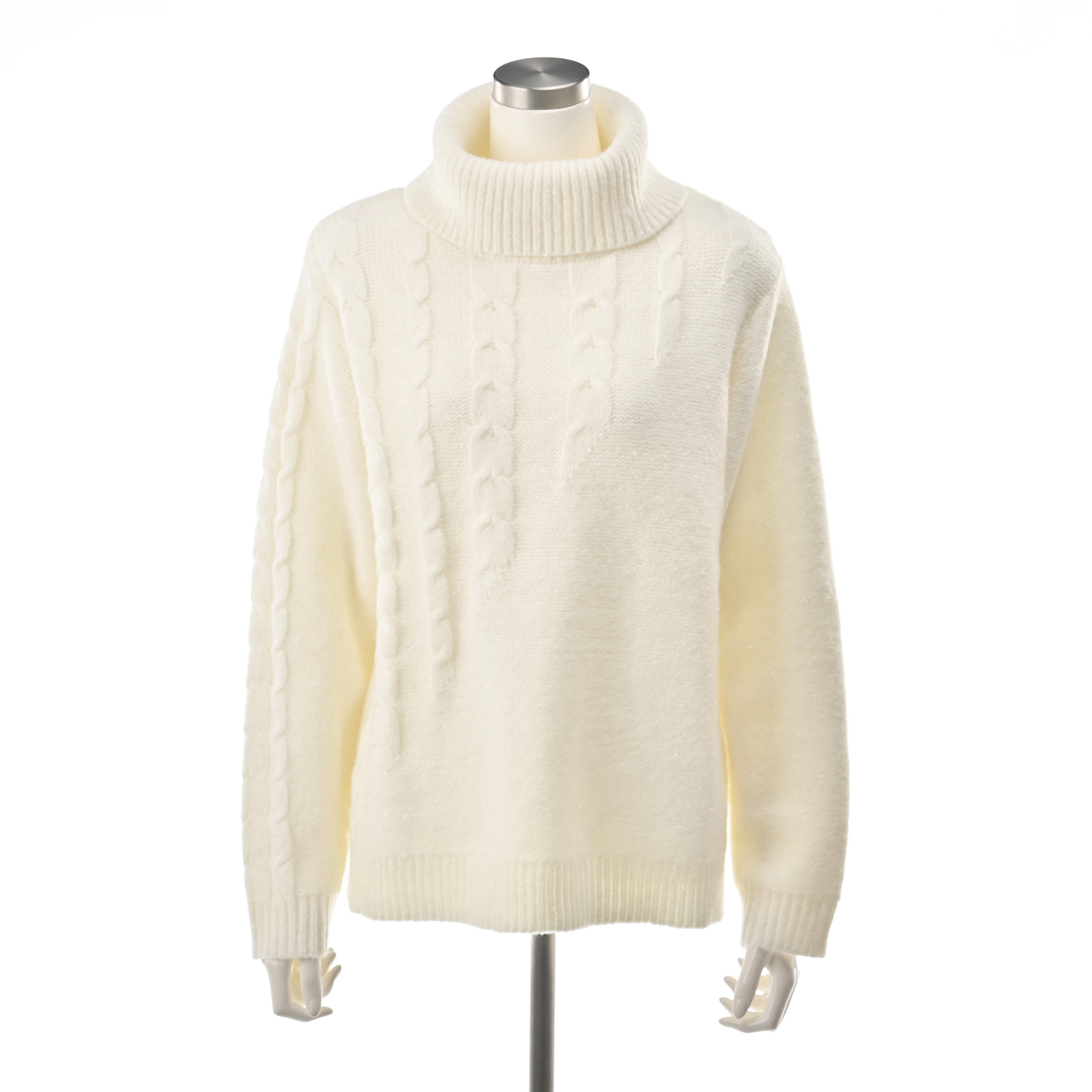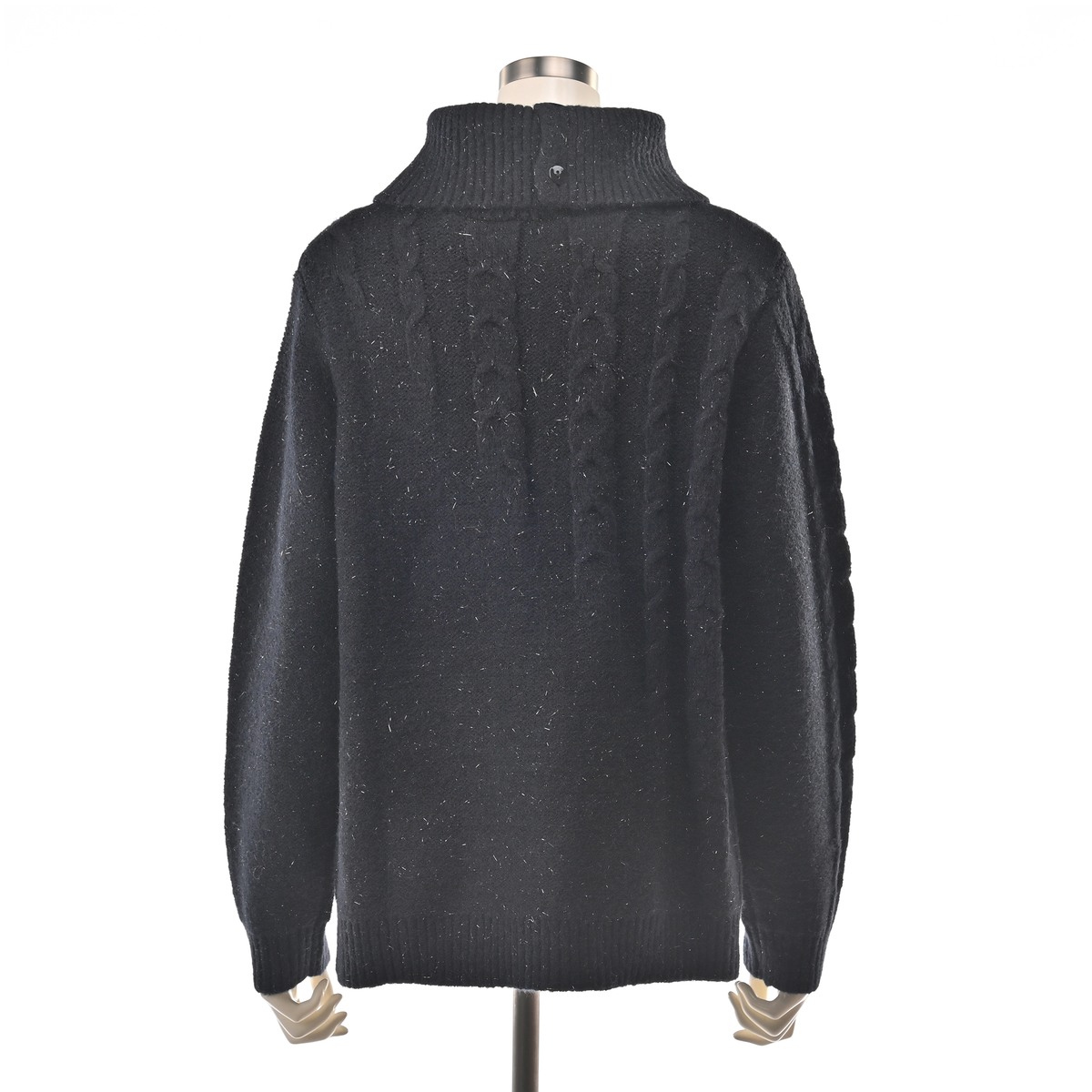 アシンメトリーに走る斜めケーブル柄が印象的なニットプルオーバー。全体にあしらったラメが華やかさを添えます。適度なゆとりを持たせたシルエットに、ボタン付きオフタートルで抜け感をプラス。ふくらみのある糸でざっくり編み立てた手編みの様な風合いも魅力で、シンプルでも着映えする一枚です