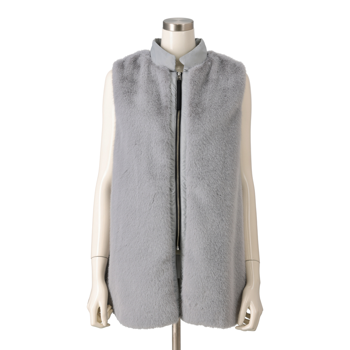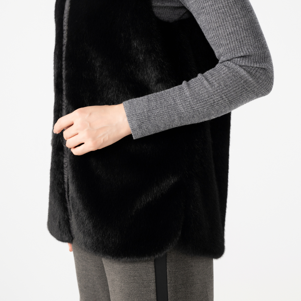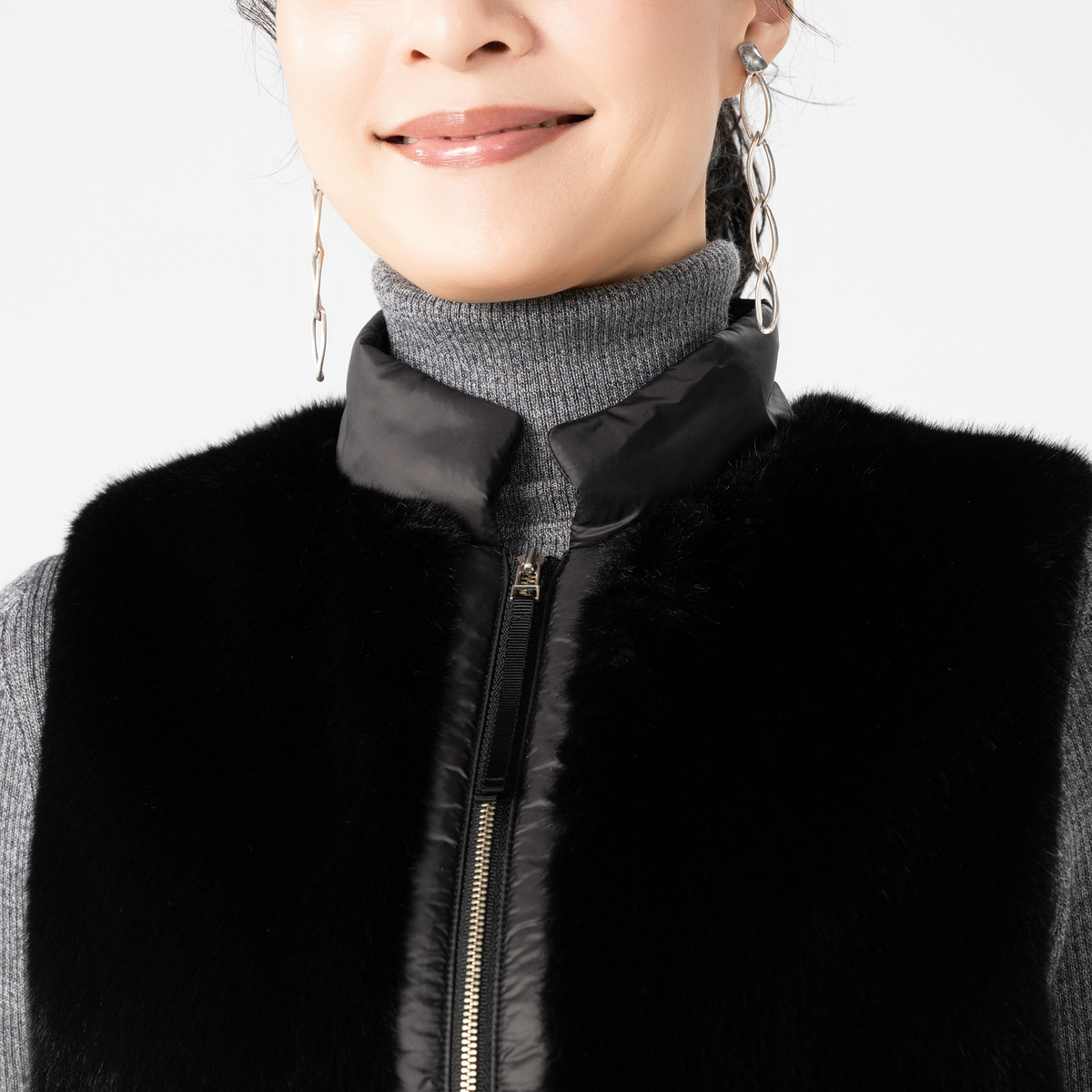 異素材使いが魅力のフェイクファージレ。ふんわりとしたフェイクファーが装いにと華やかさをプラスします