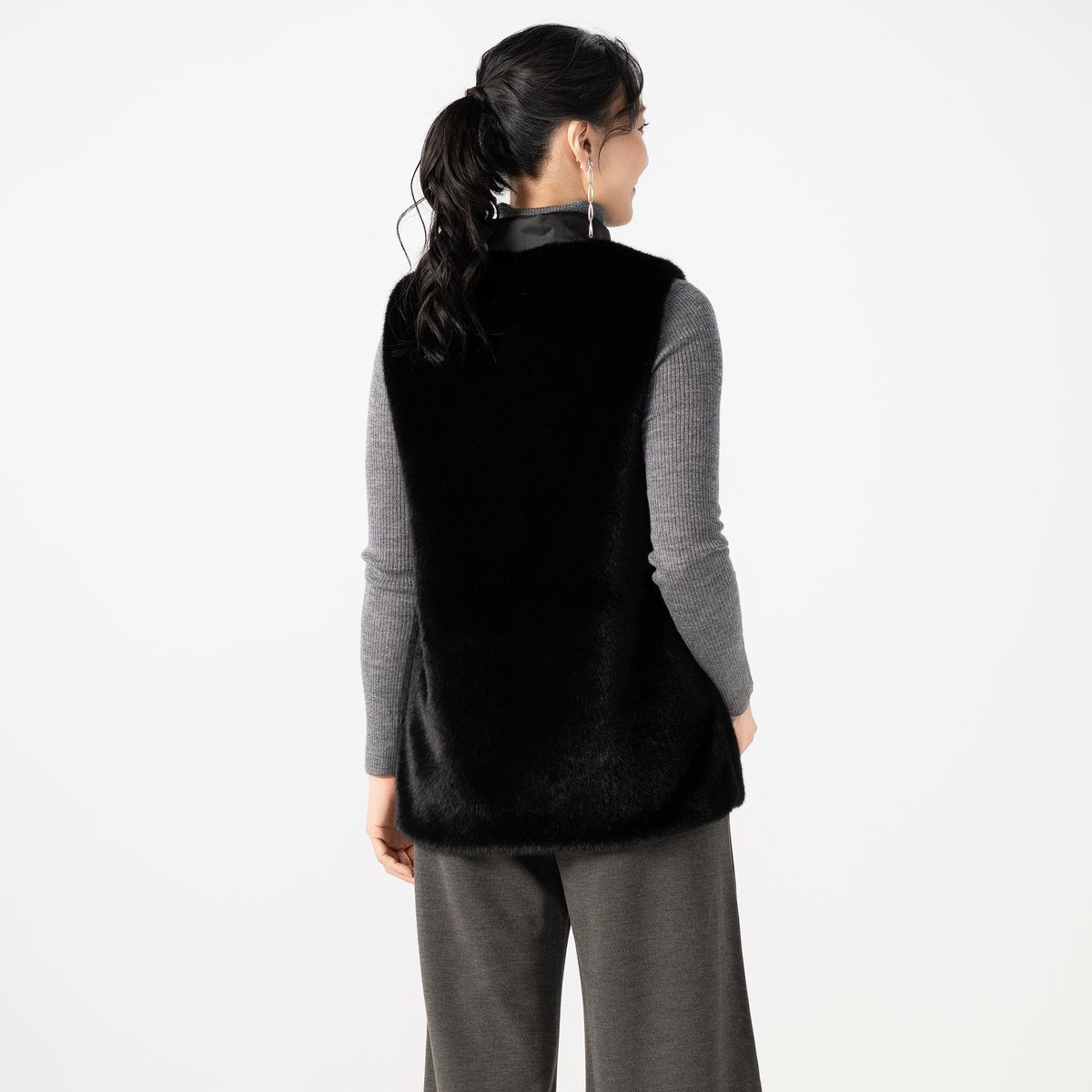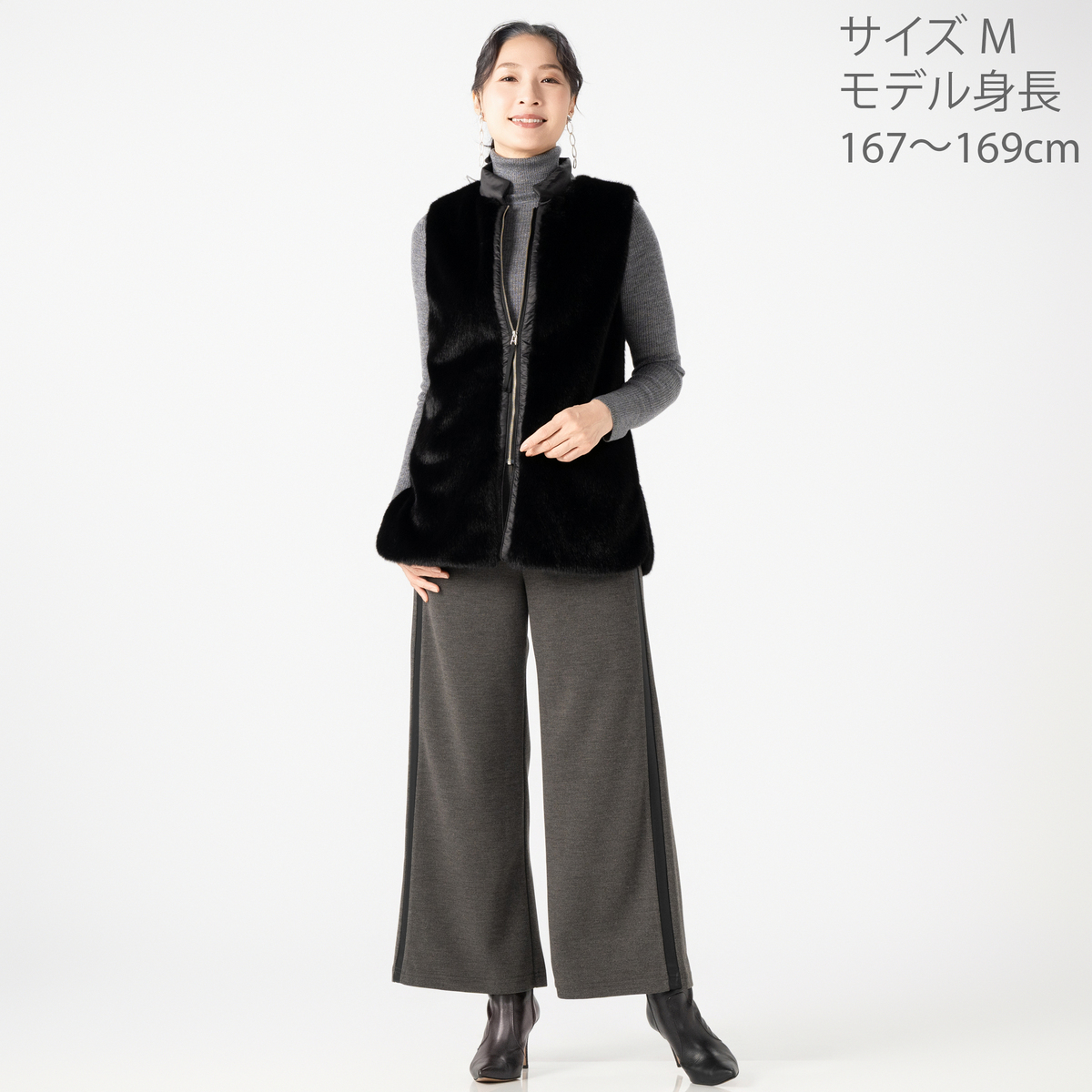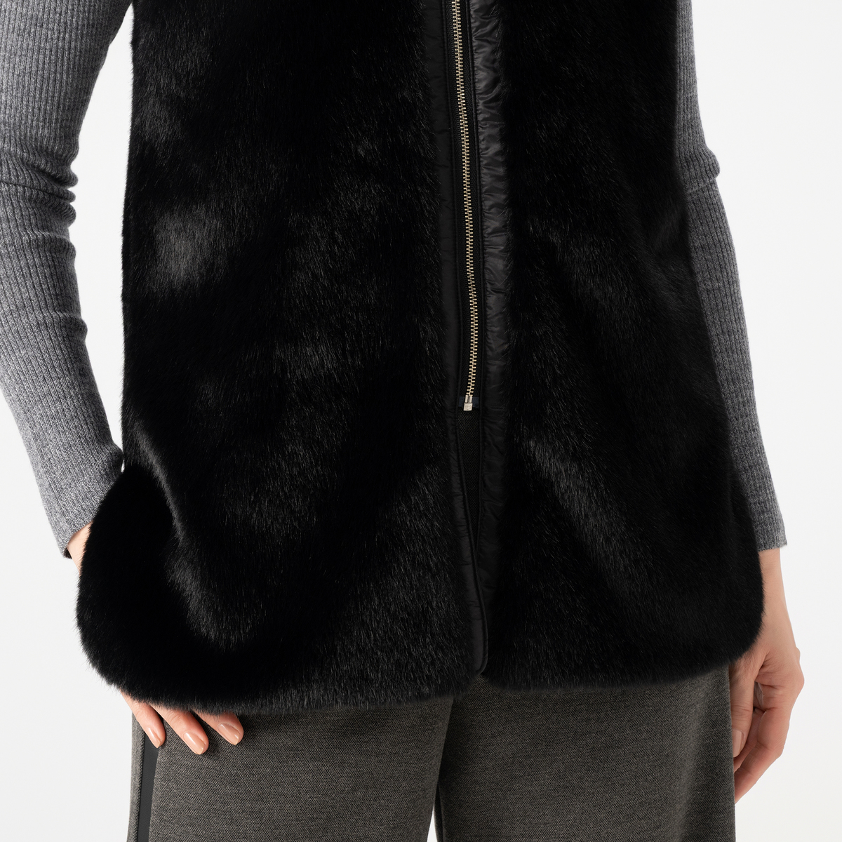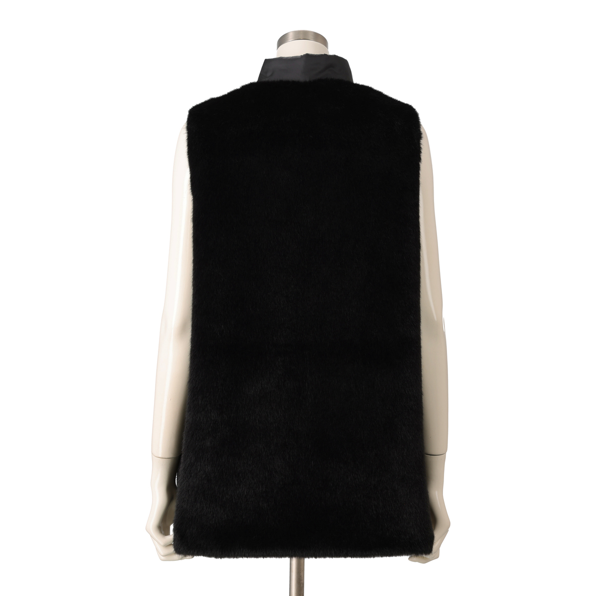 異素材使いが魅力のフェイクファージレ。ふんわりとしたフェイクファーが装いにと華やかさをプラスします