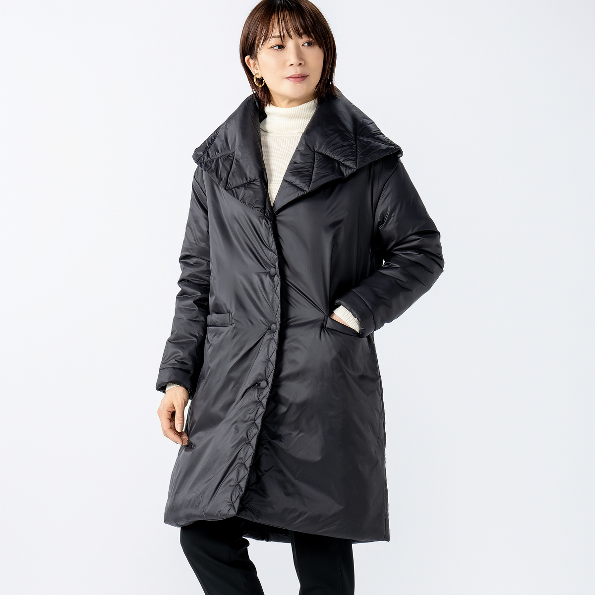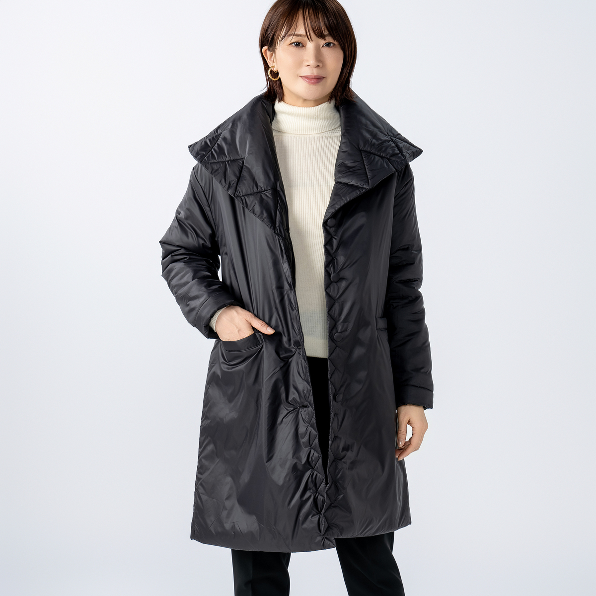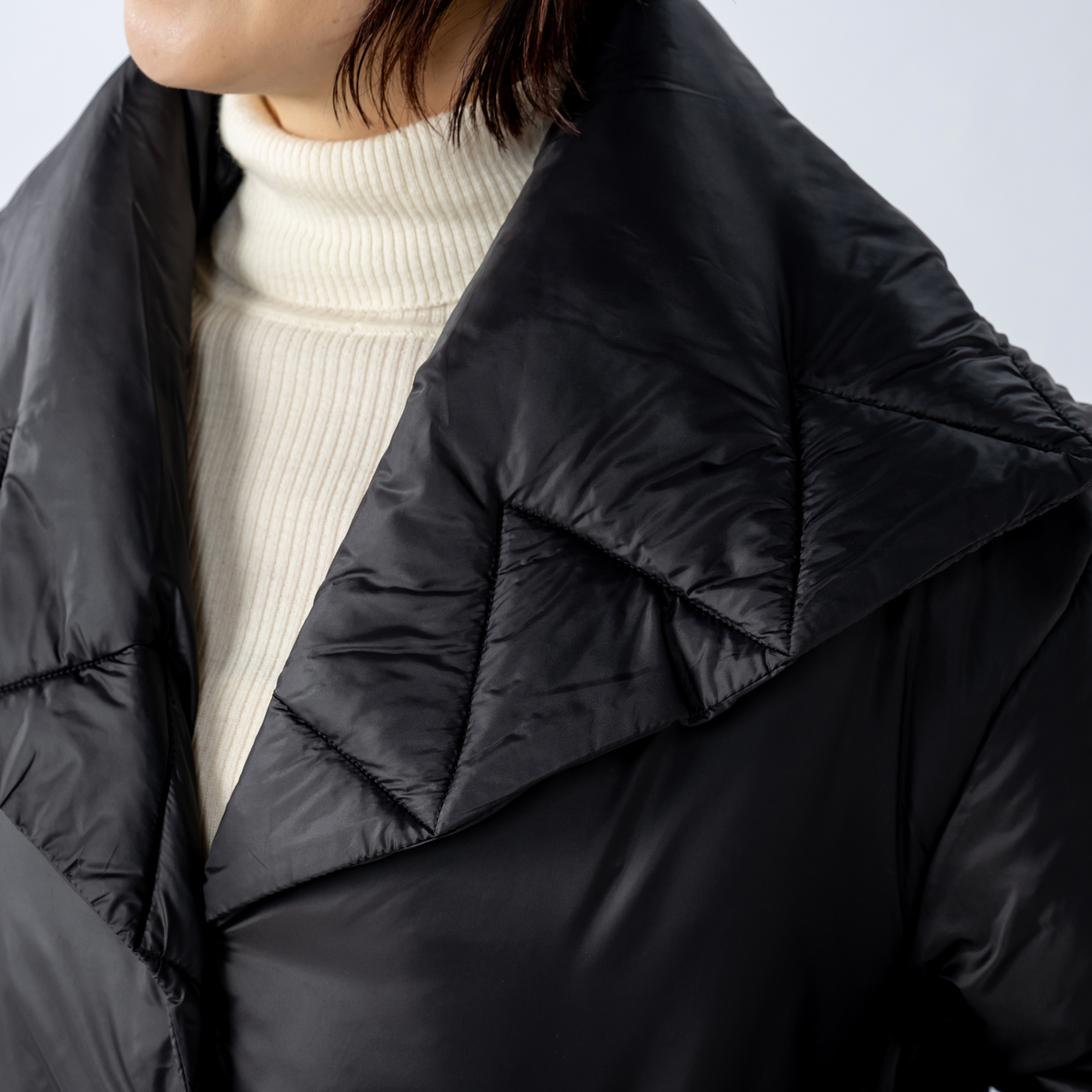 吸湿発熱性のある中綿を使用。大きめの衿で小顔効果も期待。ショールカラーが程よいボリュームを与え、スタイリングの主役として活躍します