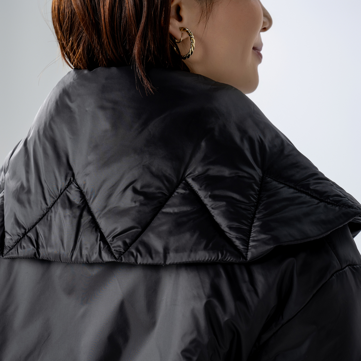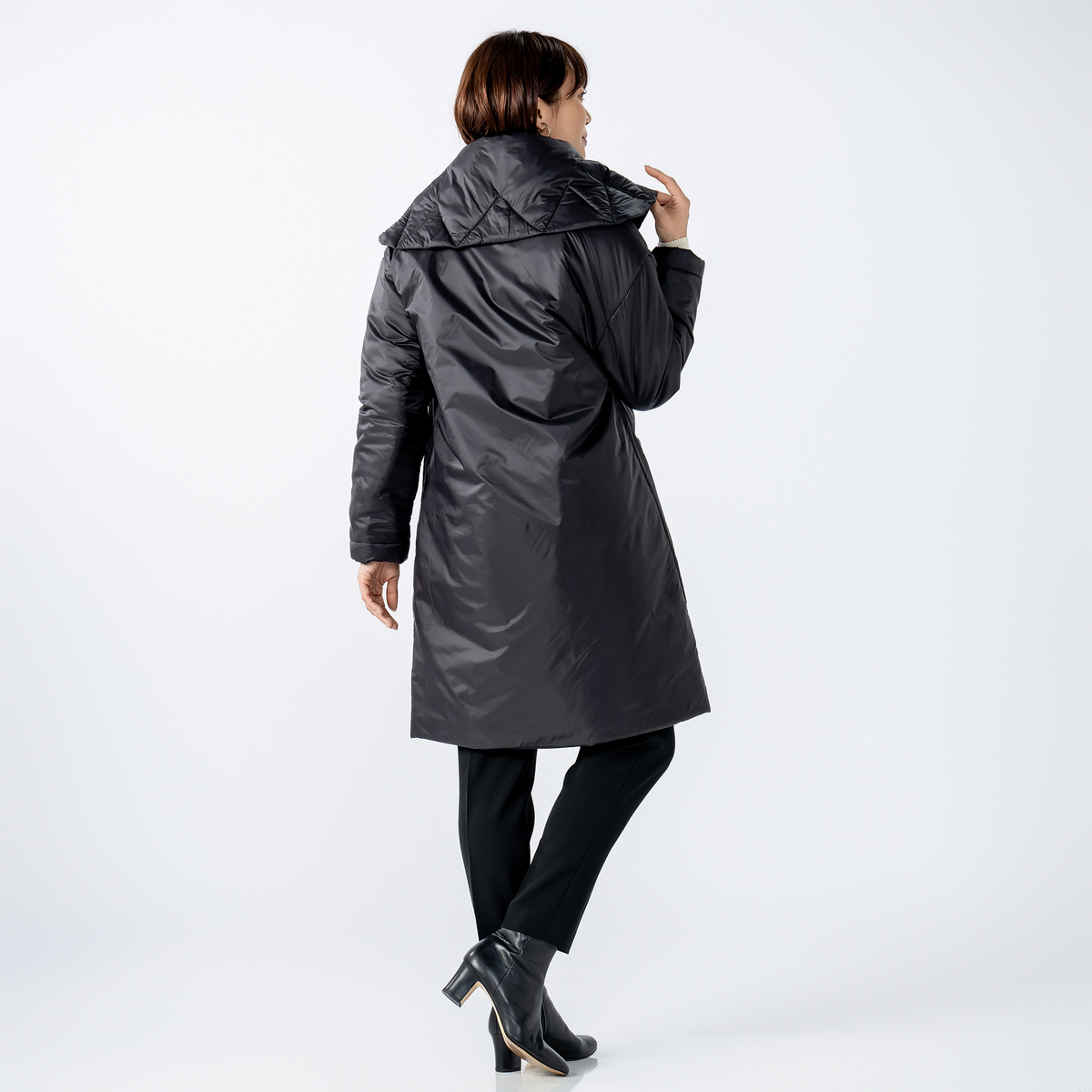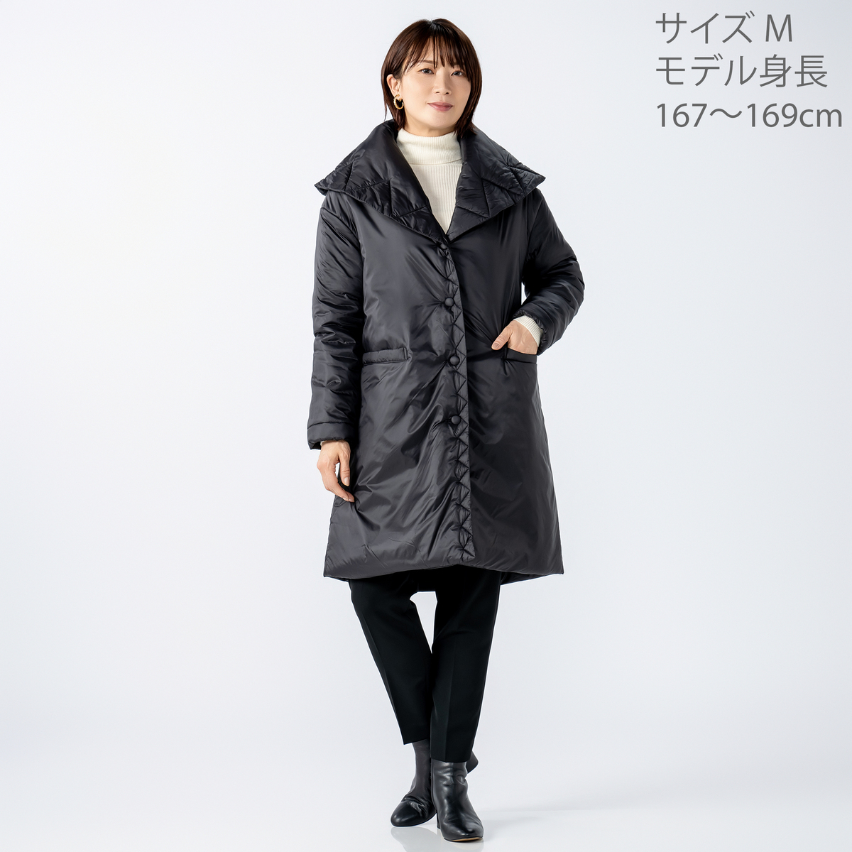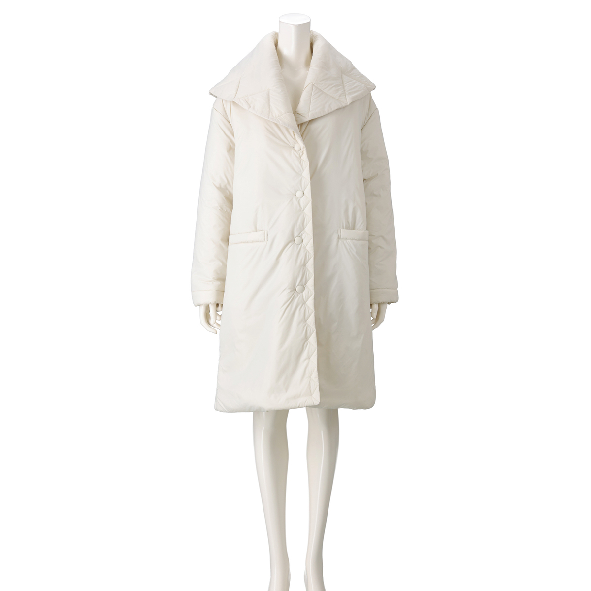 吸湿発熱性のある中綿を使用。大きめの衿で小顔効果も期待。ショールカラーが程よいボリュームを与え、スタイリングの主役として活躍します
