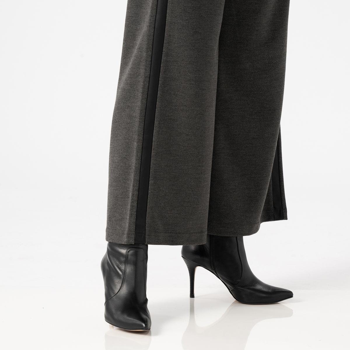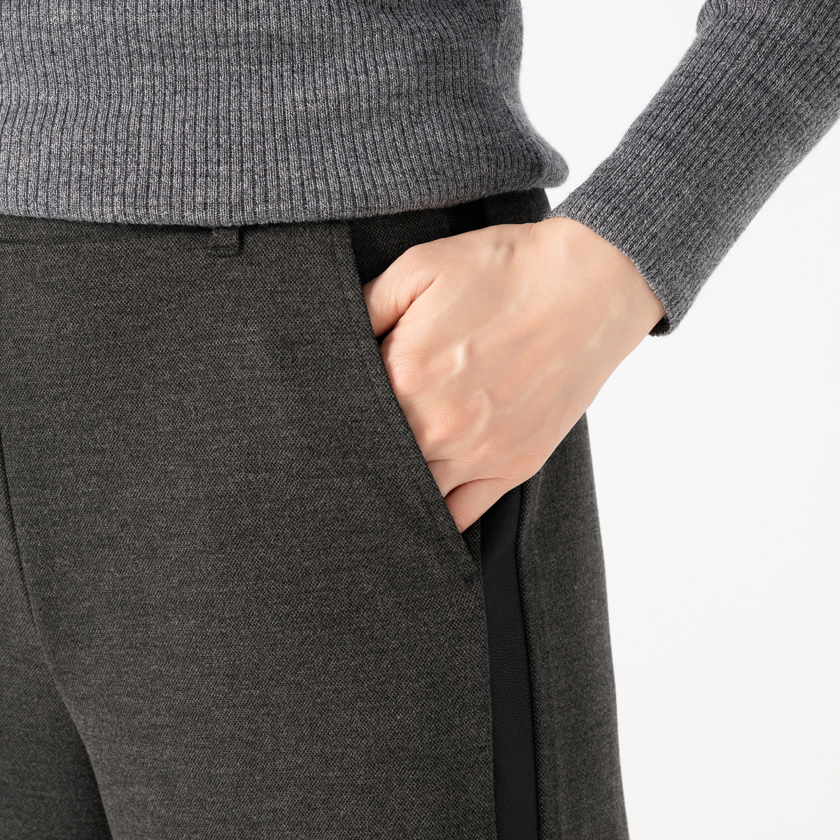 合皮のサイドラインがアクセントに。シルエットのきれいなストレートワイドパンツです