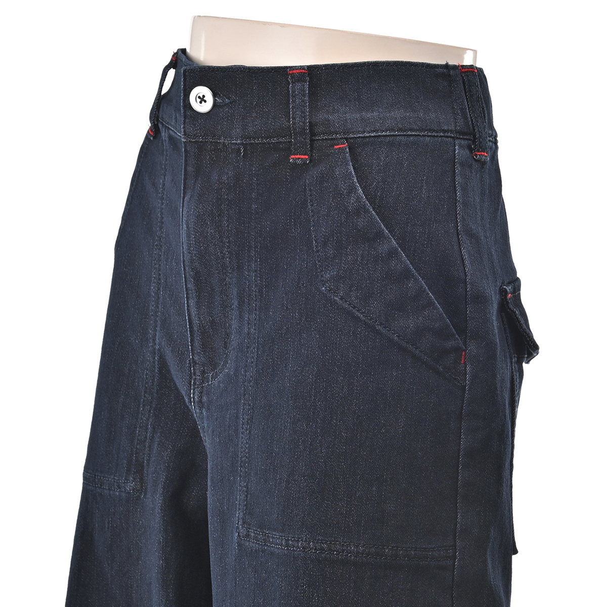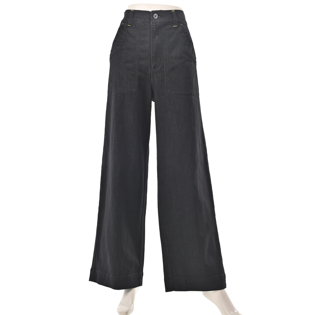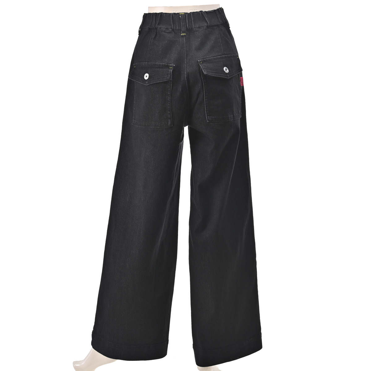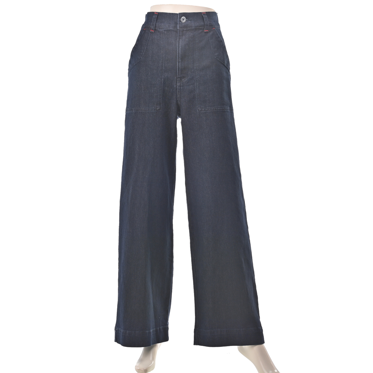 スタイルアップが叶う、ワイドシルエットのデニムパンツ。フロント部分の大きめポケットが、デザインのアクセントになっています