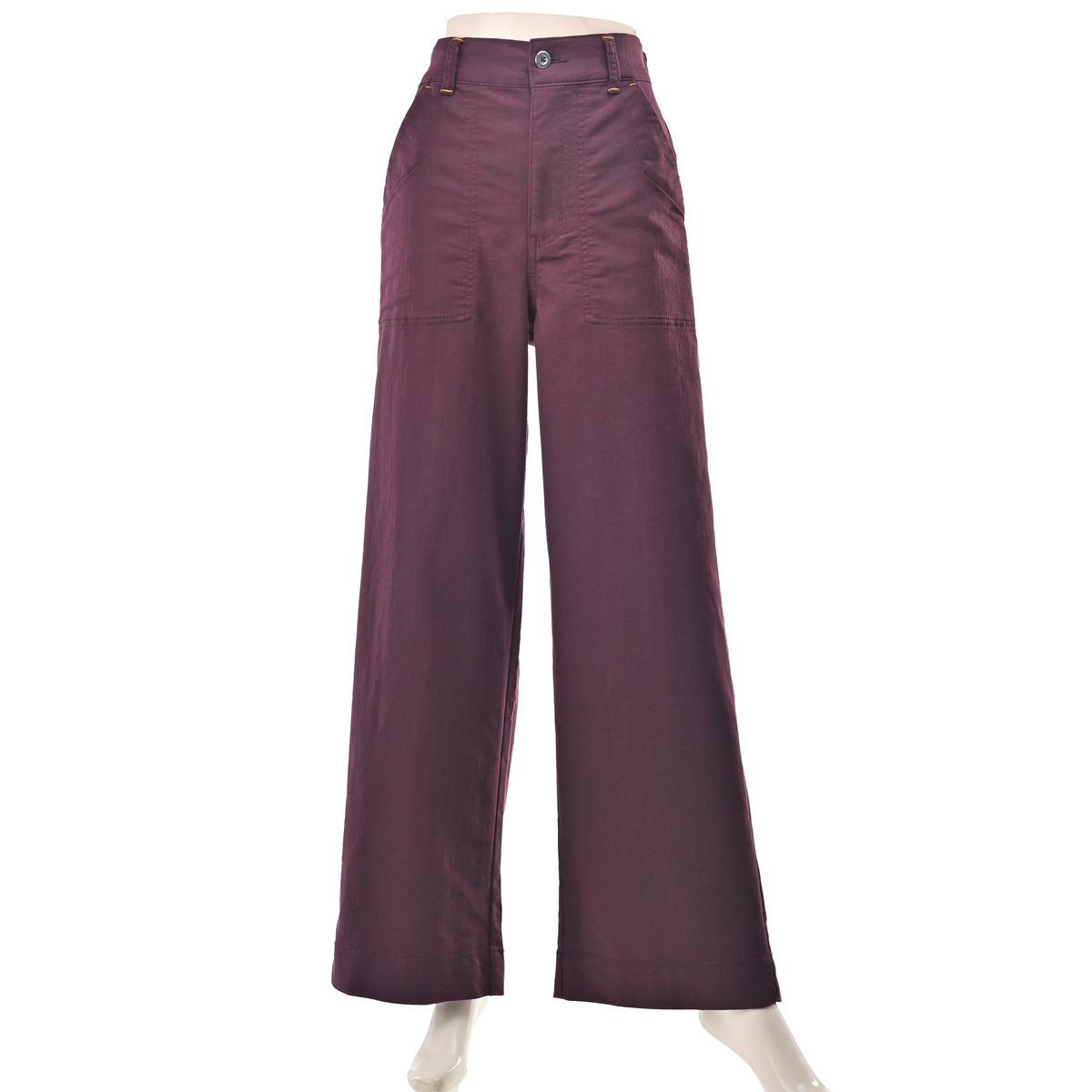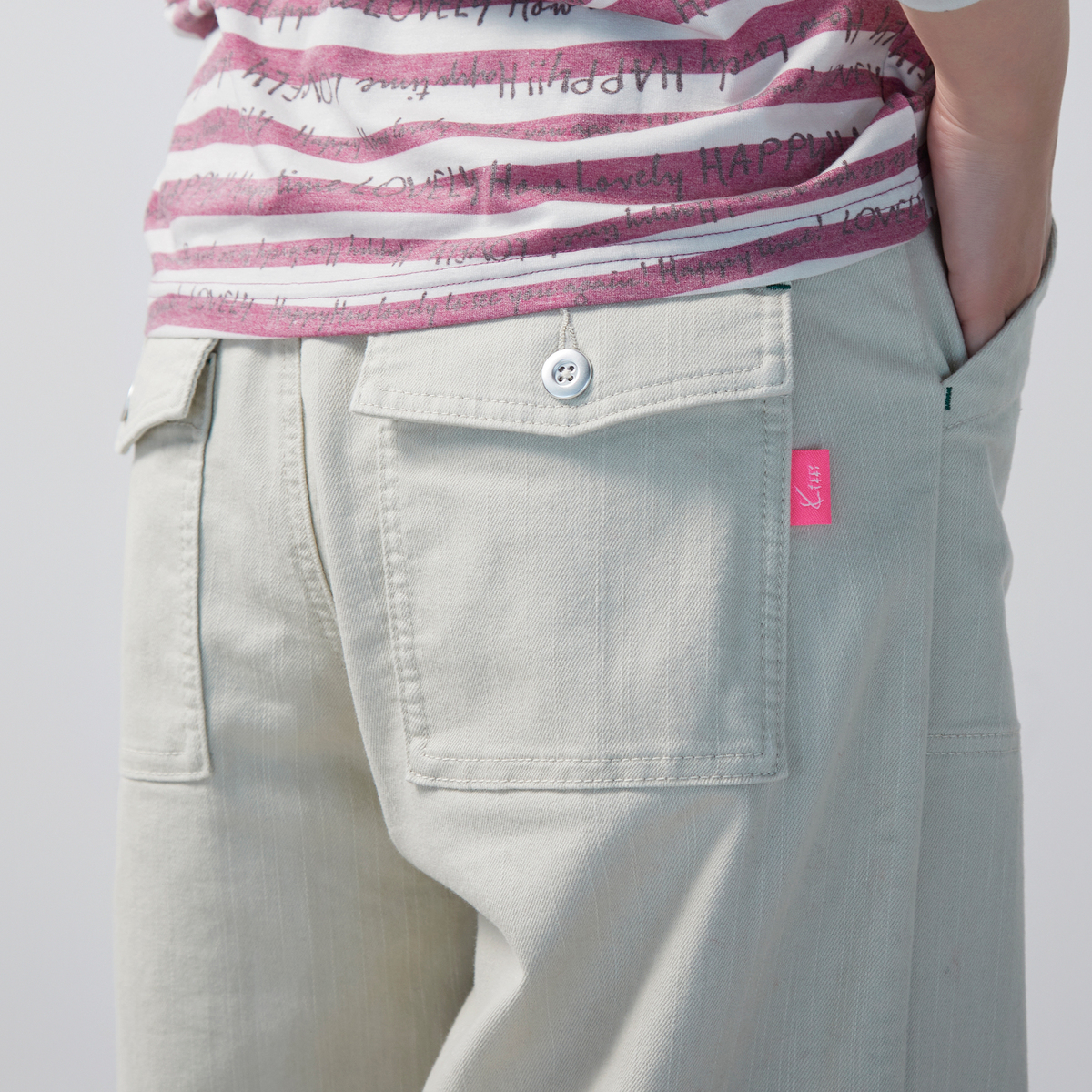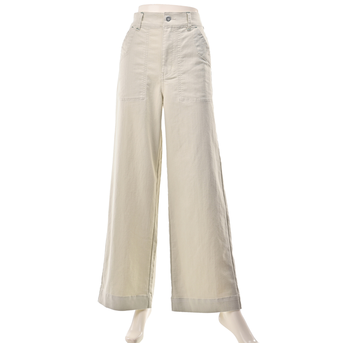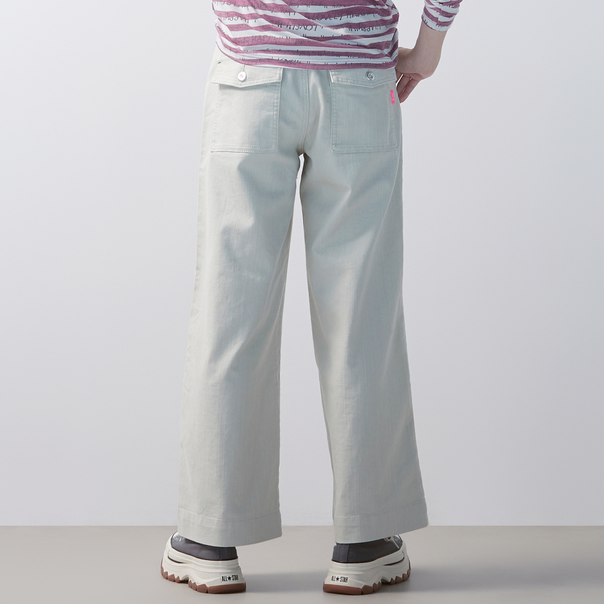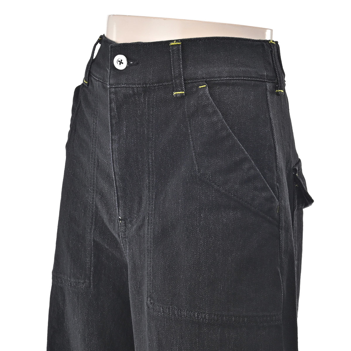 スタイルアップが叶う、ワイドシルエットのデニムパンツ。フロント部分の大きめポケットが、デザインのアクセントになっています