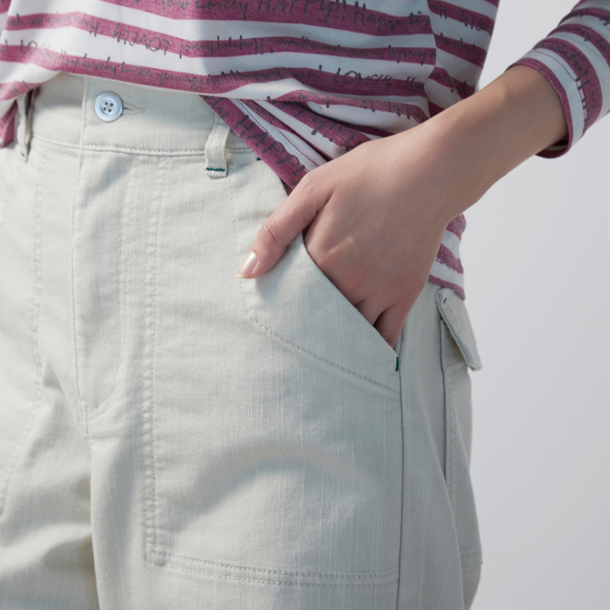 キッキのパンツの軽快さはよく知られたところですが、長身の私には寸足らずのことが多くこれまで購入の機会に恵まれませんでした。しかし今回男性ゲストさんがLL着用で違和感なく着こなしていることから、インディゴとオイスターのLLを購入しました。 オイスターは第一印象があれっ?という感じ。チノパンをイメージしていたら予想より薄手でよく見るとシマが入ったような織り。確かに柔らかく履き心地は悪くないが、肝心の丈がやはり足りない。測るとサイズ記載通り73センチなのでこれは私側の都合により返品です。インディゴは履くと何故かさっきより長く感じる。色味が濃いせいかしら?と測ってみたら74センチ強。1センチは誤差の範囲だし、私にとっては嬉しいことだから問題無し! 不思議とこの1センチが大きくて、こちらはとても気に入りましたが裾の縫製がいただけなかった。まつりが数回折り返して縫われた箇所があり糸がループ状に飛び出しています。引っ張って切ろうかとも思ったけどそこからほつれたら困るし、信頼していただけにショックで…。気に入った品ですが売り切れで交換不可。オイスターも仔細に見たら裾の縫製にちょっと怪しいところが。量販店とは異なる素材の良さ、縫製の確かさに信頼を置いていただけに今回のパンツは残念でなりません。しっかりした縫製ならヘビロテになったはず。悩みましたがインディゴも返品します。この手のパンツ、大好きなので次回に期待します。
