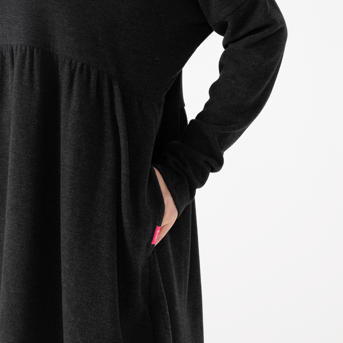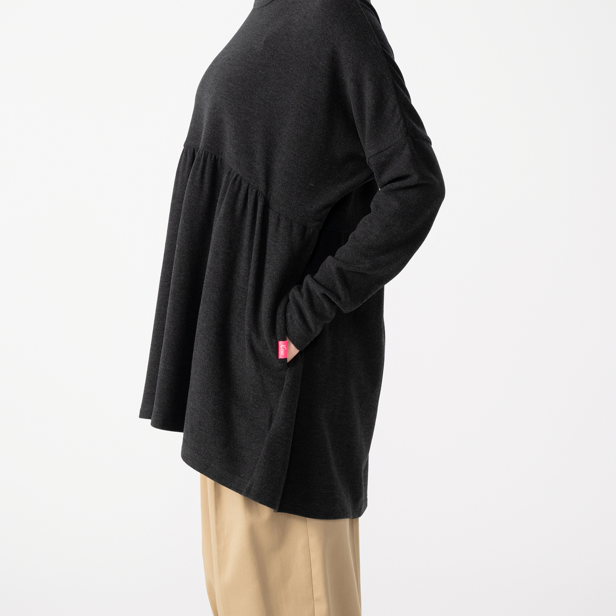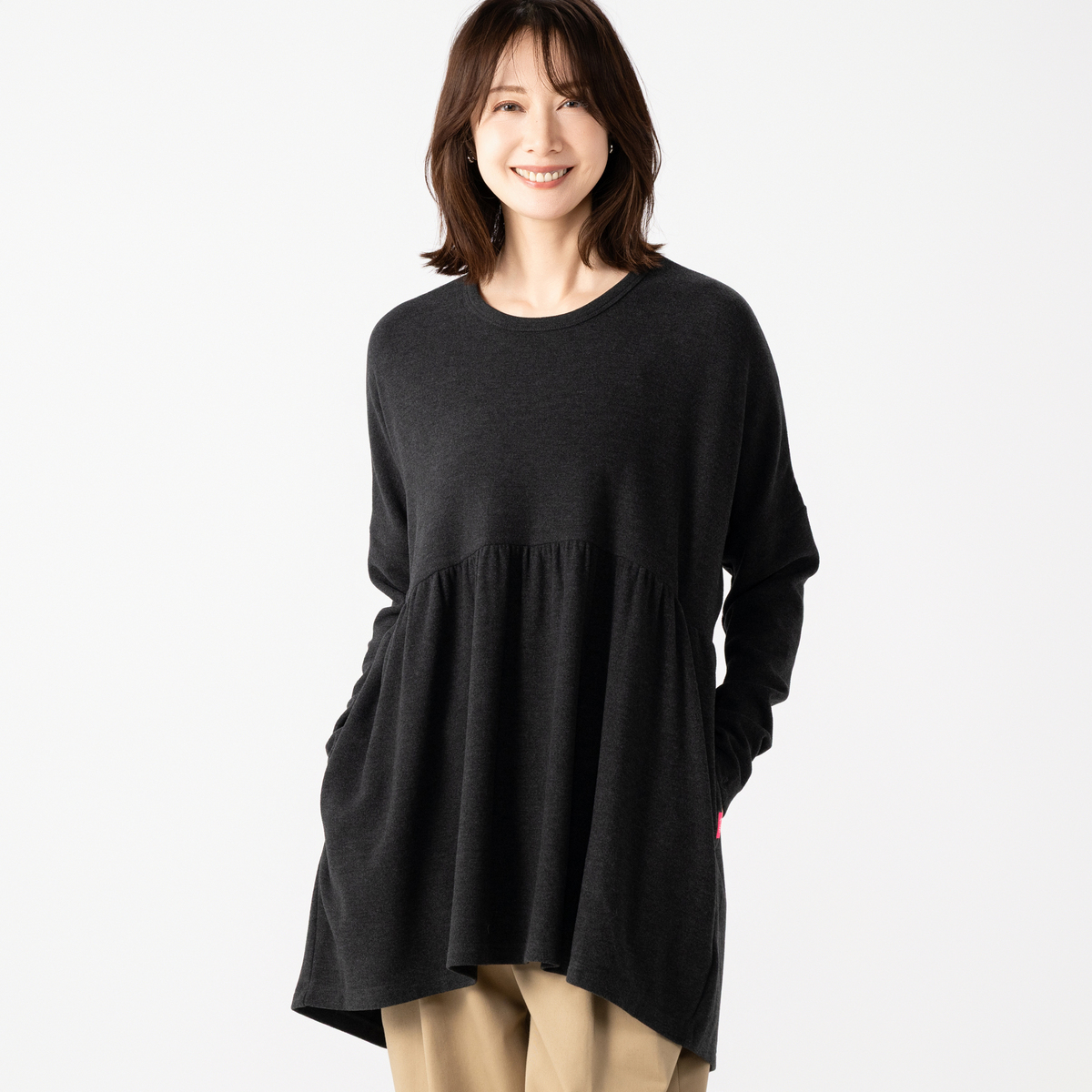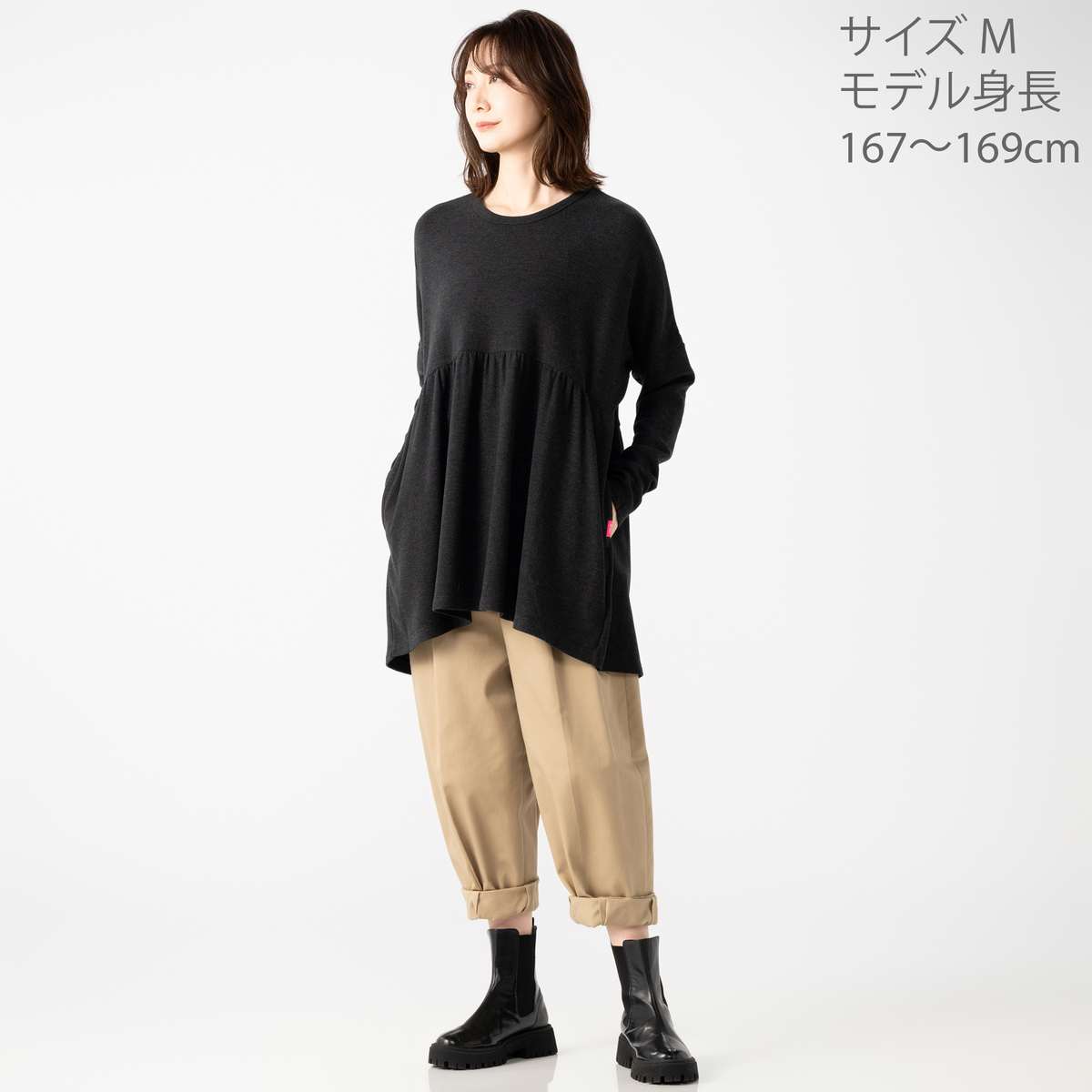 着心地よく肌触りのよい生地を使用。ウエスト部分のギャザー切替えで、スタイルアップを叶えます