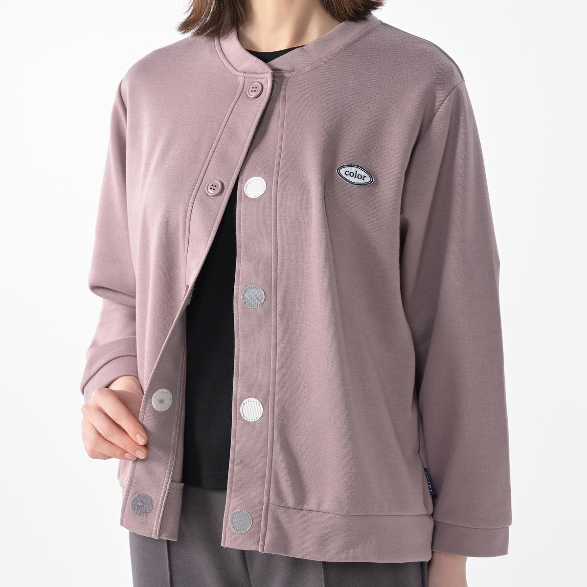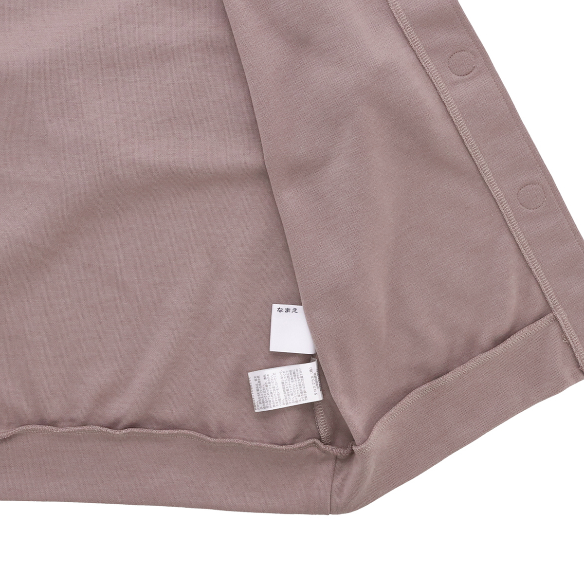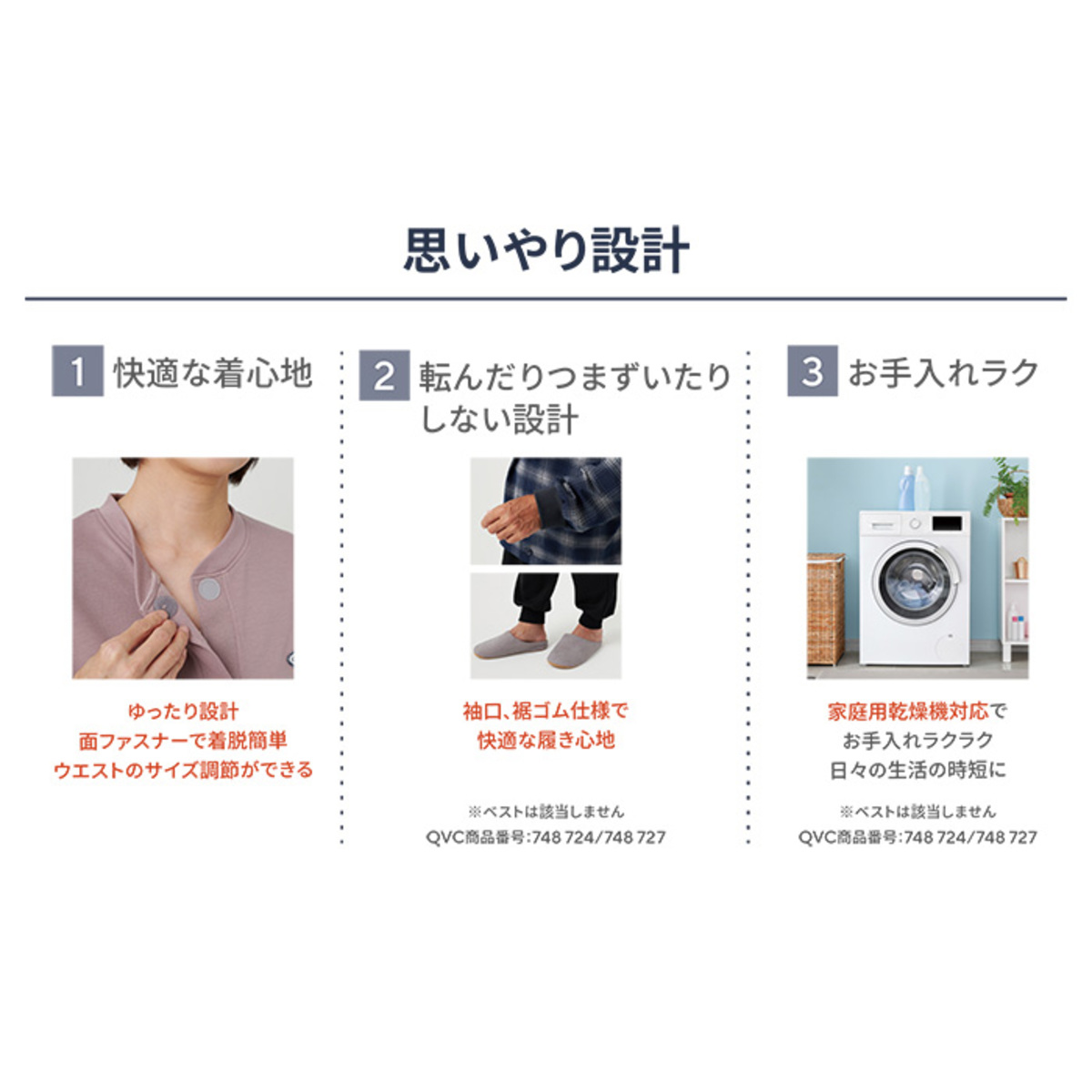トップスはゆったりとしたシルエットで締め付け感を感じにくく、アームホールも広めで腕が通しやすい設計。前開きは面ファスナー仕様で着脱しやすく、付け間違いを防ぐため面ファスナーには交互に色が付いています