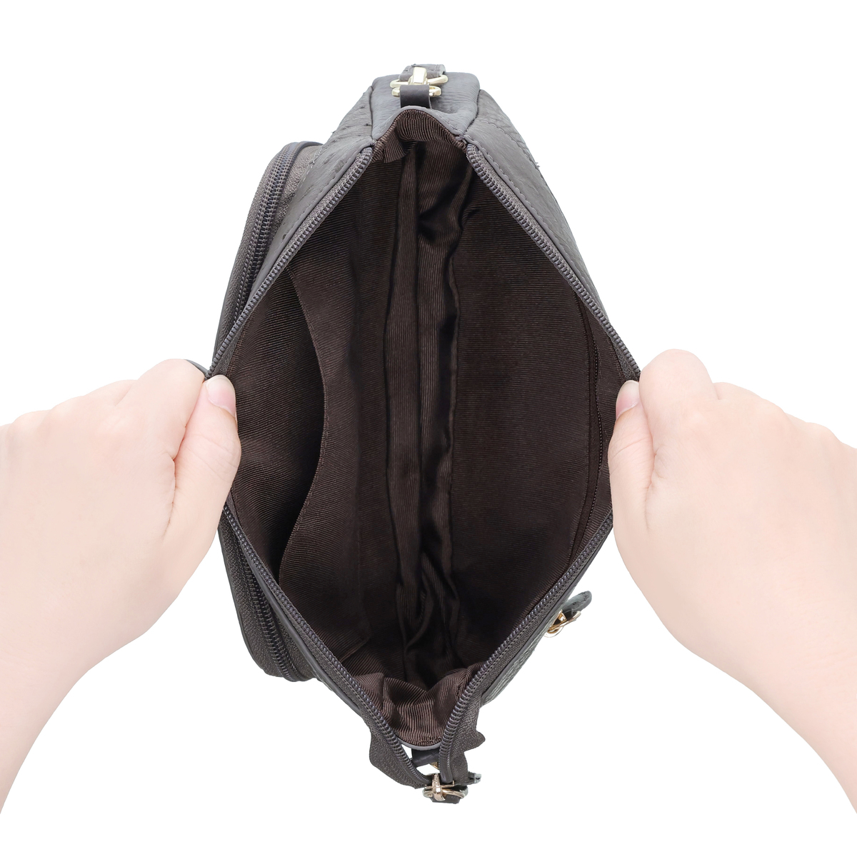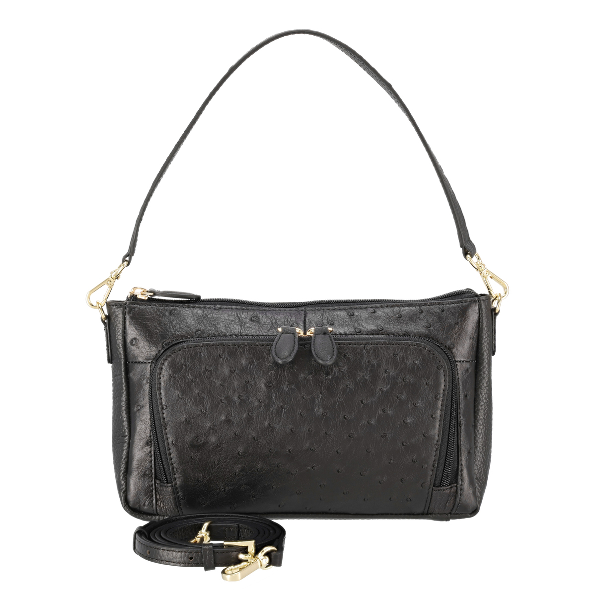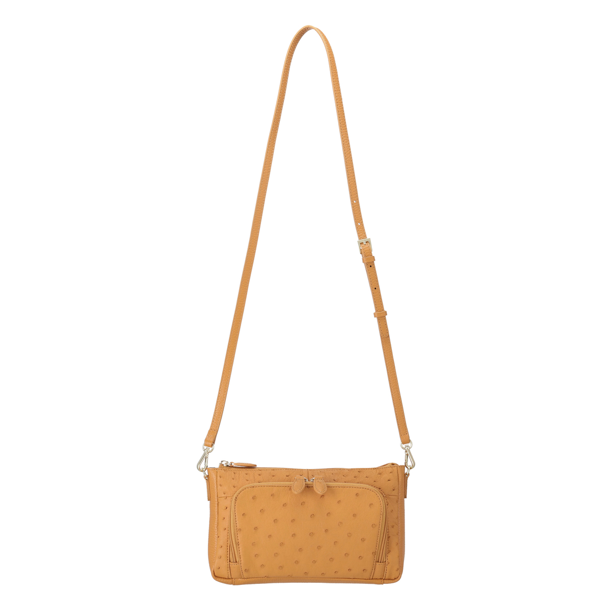 [サイズ(約)] 縦14×横24×マチ4.5cm ハンドル立ち上がり:18cm ショルダー立ち上がり:54〜60cm [重量(約)]※付属品含む 280g [素材] オーストリッチ革、牛革 ※裏地有 [仕様] 付属(取り外し可):ショルダーベルト×1 ハンドル×1 開閉:ファスナー式 底ビョウ:無 [ポケット] 内側:オープンポケット×1 ファスナーポケットx1 外側:ファスナーポケットx2 【ベトナム製】