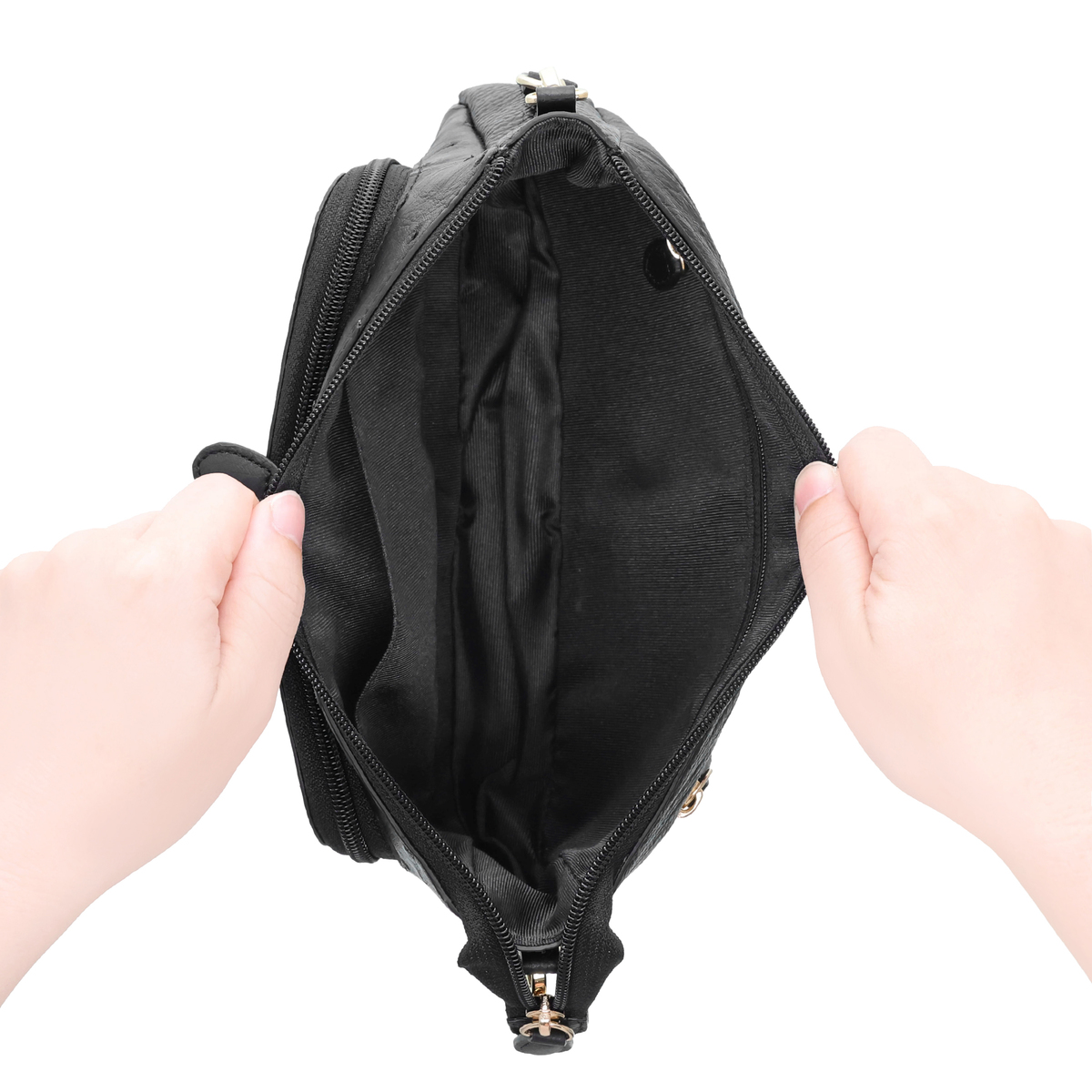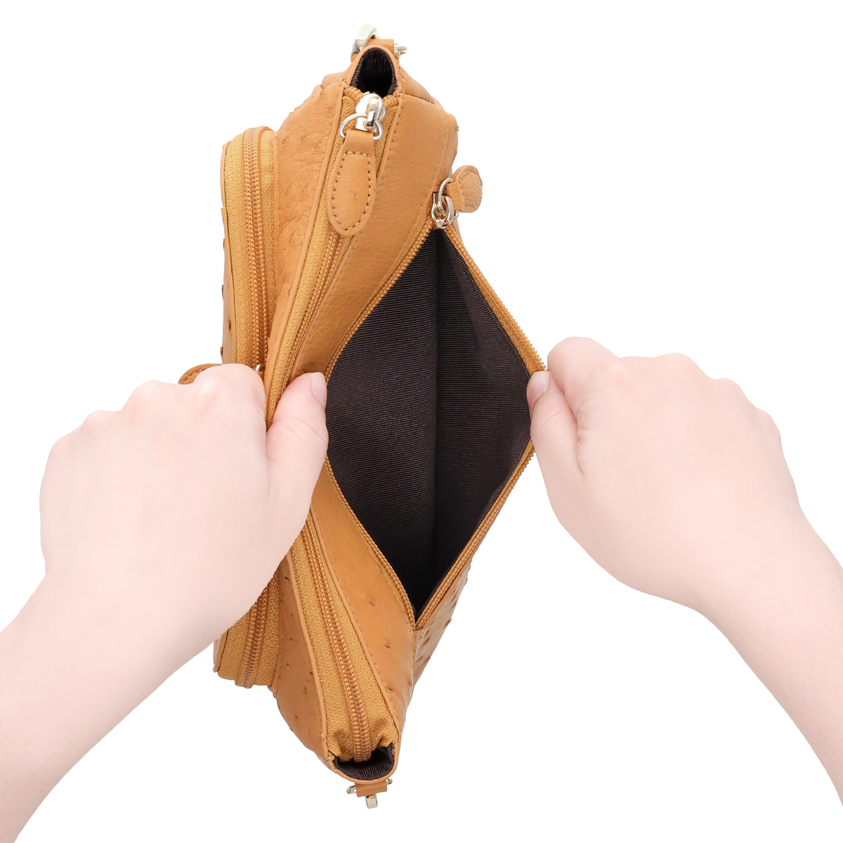 開閉には大きく口開きしてくれる、柔らかな鞣しのオーストリッチ革を使用。メインポケットは長財布もしっかりと入るサイズ感。また前面にもポケット付きで、スマートフォンなどを入れておくのに便利です