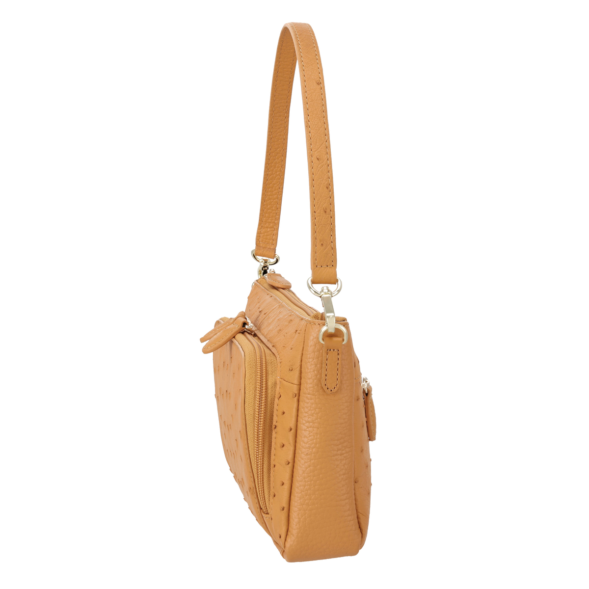 表面、背面にオーストリッチ革を使用した、2WAYハンドバッグ。側面や底面、付属のショルダーには牛革を使用した、フルレザー仕立てです。斜め掛けや肩掛け、手持ちした時それぞれに素敵に見えるバランスにこだわっています