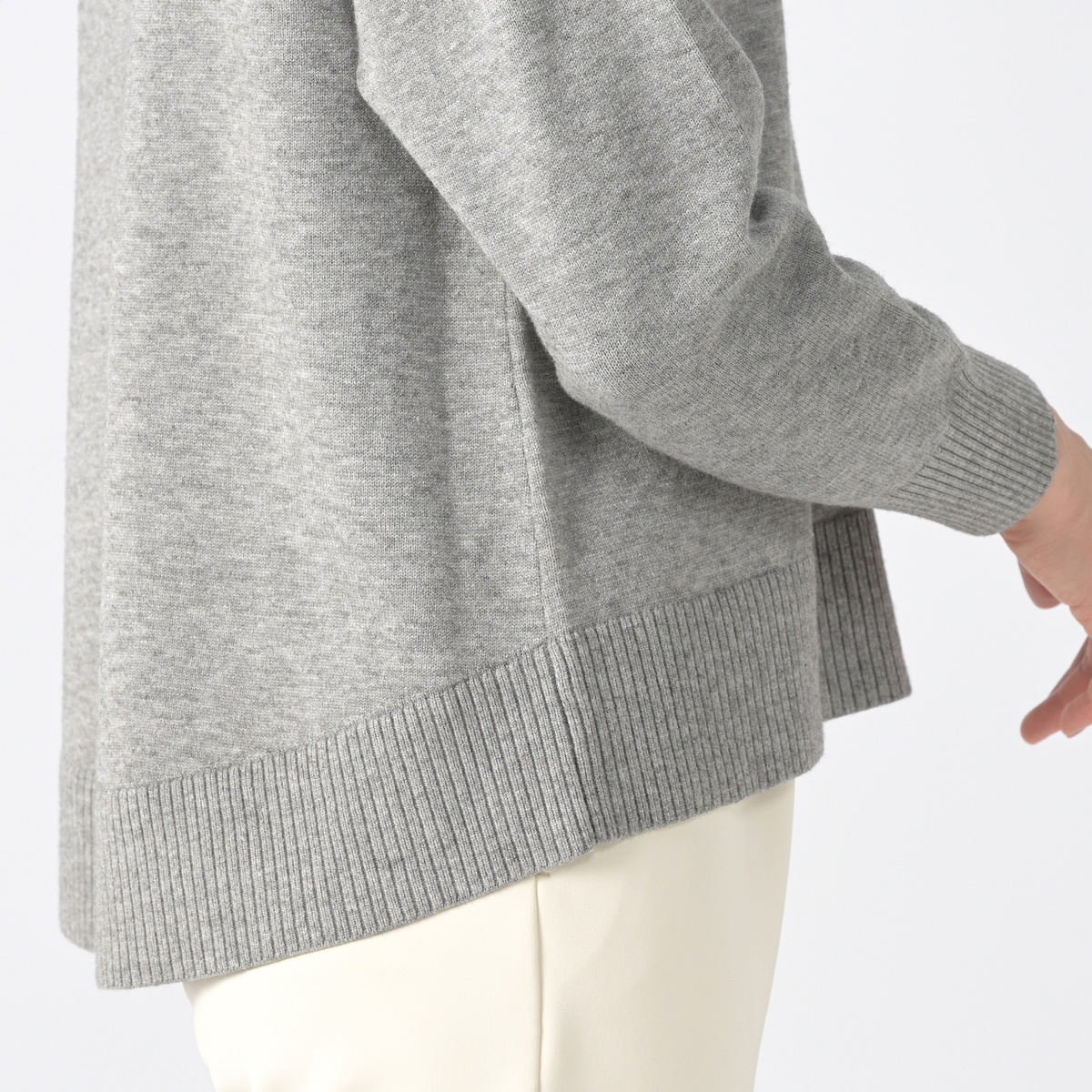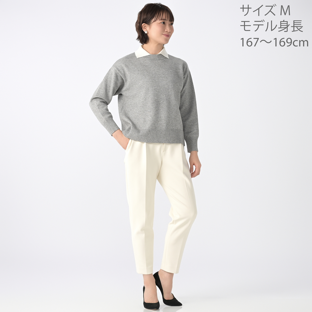 やわらかくなめらかで心地よい肌触りの素材を使用。身幅はゆったりのAライン。後ろの丈が長く腰回りをカバー。肩の切替えが二の腕あたりにくるため、肩幅や腕のラインを自然にカバーしてくれます