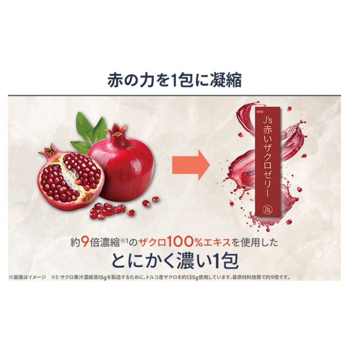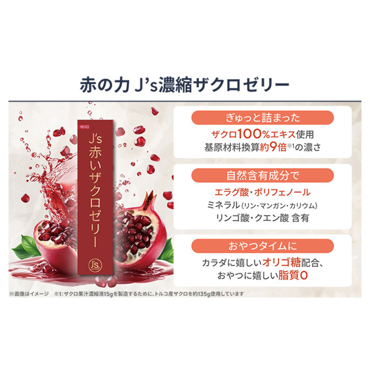 ザクロ果汁濃縮液、ハイビスカスエキス、オリゴ糖を配合したザクロゼリー。トルコ産のザクロを圧搾して製造したザクロ果汁濃縮液を原料として配合しています