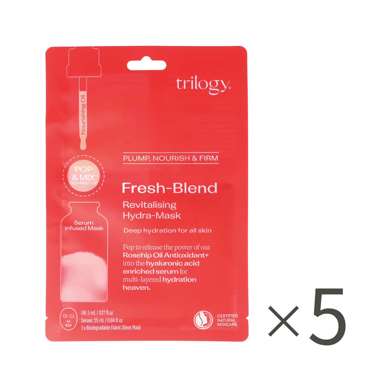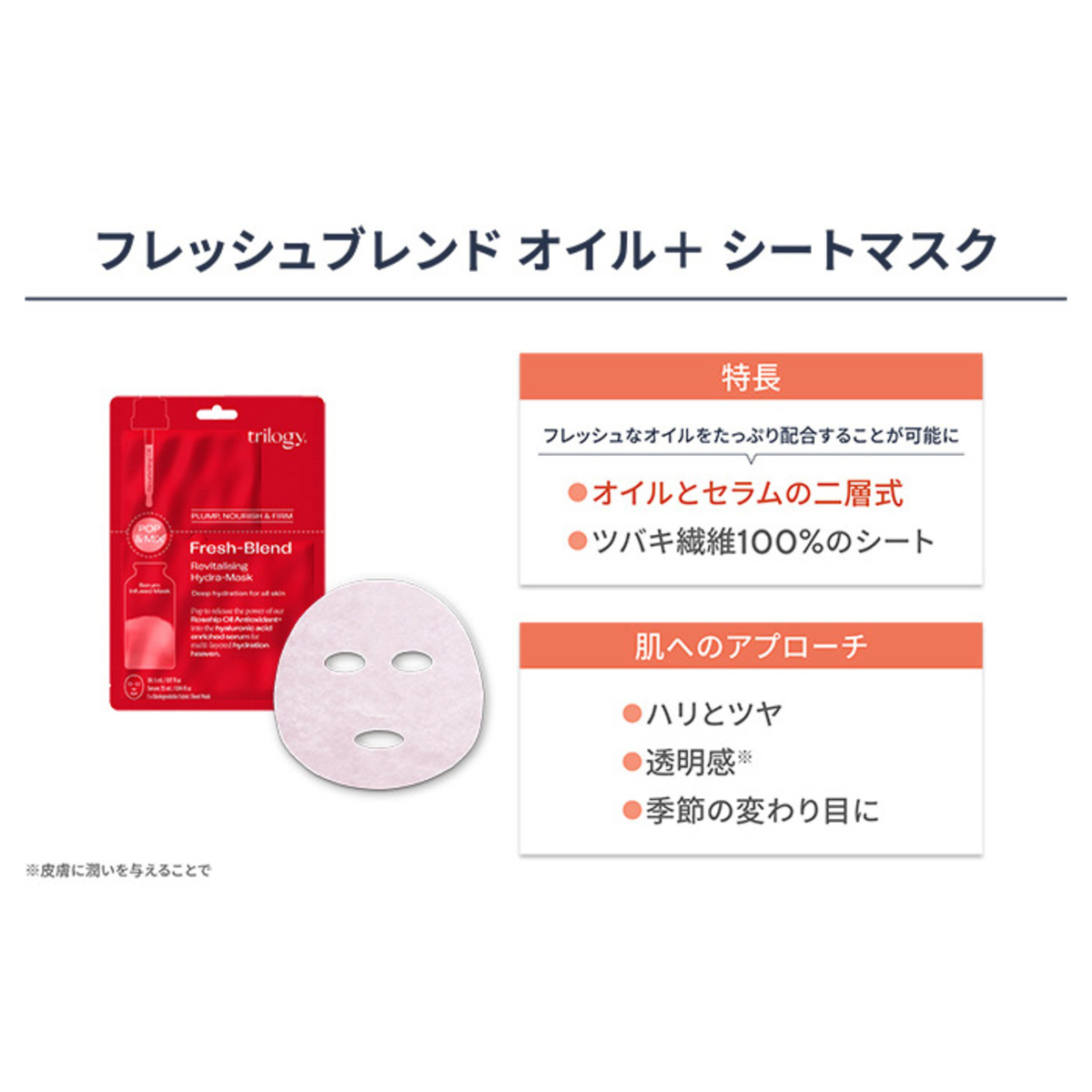 [セット内容] トリロジー フレッシュブレンドオイル+ シートマスク ×5 [使用方法] 1.パウチの上部を下に向かって折りたたみながら、上段のオイル層をプチッと押し込み、下段のセラム層と混ぜ合わせます 2.オイル層とセラム層が混ざるよう、約1分ほどパウチをしっかりと揉み込みます 3.パウチの下部を破り、マスクを取り出して広げます。洗顔後の清潔な肌にお使いください。目と口の位置を合わせて、お顔全体に密着させます 4.15〜20分ほど置いて、マスクをはずします。残ったセラムをやさしく肌になじませます。その後、お好みの美容液や保湿クリームをお使いください [注意事項] ※肌に異常が生じていないかよく注意して使用してください。肌に合わないときは、ご使用をおやめください ※使用中、又は使用後旦光にあたって、赤味、はれ、かゆみ、刺激、色抜け(白斑等)や黒ずみ等の異常が現れた場合は直ちに使用を中止し、医師にご相談ください。そのまま化粧品類の使用を続けますと症状が悪化することがあります ※傷やはれもの、しっしん等、異常のある部位にはお使いにならないでください ※目に入らないようご注意ください。目に入った場合は、こすらずにすぐに洗い流してください。その後、目に異物感など異常が残る場合は、眼科専門医へご相談ください ※乳幼児の手の届く場所、直射日光のあたる場所や極端に高温になる場所には置かないでください ※本品は食用ではありません ※本品は水に溶けませんので、下水等に流さないでください ※衛生上、一度お使いになったマスクはくり返し使用しないでください ※開封後はお早めにご使用ください 【ニュージーランド製】 [成分] 水、ホホバ種子油、アロエベラ液汁、カニナバラ種子油、グリセリン、プロパンジオール、スクワラン、ペンチレングリコール、ツバキ種子油、ベンジルアルコール、β-グルカン、ペクチン、ヤシ油脂肪酸ポリグリセリル-3、カプリン酸ポリグリセリル-4、カプリル酸ポリグリセリル-6、リシノレイン酸ポリグリセリル-6、トリ(カプリル酸/カプリン酸)グリセリル、カエサルピニアスピノサガム、アサイヤシ果実油、 ヒアルロン酸Na(小麦由来)、ヒポファエラムノイデス果実油、クエン酸Na、カラスムギ穀粒エキス、デヒドロ酢酸、ヒマワリ種子油、酢酸トコフェロール、トマト種子油、クランベリー種子油、加水分解アルギン、クエン酸、香料、ソルビン酸K、安息香酸Na、海水、クロレラエキス、リコピン、トコフェロール、ローズマリー葉エキス