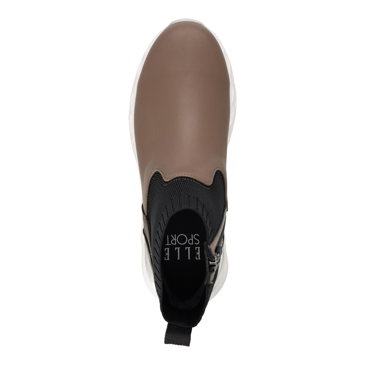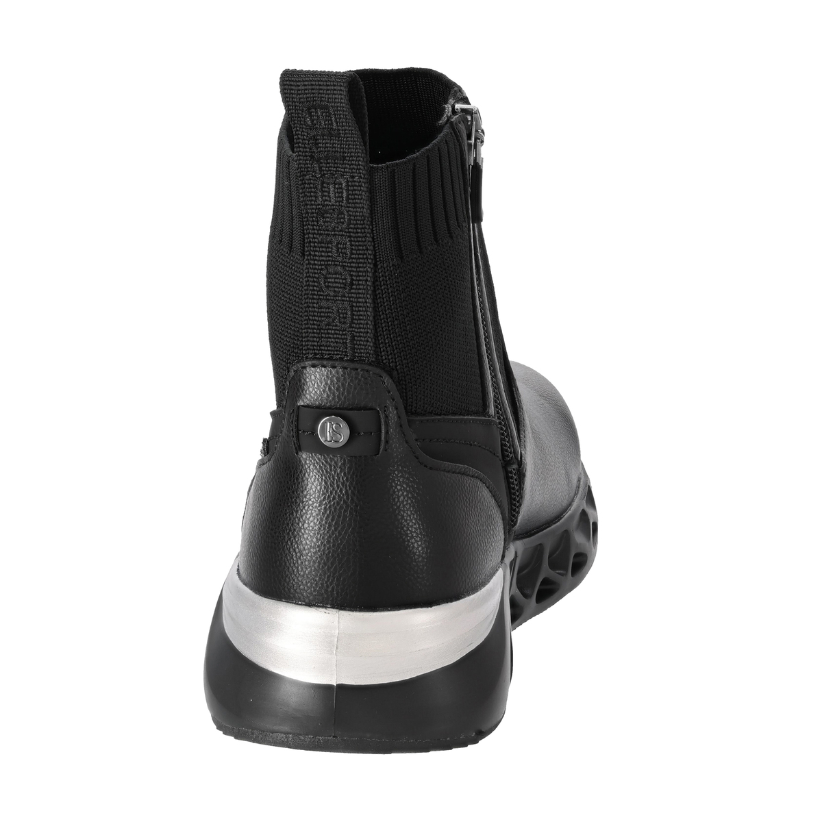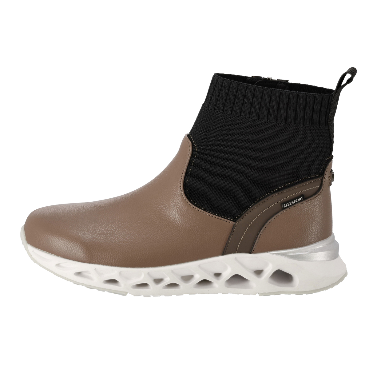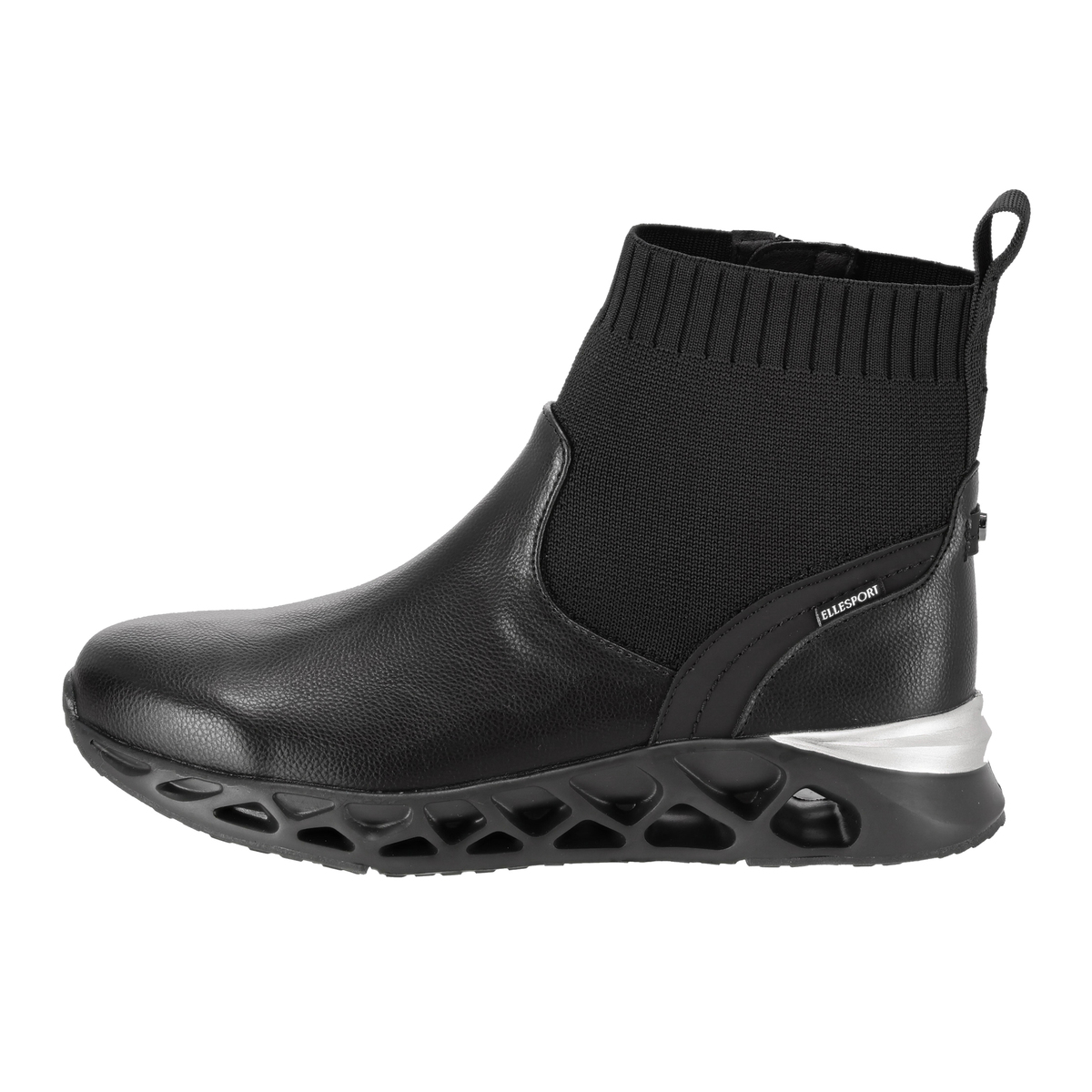 プルストラップにELLESPORTのロゴ刺繍を施したショートブーツ。高級感のあるスポーティーなデザインで、アッパーにはシボ感のある合皮素材を使い、キズが目立ちにくい仕上がりです。アッパー底周り部分のPUには撥水処理を施しています