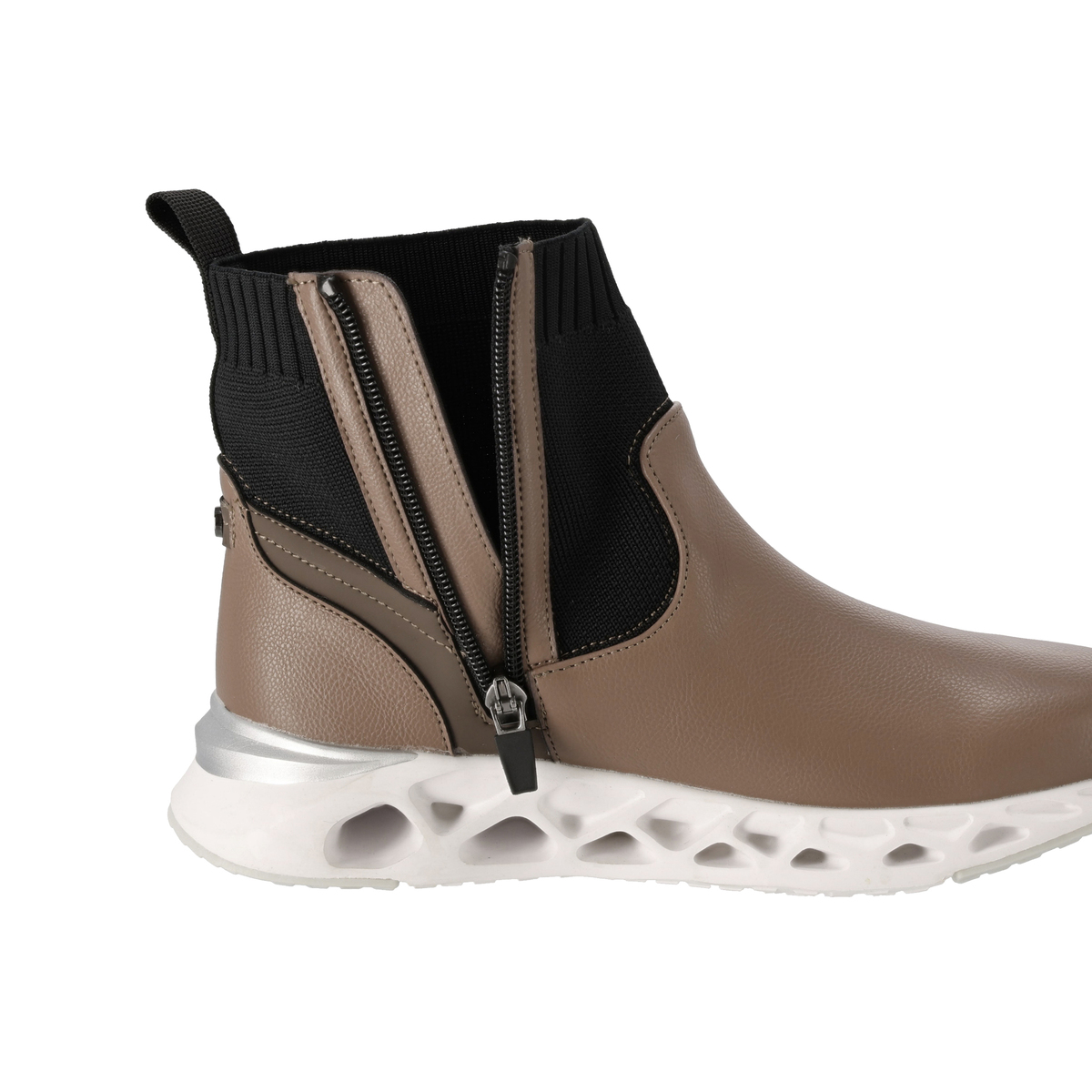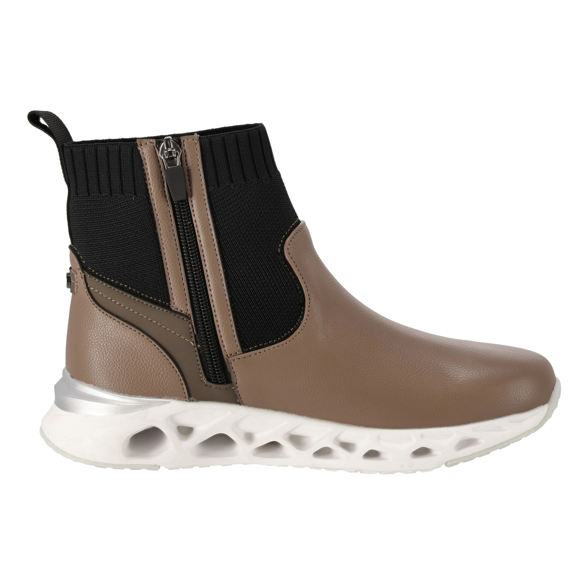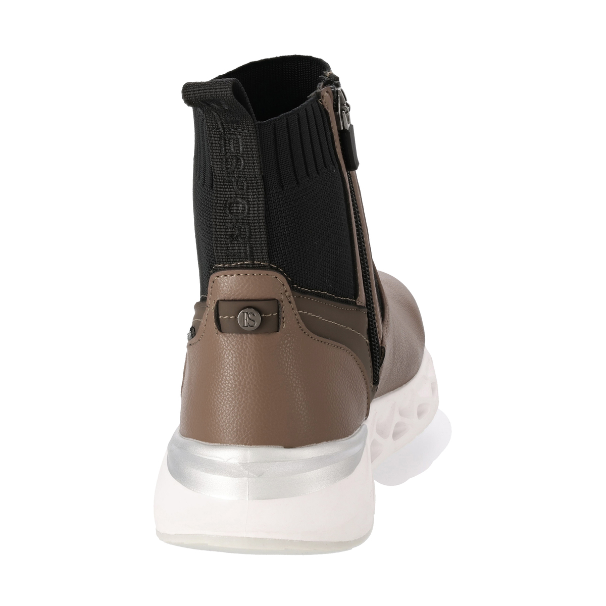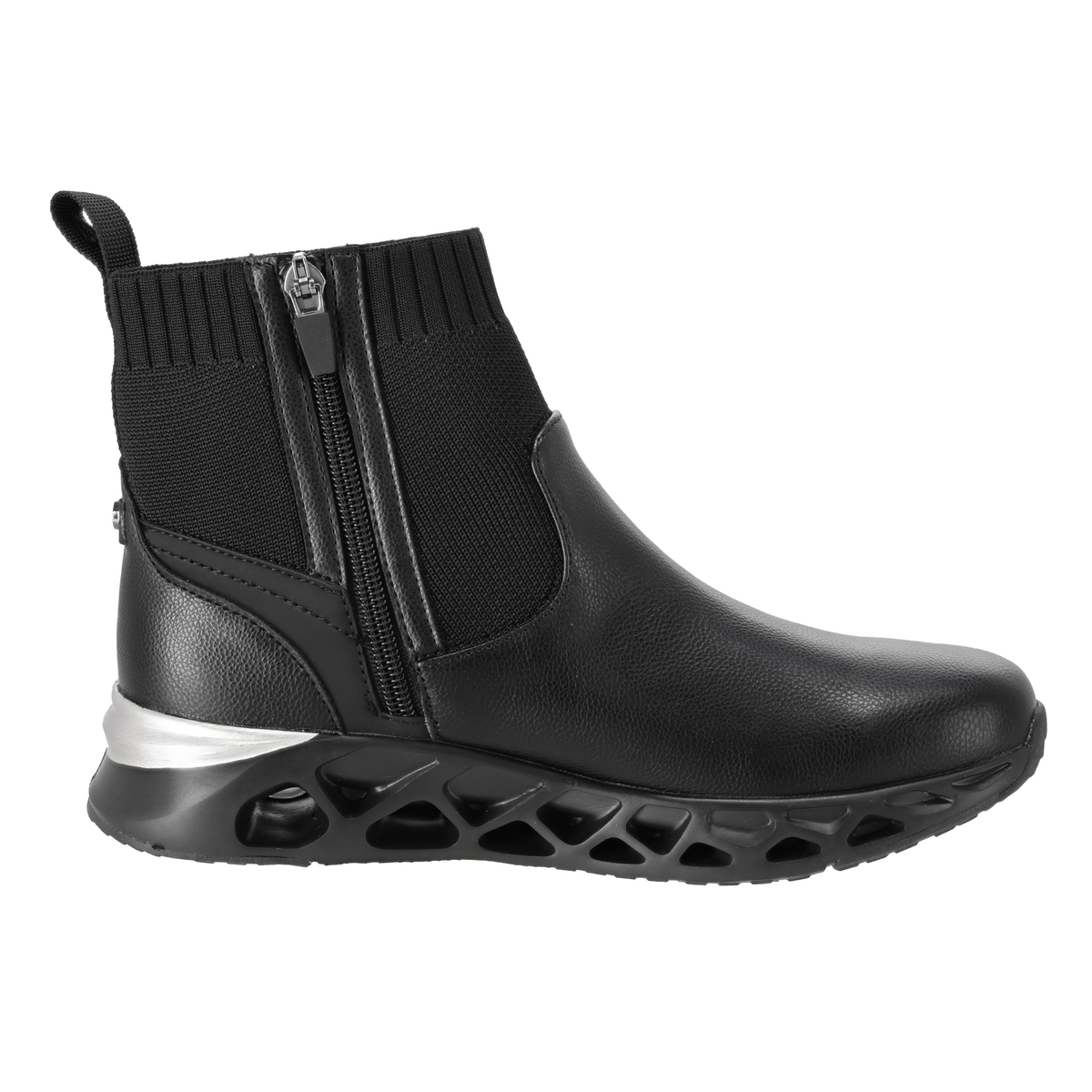 プルストラップにELLESPORTのロゴ刺繍を施したショートブーツ。高級感のあるスポーティーなデザインで、アッパーにはシボ感のある合皮素材を使い、キズが目立ちにくい仕上がりです。アッパー底周り部分のPUには撥水処理を施しています